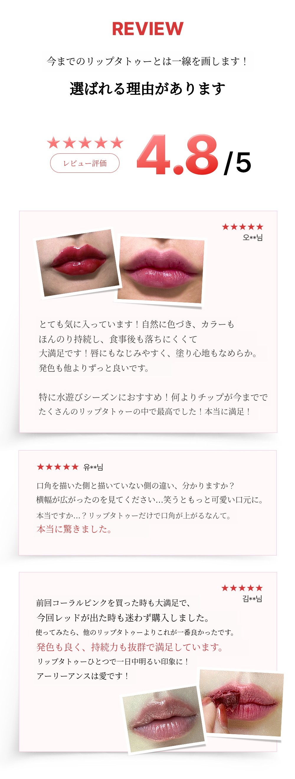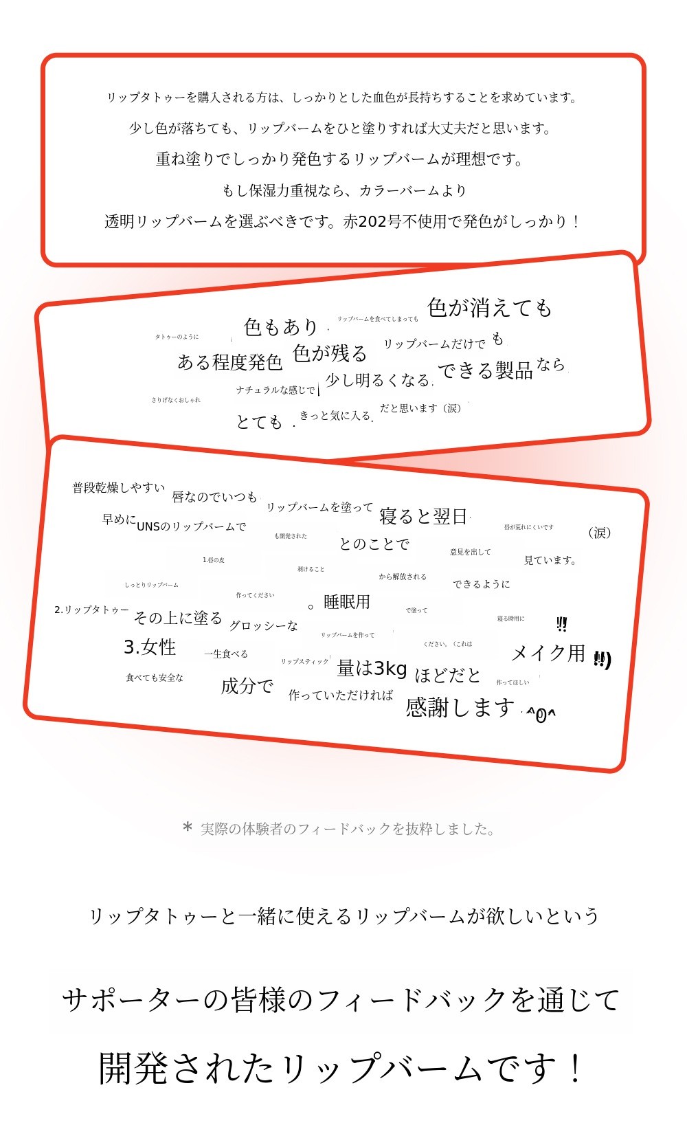 アーリーアダプターサポーター様が書いてくださったレビューを見て、私たちが一生使う「リップ」に対する安全性がどれほど重要かを痛感しました。