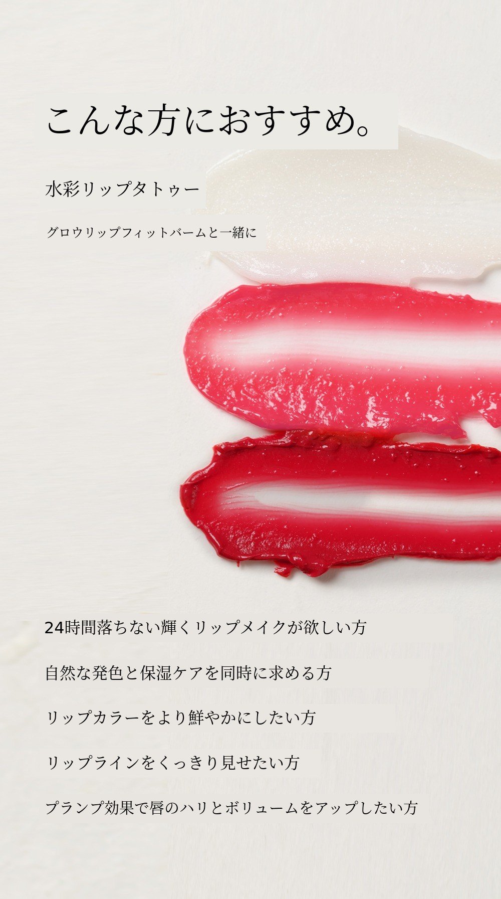 発売直後から水彩リップタトゥーが本当に多くの愛と関心をいただきました。多くの方が一緒に使えるリップバームがあればいいというご意見をくださり、本当に一生懸命準備しました。サポーターの皆様のご意見を最大限反映しようとしました。