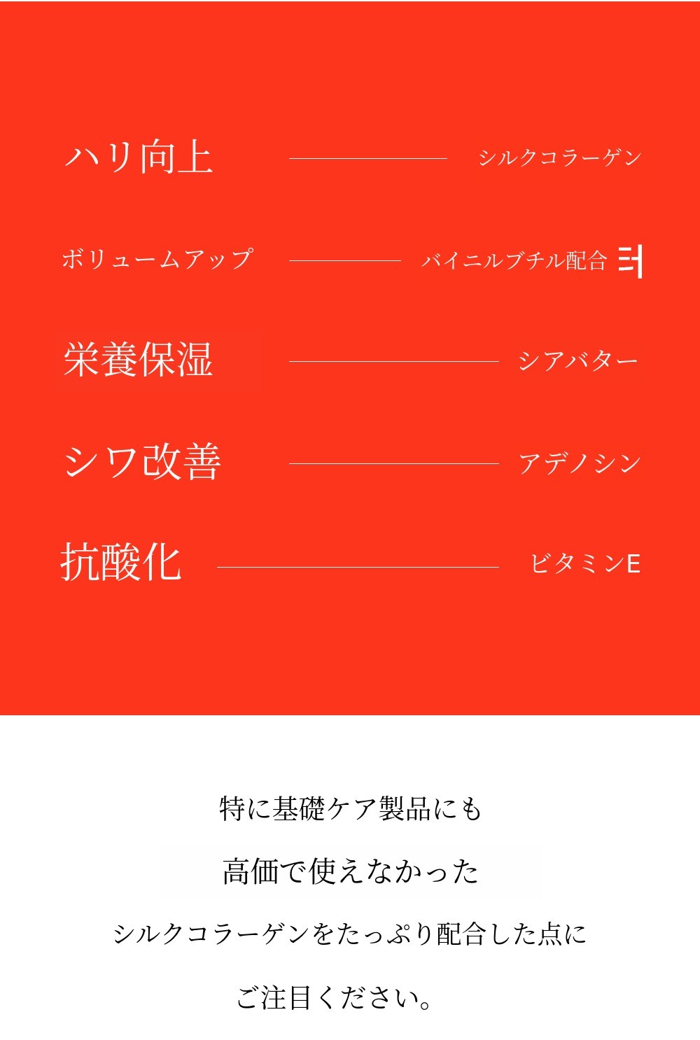 機能性配合成分を基礎ケア製品に使われる高級な成分を基準に厳選して 配合しました。
