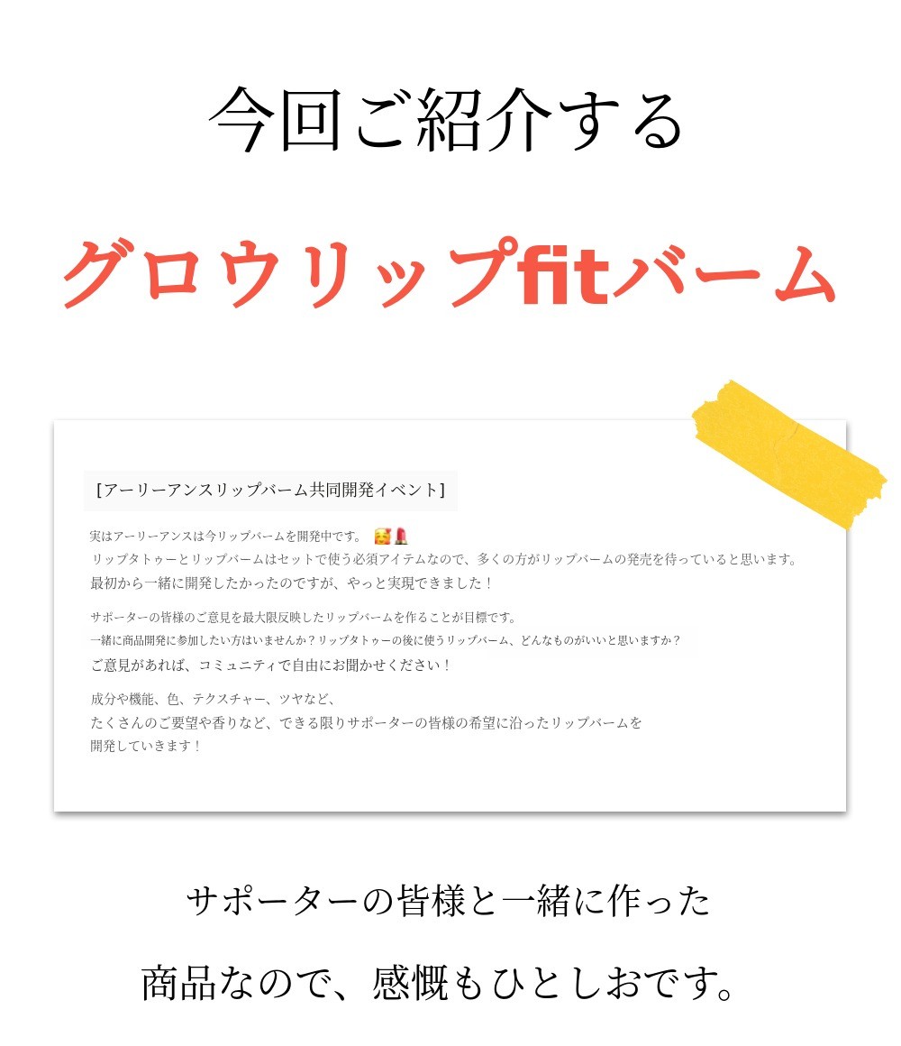 こんにちは、サポーターの皆様!今回のファンディングでは「リップフィットバーム」をご紹介します。リップタトゥーに続き、メーカーが一生使いたくて作ったアーリアンスの2番目の革新的リップです。