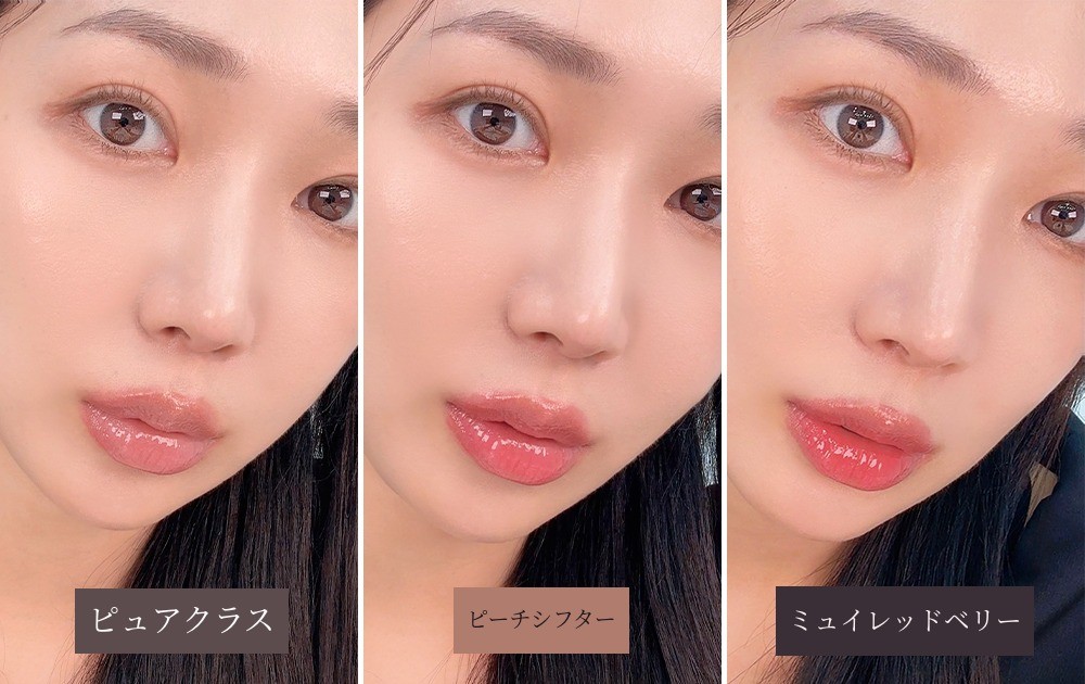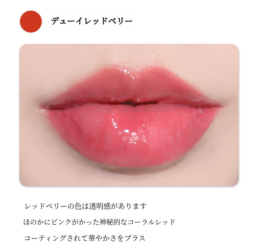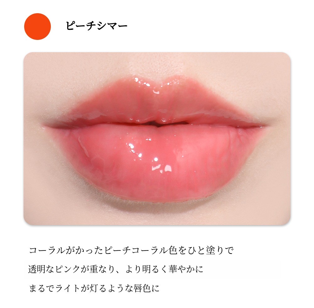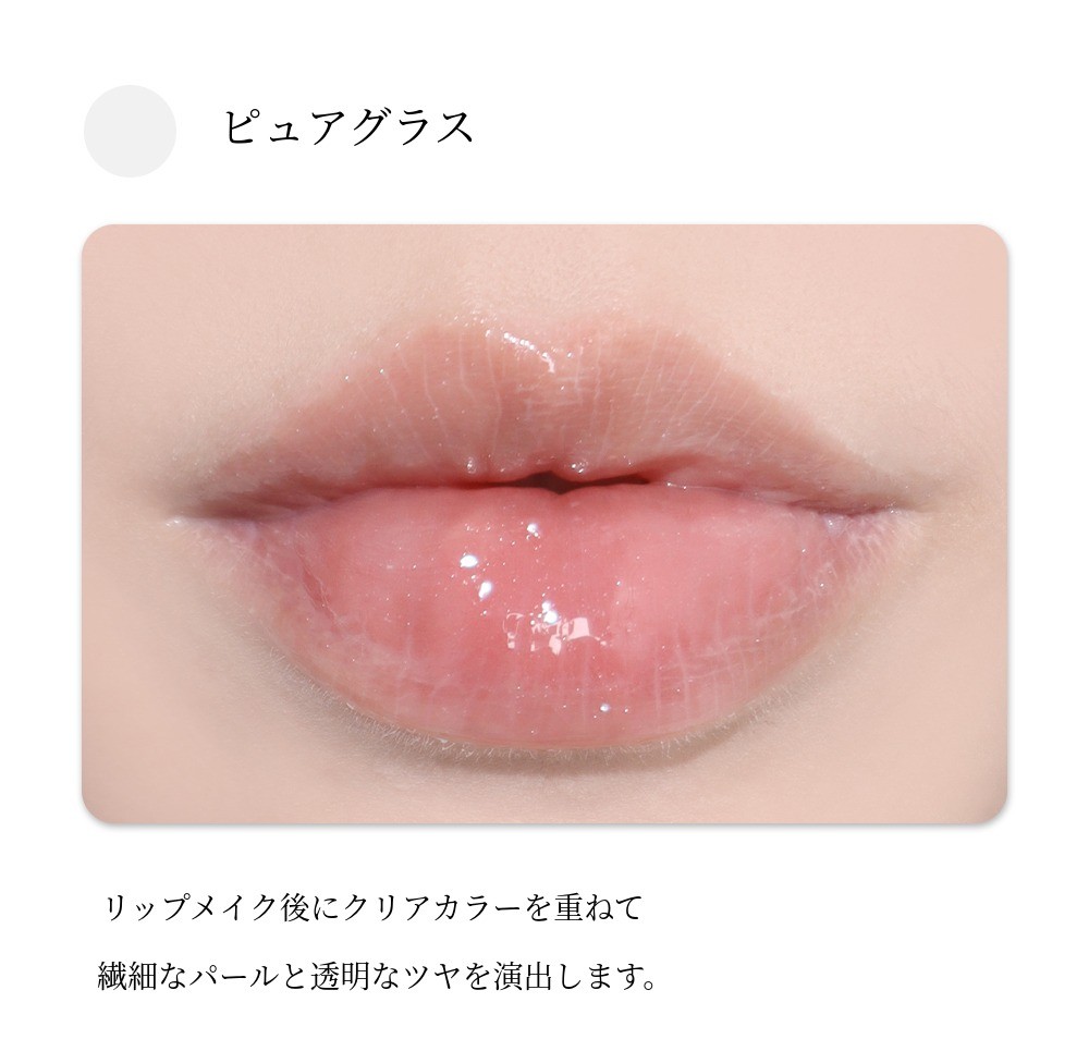 一度の発色だけで透明でグロッシーな色味が唇の上にとろりと広がります。すっぴんやナチュラルメイクにもぴったりです。清純なメイクのポイントリップとしてもおすすめです。