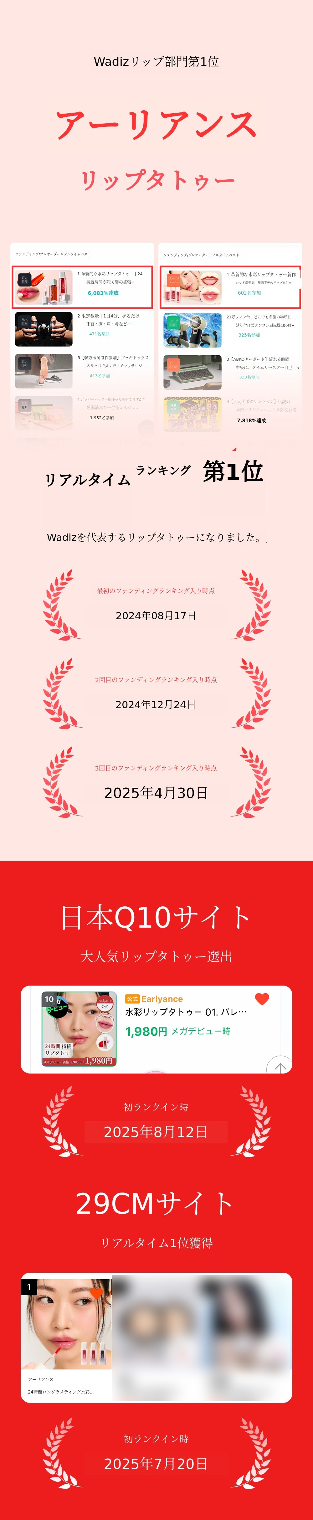 私は数百のビューティーブランドをコンサルティングし、数千の製品を使ってきたブランドディレクターです。Wadizで水彩リップタトゥーを初めて発売し、良いファンディング成果を得たおかげで、次の製品であるグロウリップフィットバームを発売できるようになりました。私は毎日ドレッサーの上に置いて使える、手がよく伸びるコスメこそが最終的に消費者に選ばれると考えています。実際に多くの方が水彩リップタトゥーを愛用してくださり、そのおかげで私が目指す方向に少しずつ近づいていると感じています :)