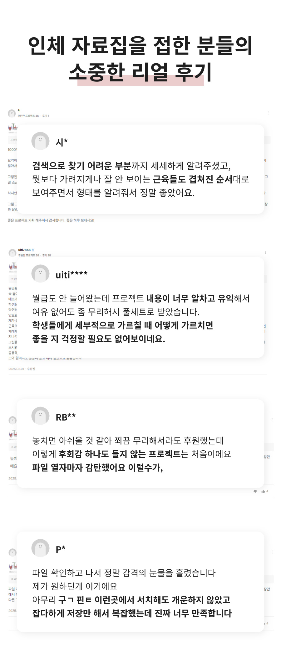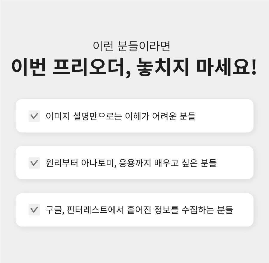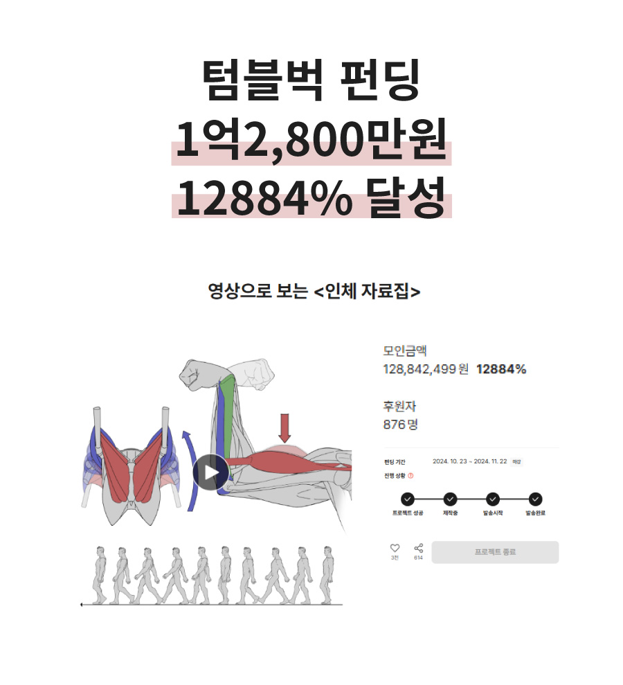 이번 프로젝트는 단순히 하나의 상품을 만드는 것이 아니라, 더 정확하고 깊이 있는 인체 정보를 전달하기 위한 과정을 함께 만들어가는 일입니다. 와디즈에서 프리오더를 진행하는 이유는, 실제로 필요한 분들의 목소리를 반영하고, 그 수요를 바탕으로 더욱 정제된 형태로 자료를 구성해 나가기 위함입니다. 여러분의 참여는 단순한 구매를 넘어, 더 나은 인체 학습 자료를 함께 만들어가는 중요한 발걸음이 됩니다.