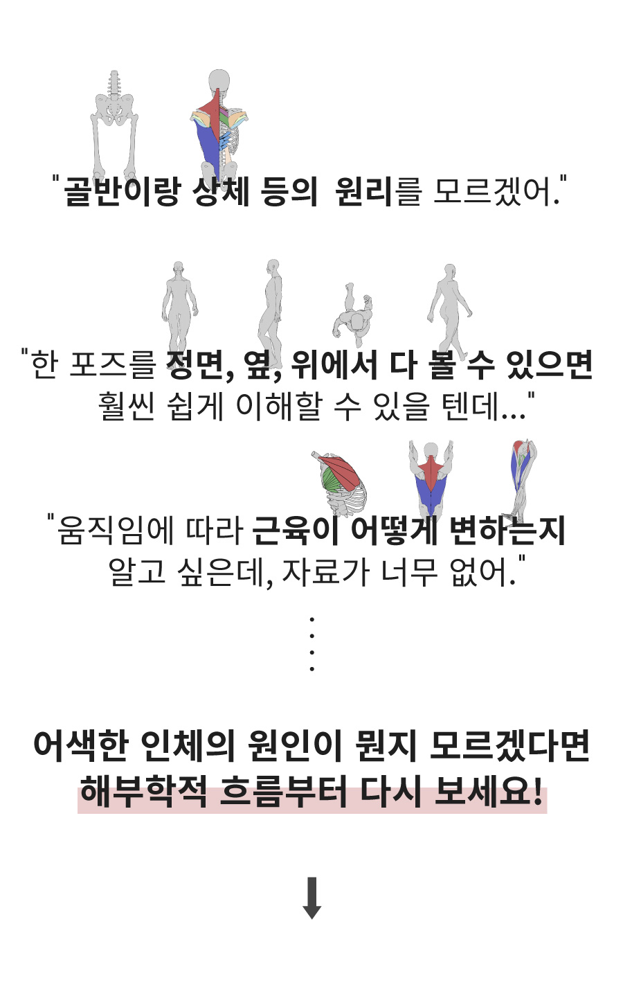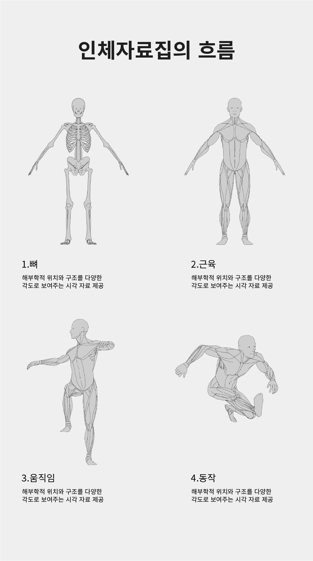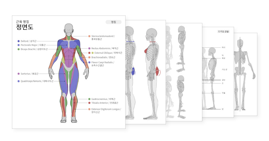 복잡한 동작의 흐름이나 근육의 구조 변화까지 훨씬 더 쉽게, 그리고 직관적으로 파악할 수 있도록 구성했습니다.