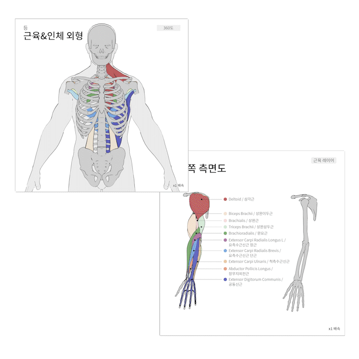 뼈 위에 어떻게 근육이 덮이고 이어지는지를 시각적으로 이해할 수 있도록 구성했습니다.