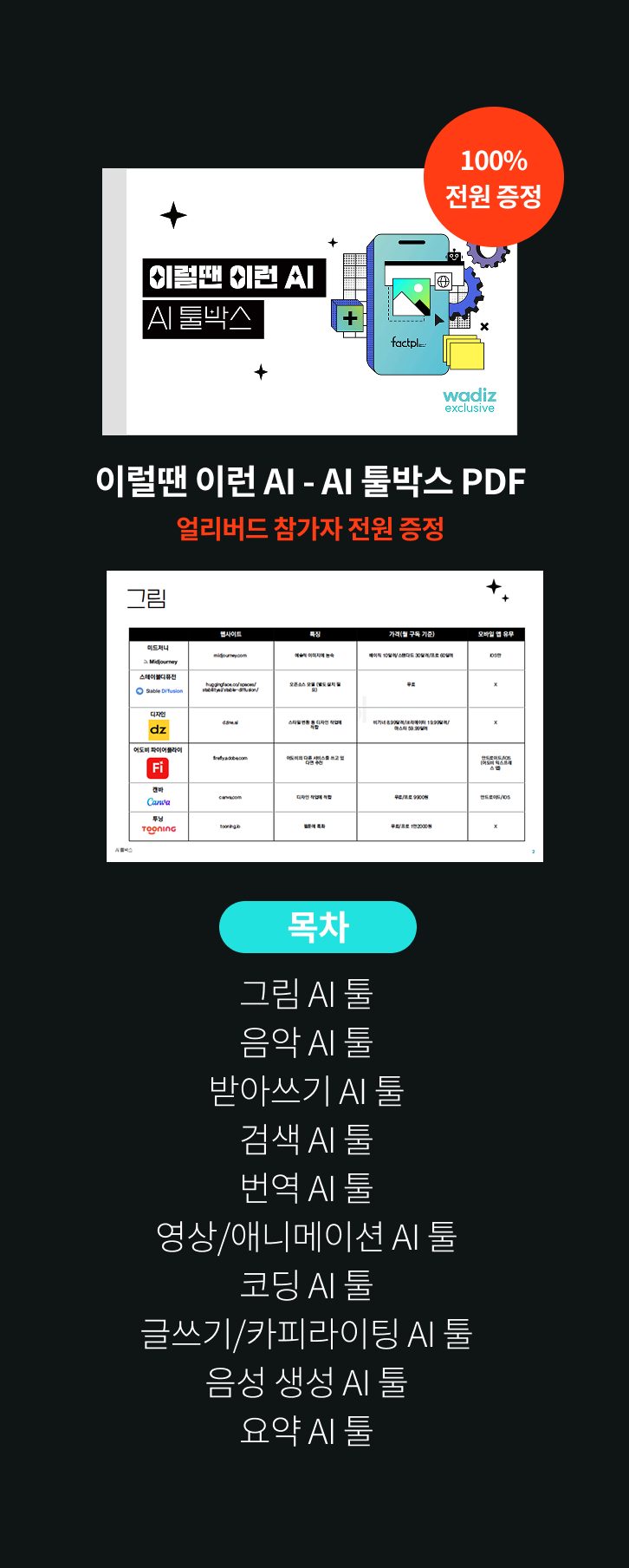 알림 신청만 해도 100% 증정!→ 정가 10,000원 상당의 '생성AI 도구표 PDF' 무료 제공 (72시간 펀딩 시)