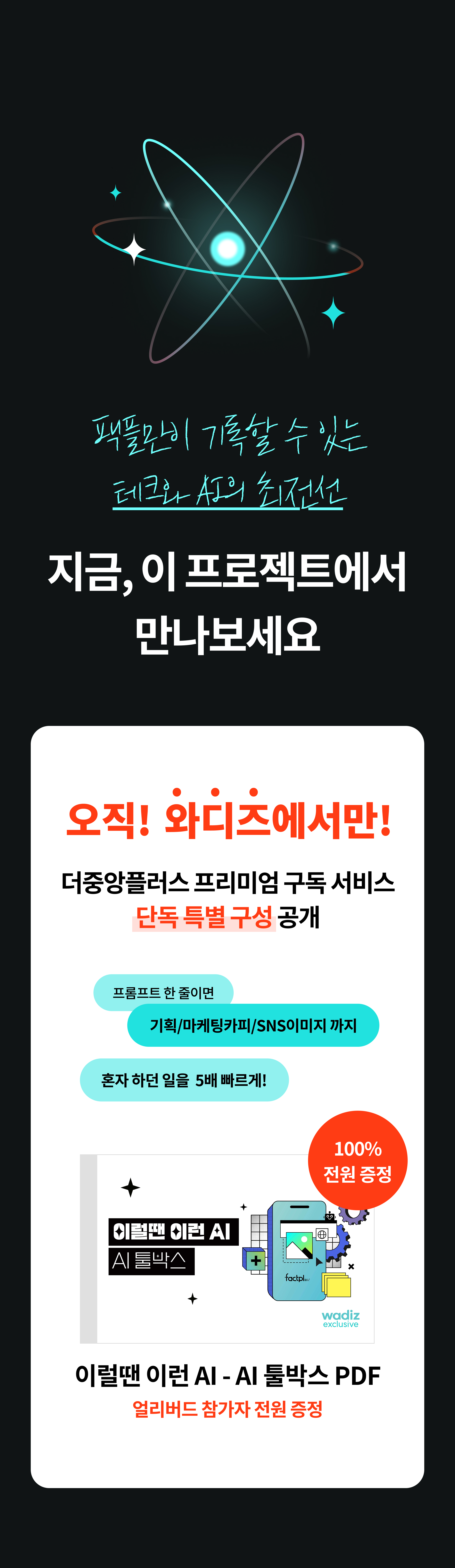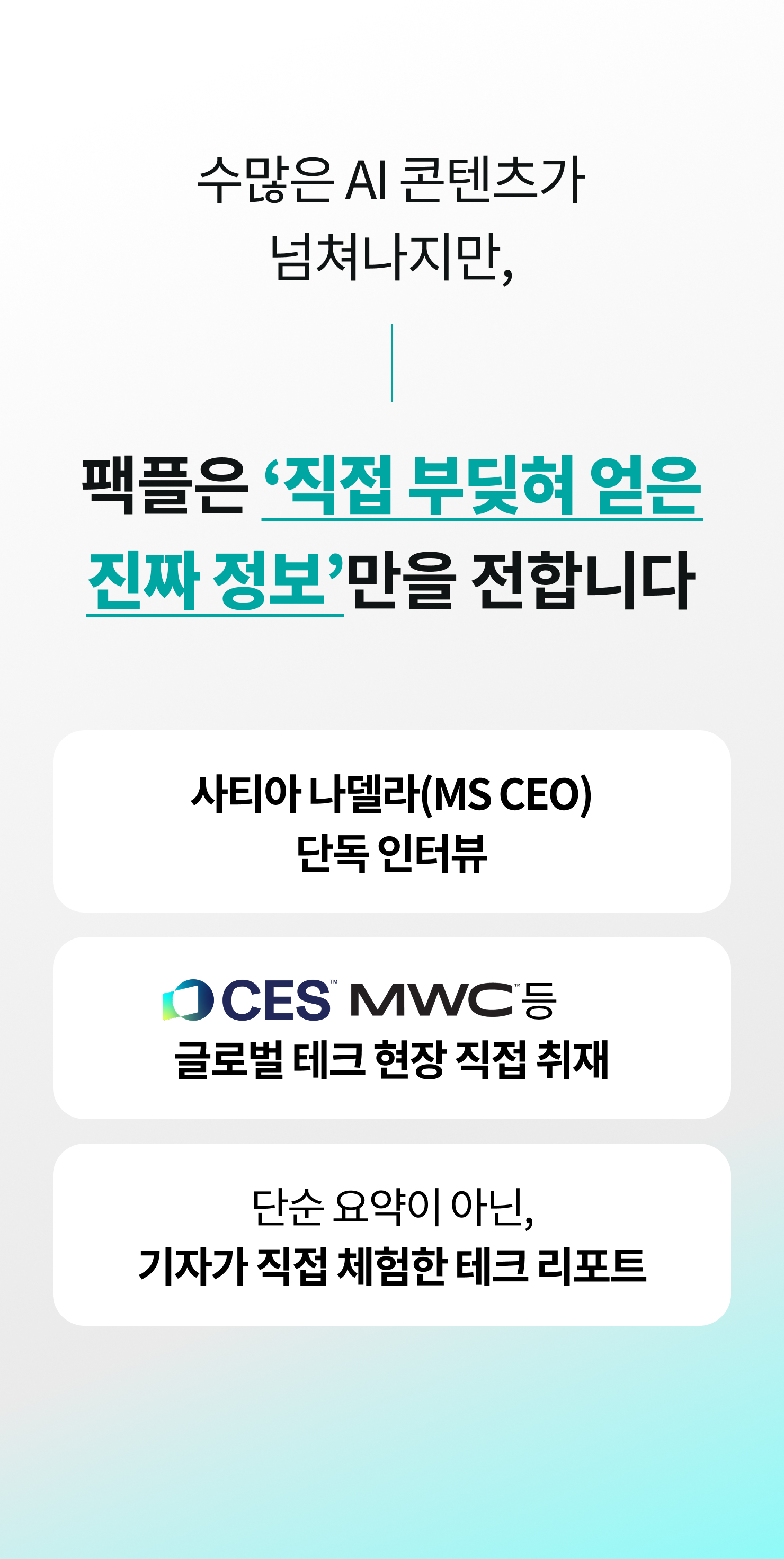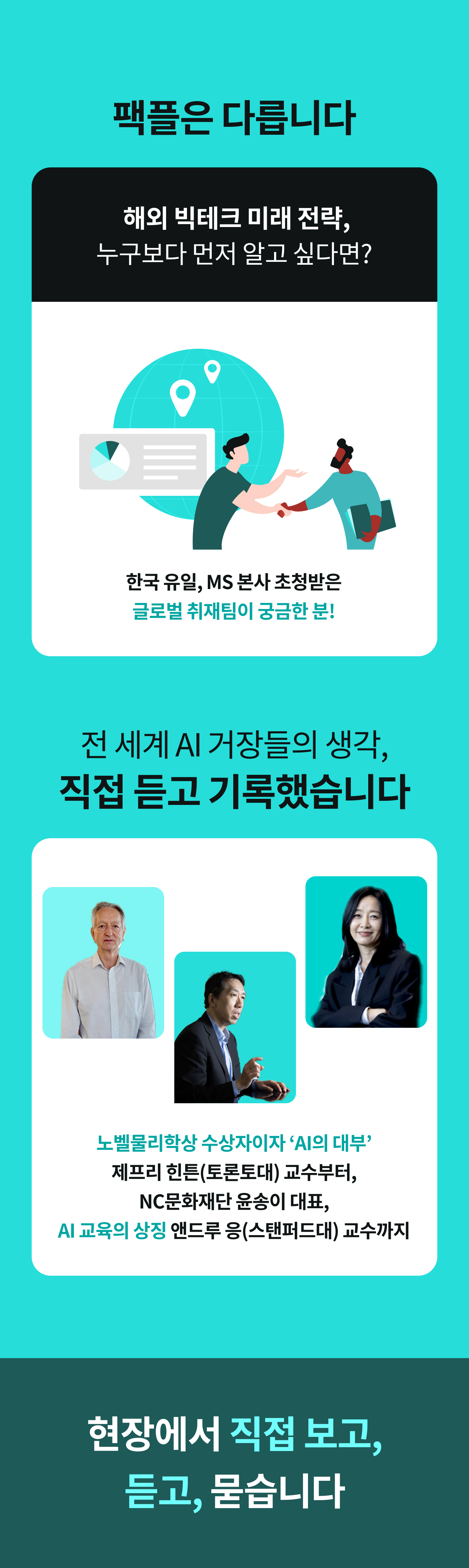 안녕하세요. 생성 AI 시대 흐름을 누구보다 빠르게 전달하는 중앙일보의 IT 산업부 팩플입니다. 팩플은 지금 가장 뜨거운 테크놀로지와 비즈니스, 그리고 IT 기업에 대해 놓치지 말아야 할 이야기를 이용자ㆍ공급자ㆍ투자자 입장에서 쉽게 풀어드립니다. 국내외 혁신기업의 전략과 이들 기업이 우리 삶에 미칠 영향을 따져보는 ‘미래검증 보고서’이자, 혁신가들 머릿속을 들여다 볼 수 있는 ‘인사이트 리포트’입니다. 지금 당장 내 삶에 영향을 미치는 기술적 변화에 적응할 수 있게 돕는 ‘퍼스널 코치’이기도 합니다. 뉴스레터와 더중앙플러스 팩플 오리지널 시리즈를 통해 현장의 목소리와 깊이 있는 인사이트를 기반으로 실질적인 변화를 이끌 수 있는 콘텐츠를 기획하고 있습니다.