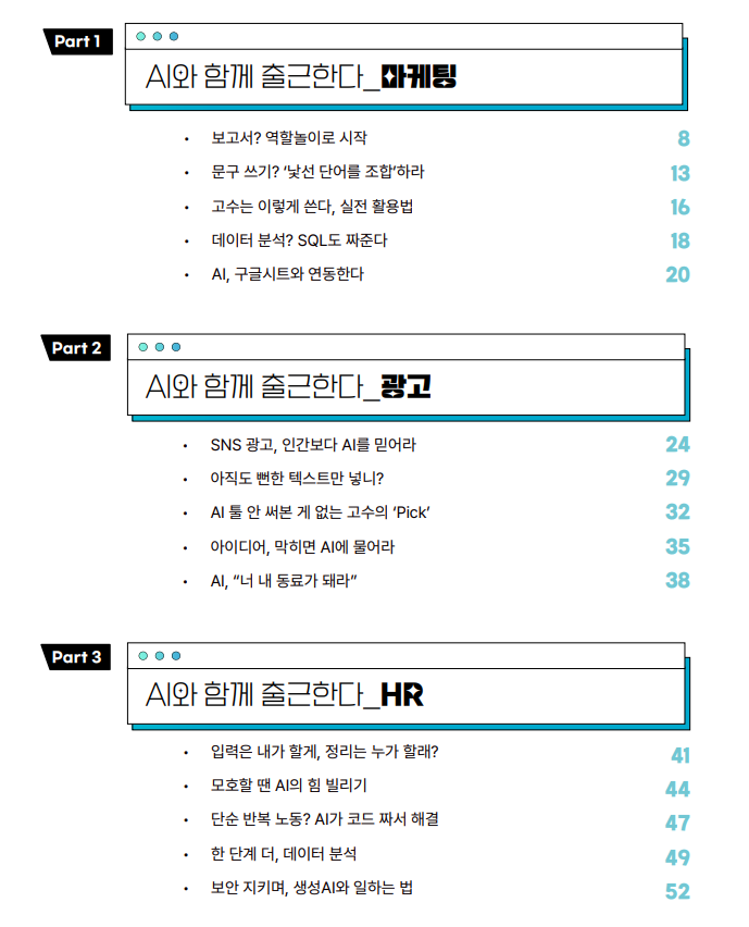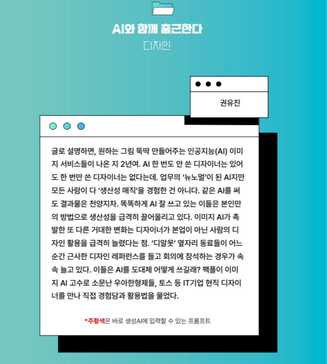 마케팅, 디자인, 광고부터 번역, 변호사 등 전문적인 영역까지! 어떤 직무에서, 어떤 직장에서, 어떤 노하우로 AI 툴을 활용하고 있는지, 현장에서 담은 상세한 활용법을 전.부 공개합니다.