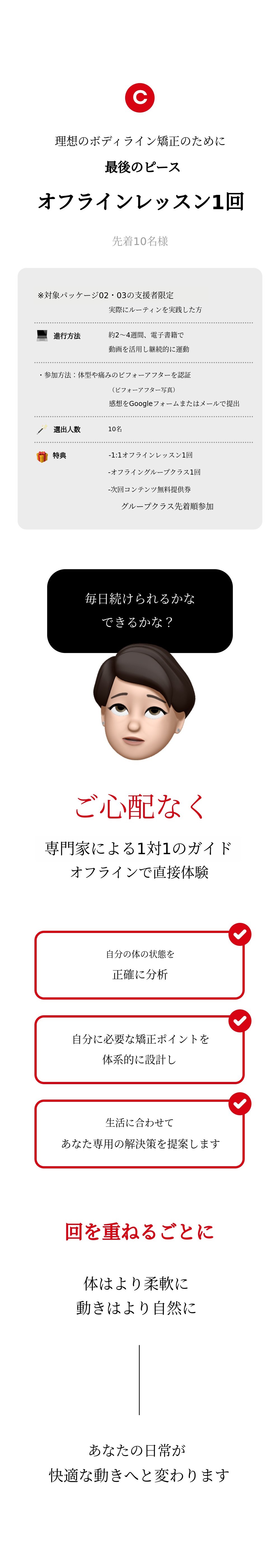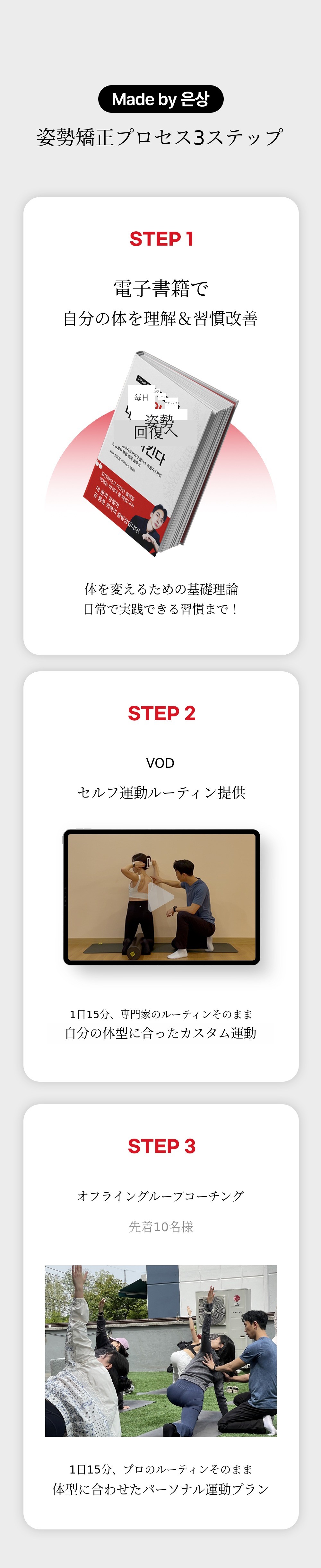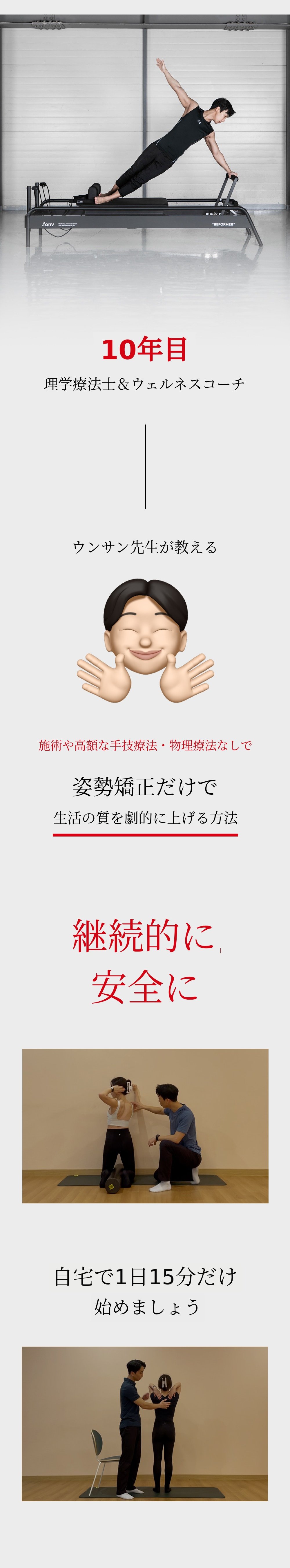 1. 🧑⚕️ 10年経験の理学療法士クラス - 専門家による遠隔姿勢矯正プログラムです 2. ⏰ 1日15分のカスタム運動 - 簡単な時間投資で痛み軽減と姿勢改善を実現します 3. 🎁 オフラインクラス連携特典 - 先着10名に1対1のオフライン指導を提供します