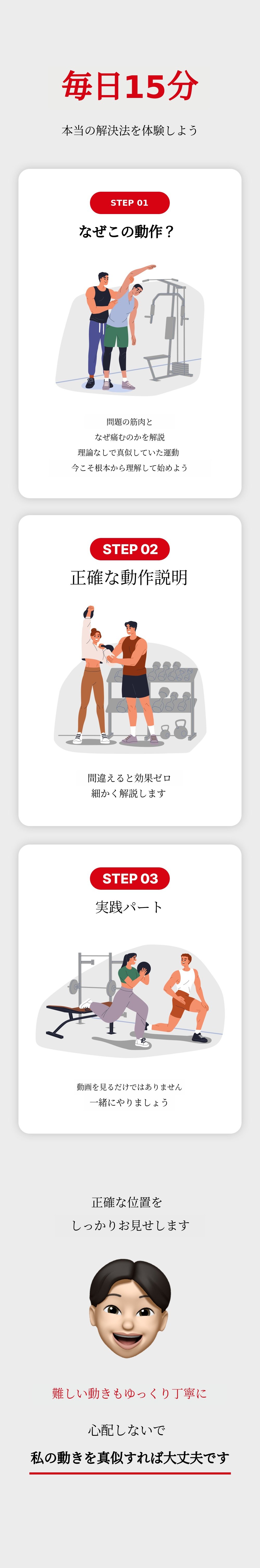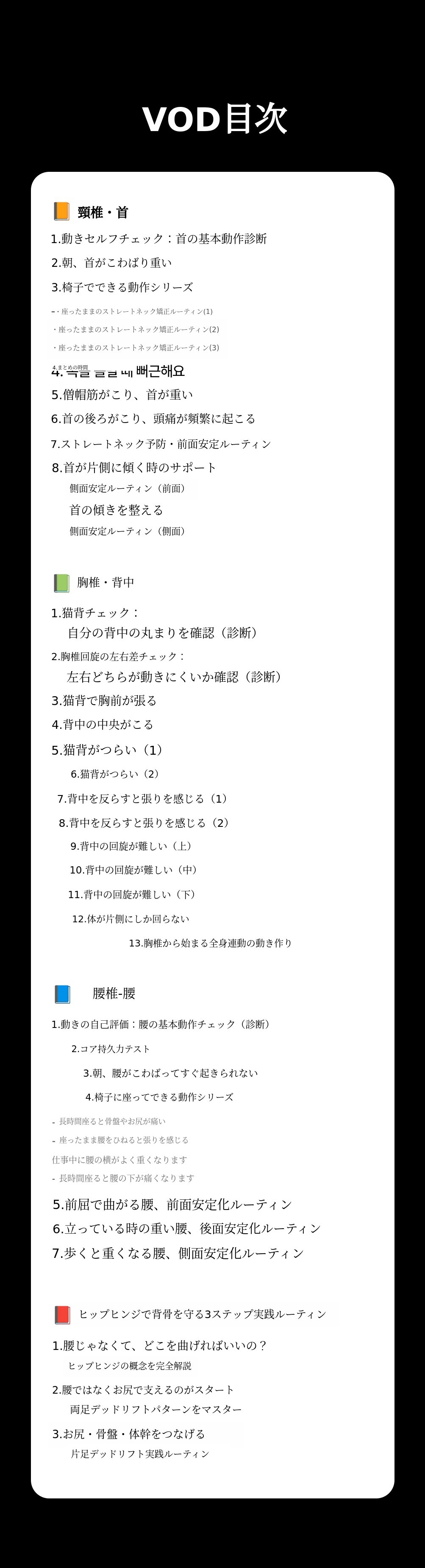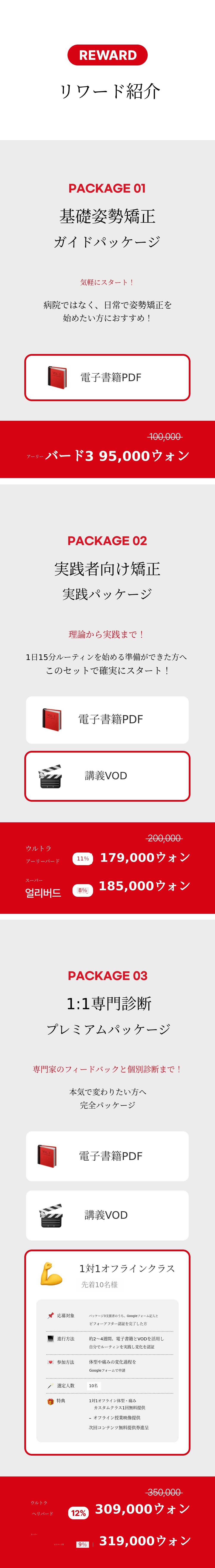 1. 🧑⚕️ 10年経験の理学療法士クラス - 専門家による遠隔姿勢矯正プログラムです 2. ⏰ 1日15分のカスタム運動 - 簡単な時間投資で痛み軽減と姿勢改善を実現します 3. 🎁 オフラインクラス連携特典 - 先着10名に1対1のオフライン指導を提供します