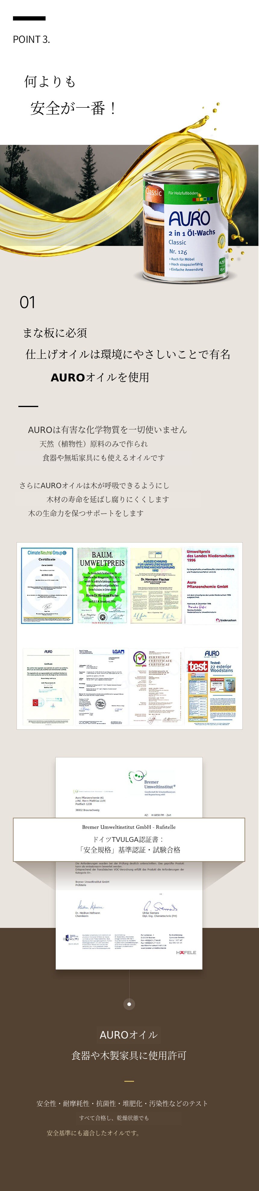 実際にドイツ高級オイルAUROはドイツTUVのLGAで14歳以下の子供の「おもちゃ安全規格」基準認証および試験に合格しており、実際に14歳以下の子供が口に入れても安全なおもちゃ・文具の基準をクリアしています。しました。何よりも天然オイルなので、食材を扱う皆様に健康的なキッチンにぴったりだと思います。