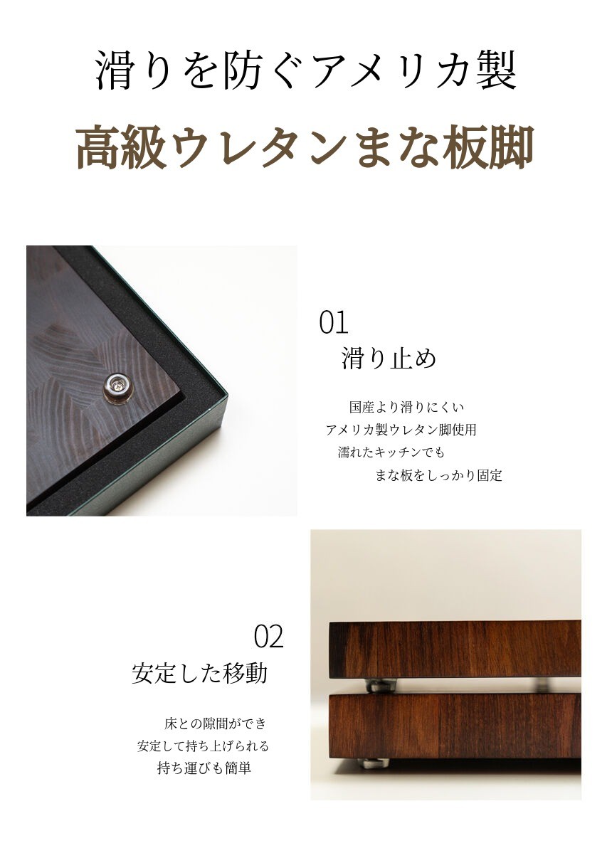 両面まな板にすればコスト面で確かに節約できますが、私はクオリティのためにまな板の脚は必ず必要だと考えています。エンドグレインまな板は一般的な無垢材まな板に比べて重さがある方です。持ちやすくなければならず木は水分に弱いのでまな板の脚で表面に触れる水分を最小限に抑えることができます。それだけでなく、水気の多いキッチンではまな板が滑って怪我をすることもよくあります。安全面の問題も補完できるので、一般的なまな板とは違いエンドグレインまな板はまな板の脚があることで利点がはるかに多いとお伝えしたいです。