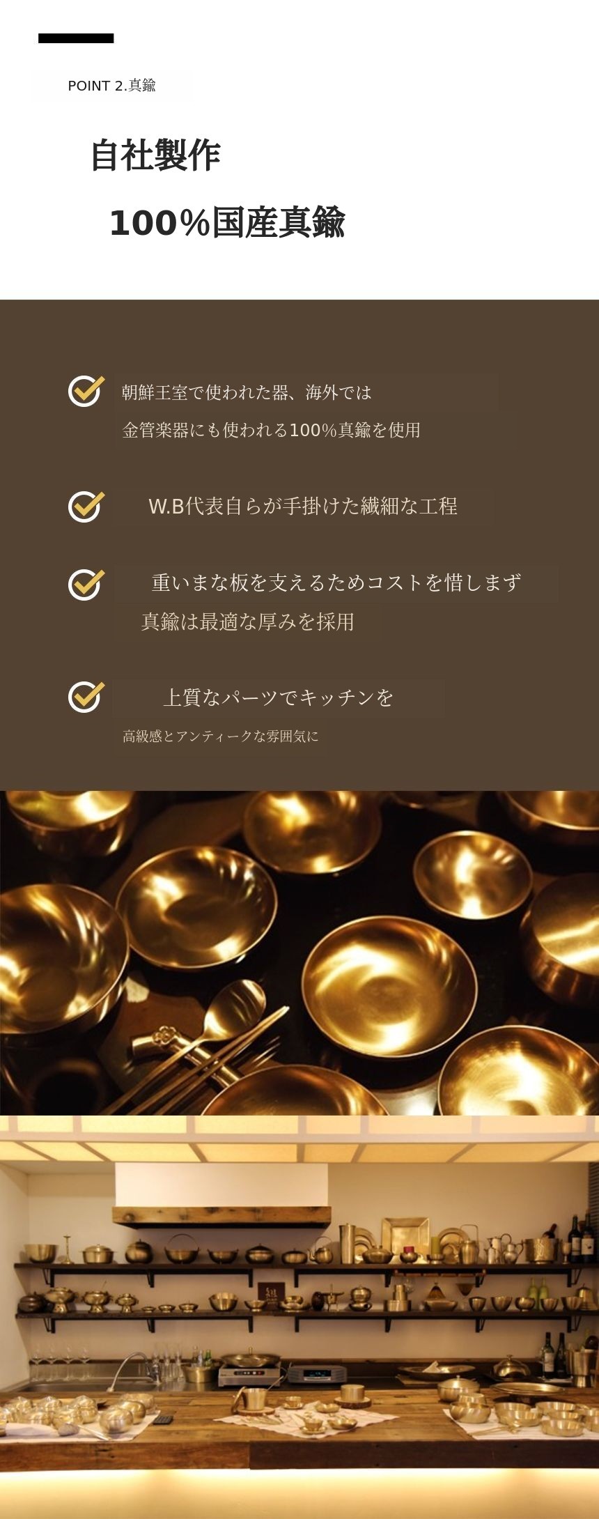 でした。私たちW.Bもまた真鍮の利点を把握し、安価なステンレスよりも 原価は高いですが国産真鍮を使用してキッチンの美的な美しさと健康的な 과 건강하고 有益な