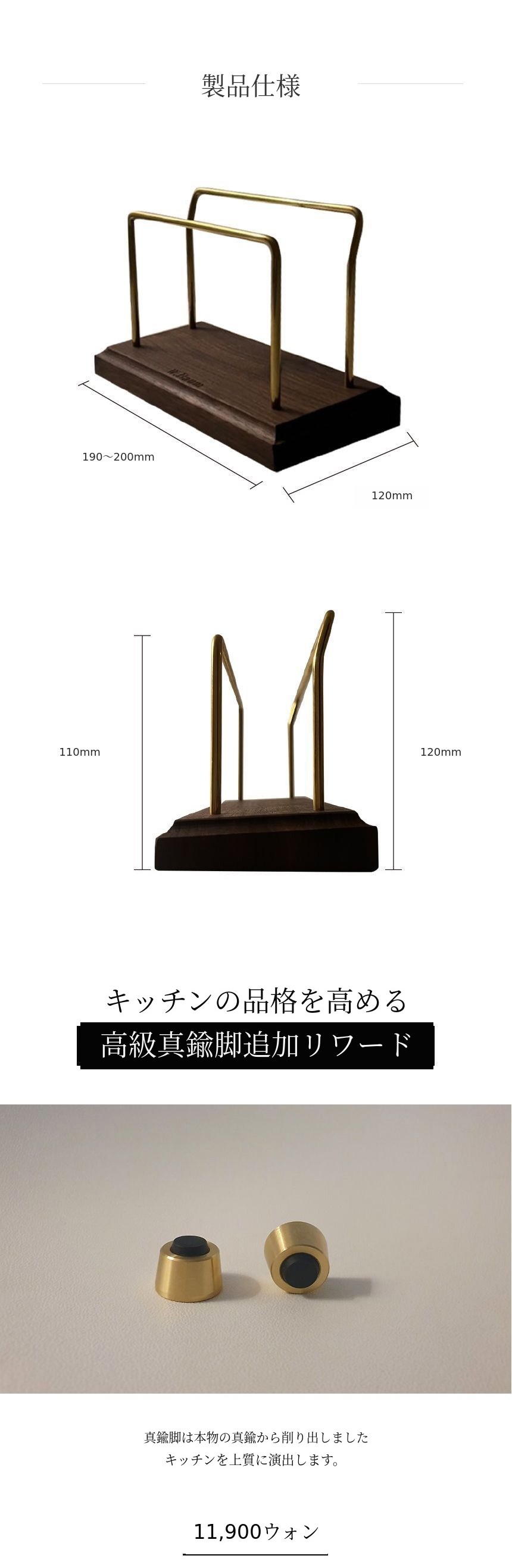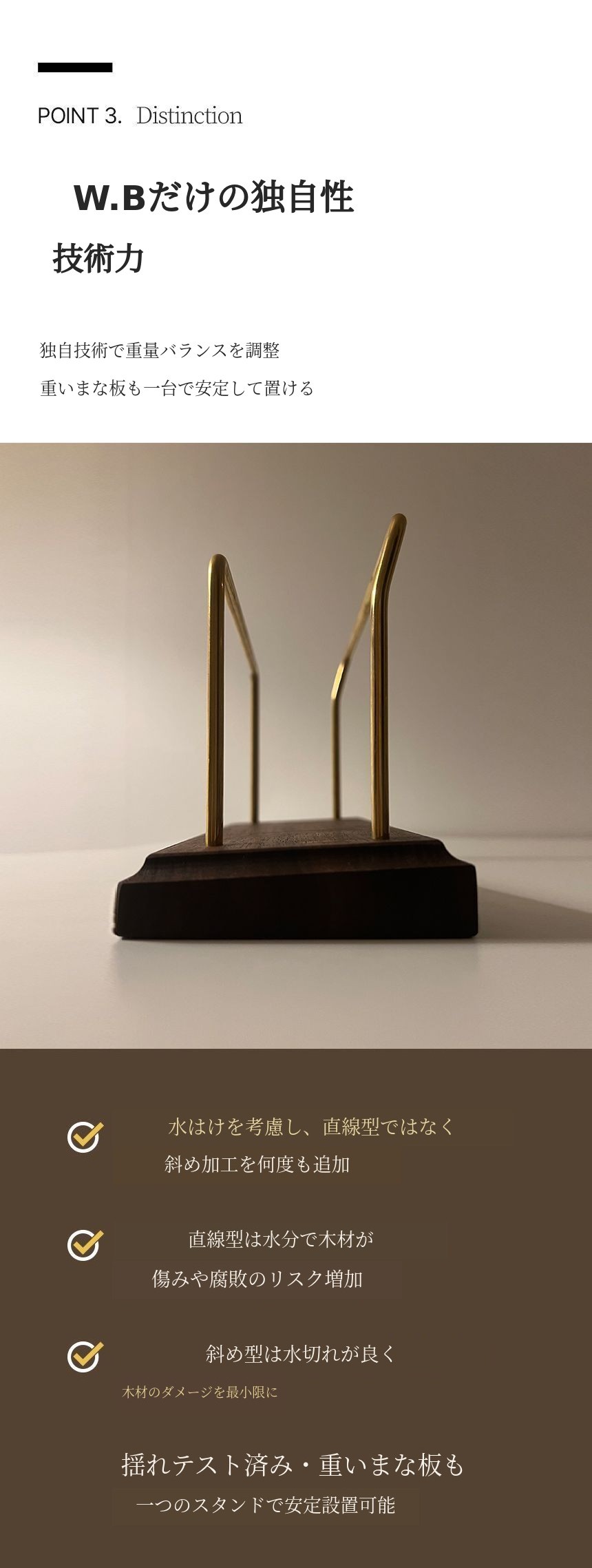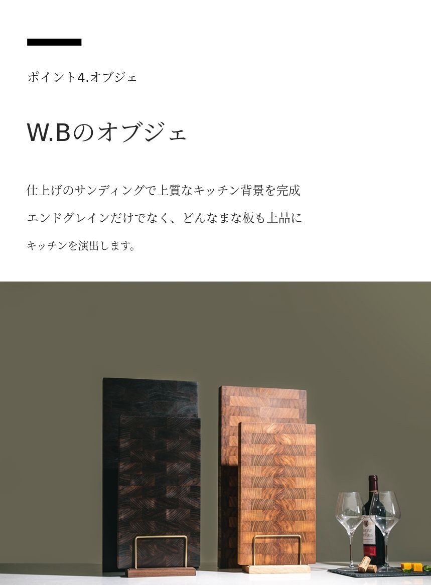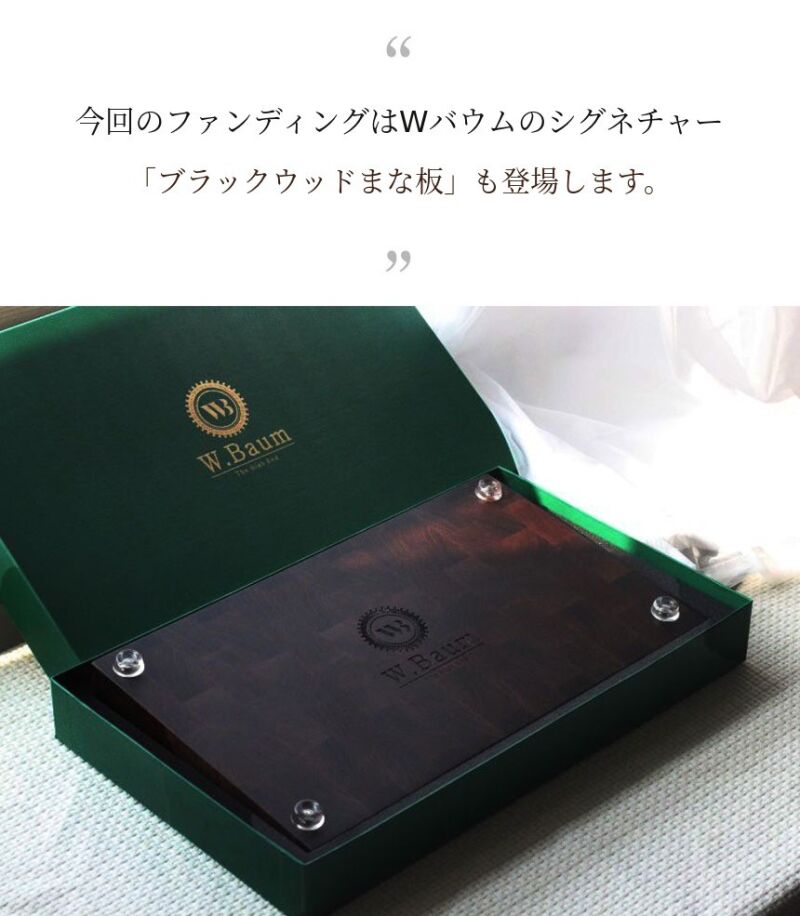 初回ファンディング時にはスタンドについての問い合わせが非常に多かったですが、スタンドは発売しませんでした。W.Baumは「キッチンの背景」というハイエンドブランドとして誕生しました。そのため、キッチンの背景という趣旨に合うように、品格がありキッチンの雰囲気を引き立てる審美性と重いまな板を安定して置ける安定性と水切りに優れた機能性をお見せしたいと思いました。そのため、6ヶ月という試行錯誤の末に発売されました。私の心からの思いは、皆様に短期間の利益創出のためのありふれた製品よりもサポーターの皆様のキッチンの価値を高めるために誕生したスタンドです。W.Baumが使用するミズーリ産スーペリアグレードのウォールナット