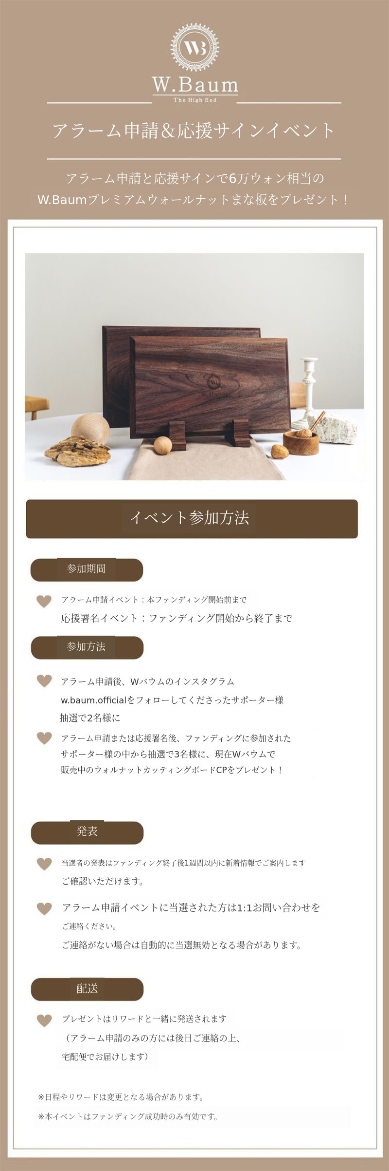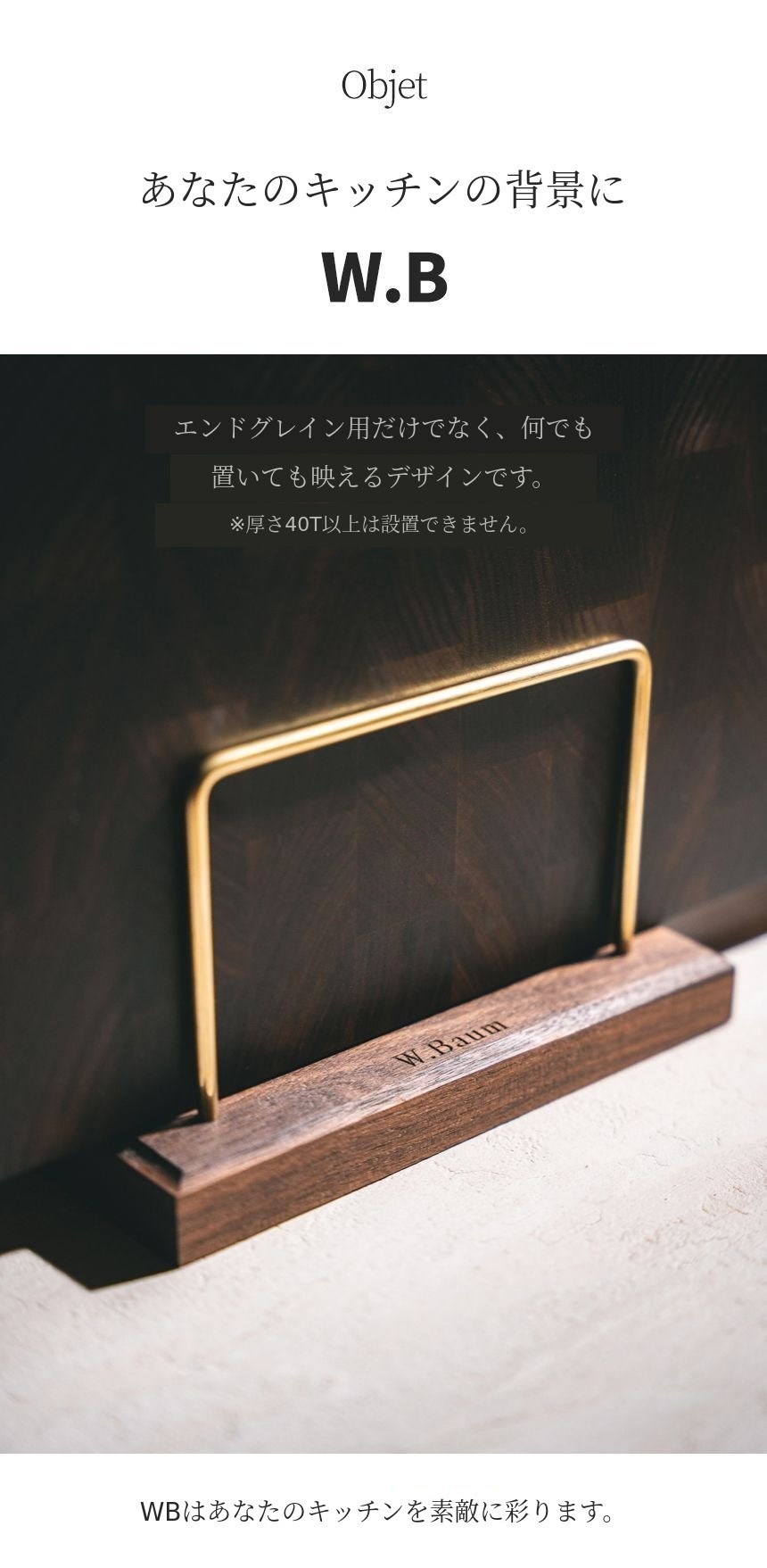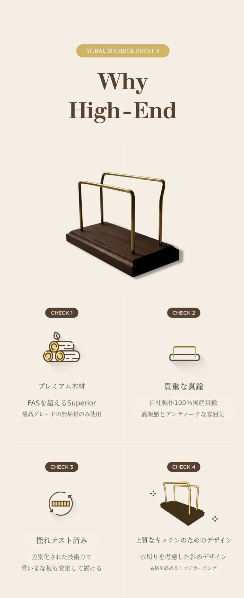 初回ファンディング時にはスタンドについての問い合わせが非常に多かったですが、スタンドは発売しませんでした。W.Baumは「キッチンの背景」というハイエンドブランドとして誕生しました。そのため、キッチンの背景という趣旨に合うように、品格がありキッチンの雰囲気を引き立てる審美性と重いまな板を安定して置ける安定性と水切りに優れた機能性をお見せしたいと思いました。そのため、6ヶ月という試行錯誤の末に発売されました。私の心からの思いは、皆様に短期間の利益創出のためのありふれた製品よりもサポーターの皆様のキッチンの価値を高めるために誕生したスタンドです。W.Baumが使用するミズーリ産スーペリアグレードのウォールナット