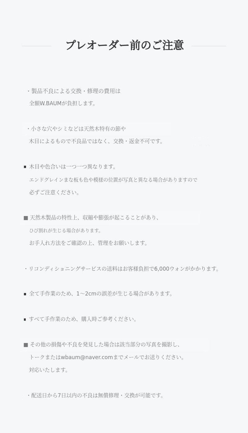 最近、まちまちなまな板の価格について多くの質問を受けます。実は私は製作者であると同時に、韓国で数少ない木材輸入業者でもあります。それゆえに、原木について根本から知っていると自負しています。ご質問への答えとしては、販売促進のために職人の有名さを利用したり、中間流通業者を経て単価が上昇する場合をよく見かけます。これらのまな板は、90%または100%工場生産の後、仕上げだけが行われます。しかし、100%職人の物語を加えて誇張広告で購入を誘導します。価格に比べて機械サンディングや仕上げが十分でないまな板を使った方々の評価により、「本物」の木材職人たちと韓国木材市場が苦しんでいます。