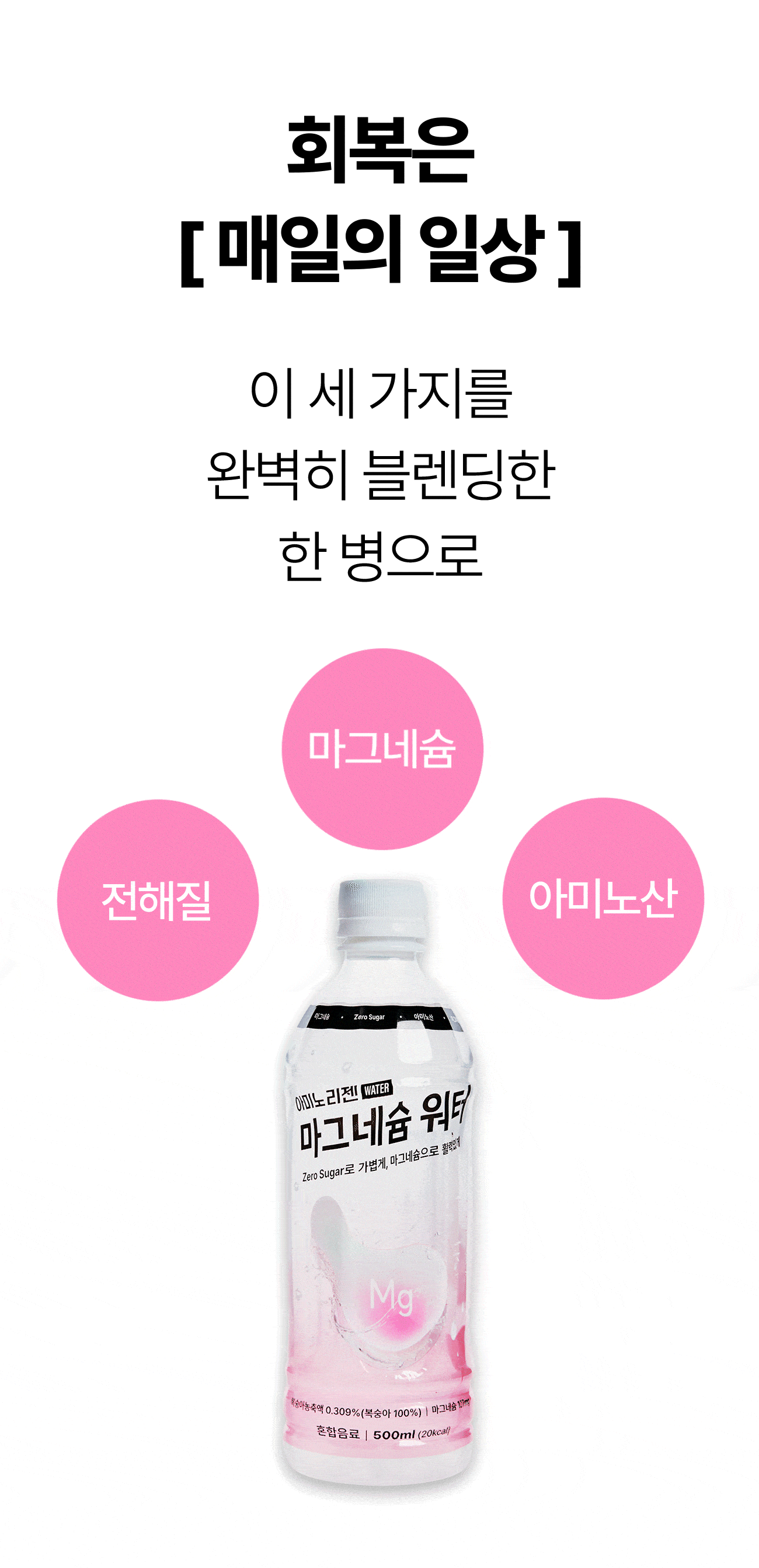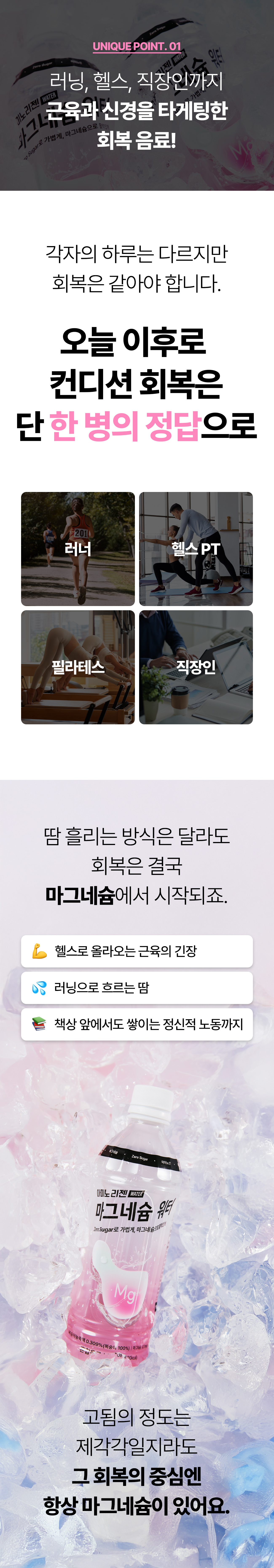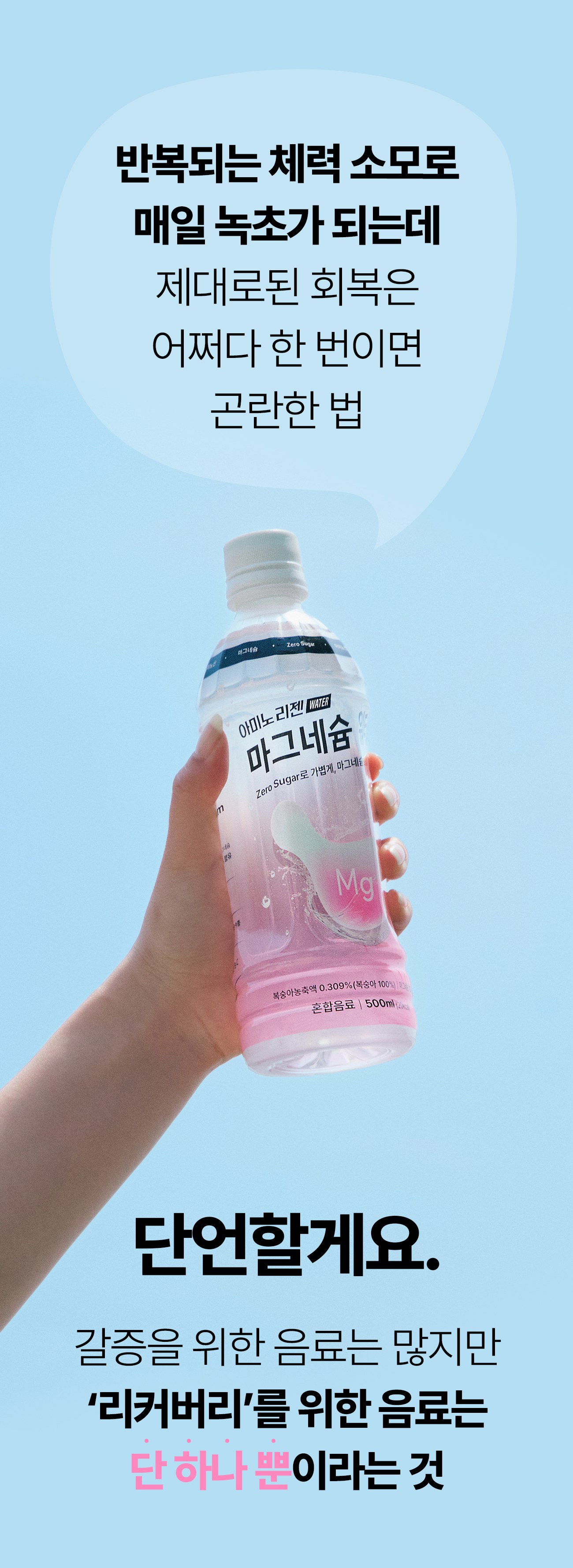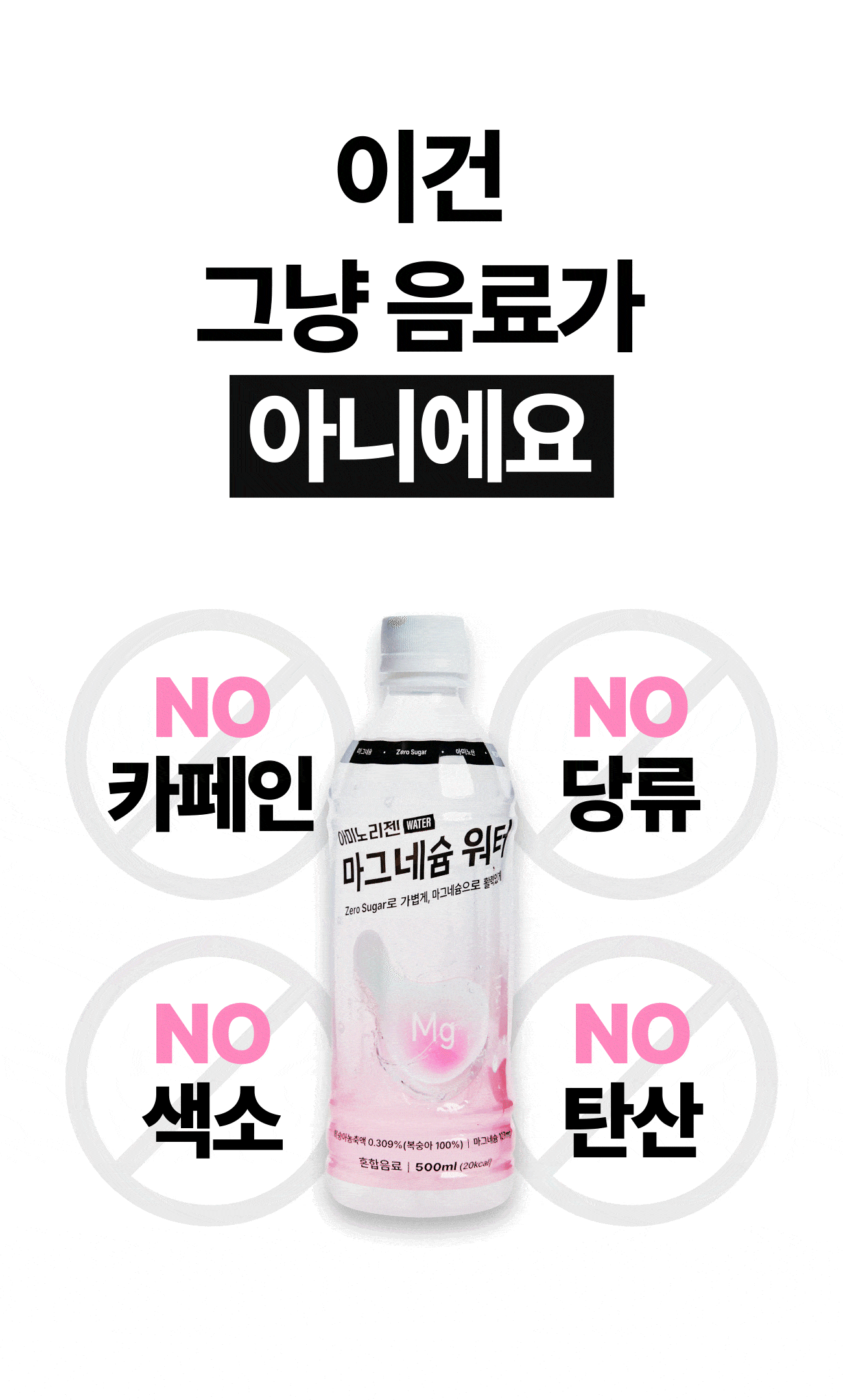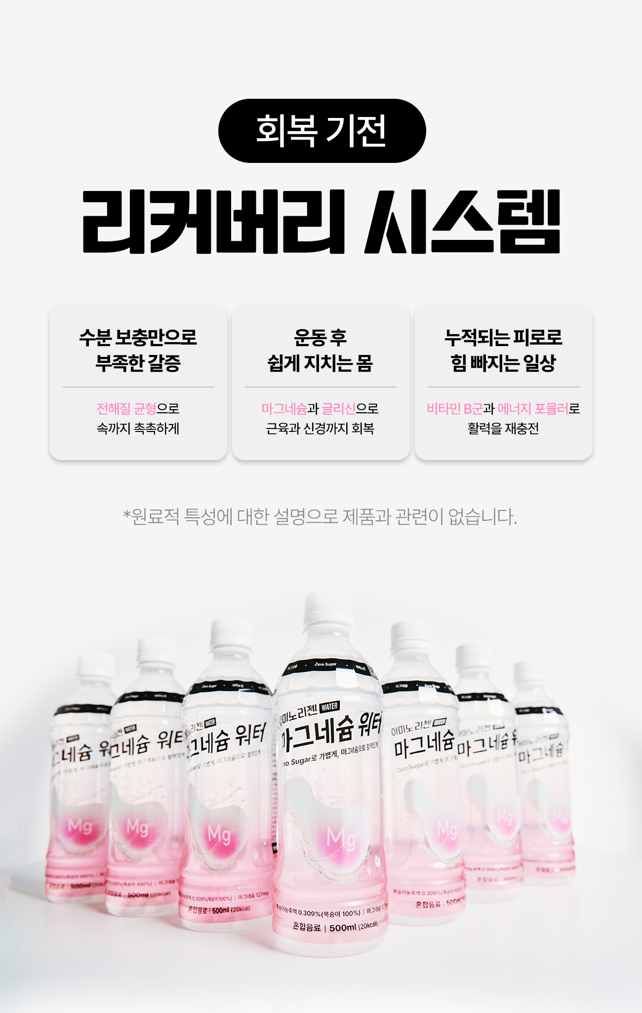 기존 마그네슘 제품이 알약, 분말, 무거운 기능성 중심이었다면 마그네슘 워터는 현대인의 라이프스타일에 맞춘 ‘음료형 웰니스 제품’입니다. 수면, 스트레스, 운동 후 피로 회복 등 회복이 필요한 모든 순간에 자연스럽게 스며들 수 있도록 기획했습니다.