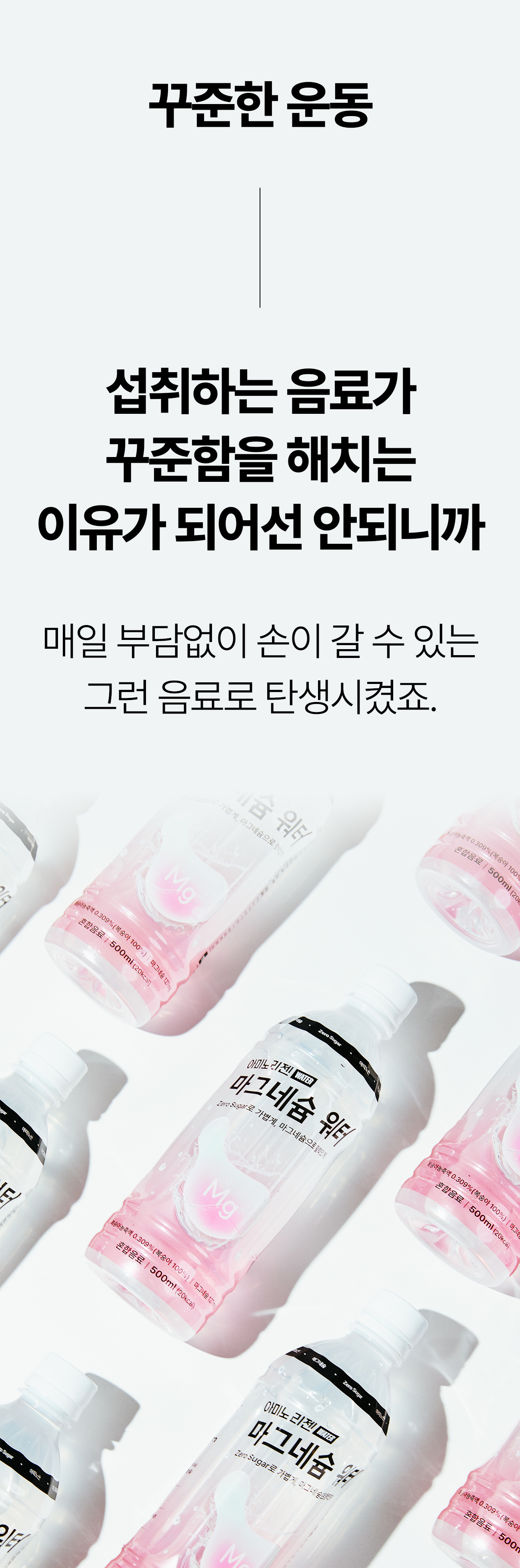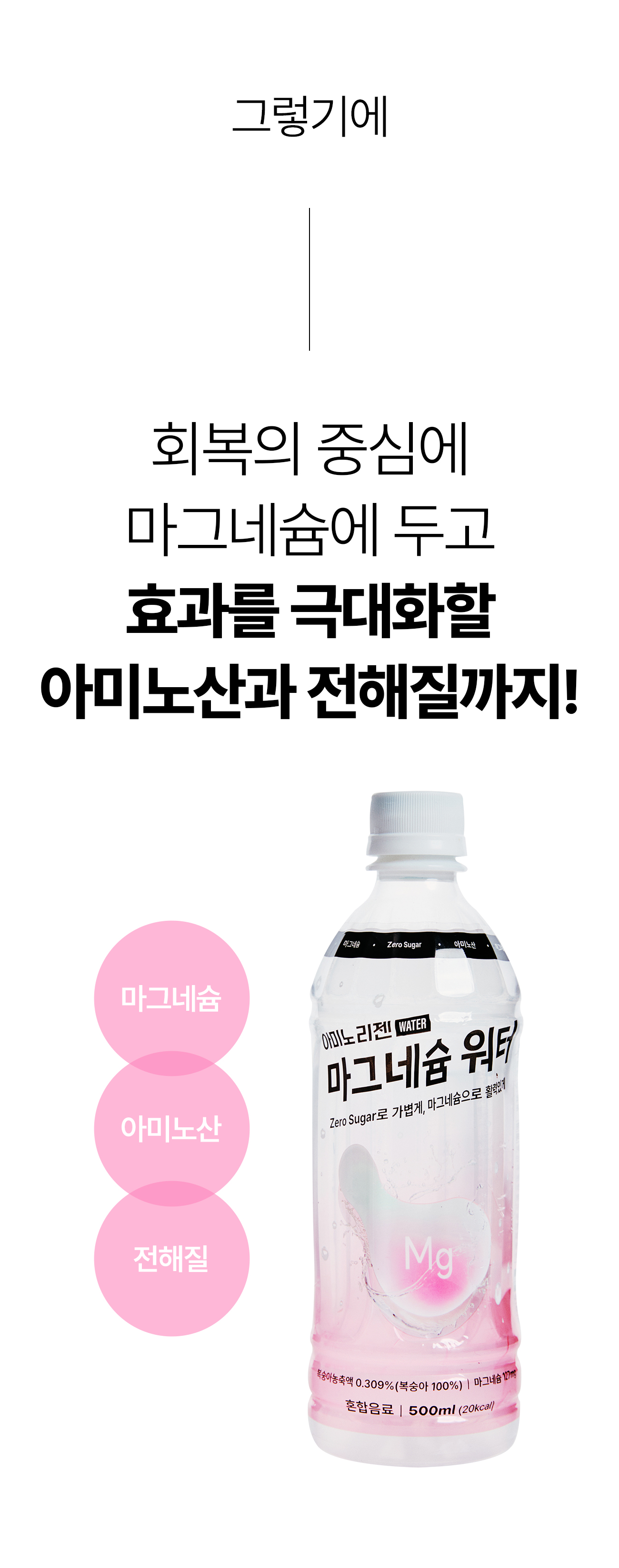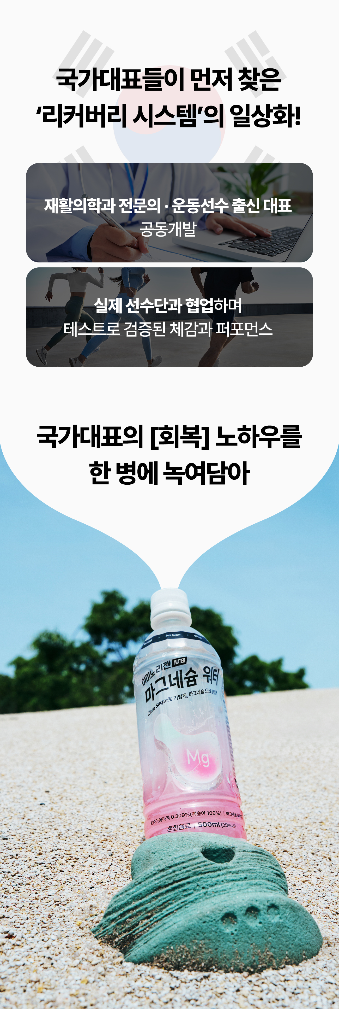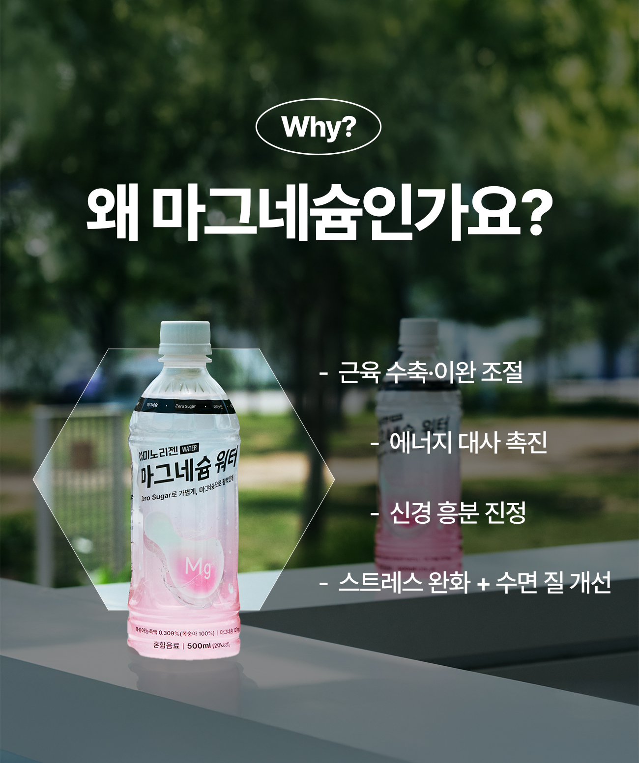 기존 마그네슘 제품이 알약, 분말, 무거운 기능성 중심이었다면 마그네슘 워터는 현대인의 라이프스타일에 맞춘 ‘음료형 웰니스 제품’입니다. 수면, 스트레스, 운동 후 피로 회복 등 회복이 필요한 모든 순간에 자연스럽게 스며들 수 있도록 기획했습니다.