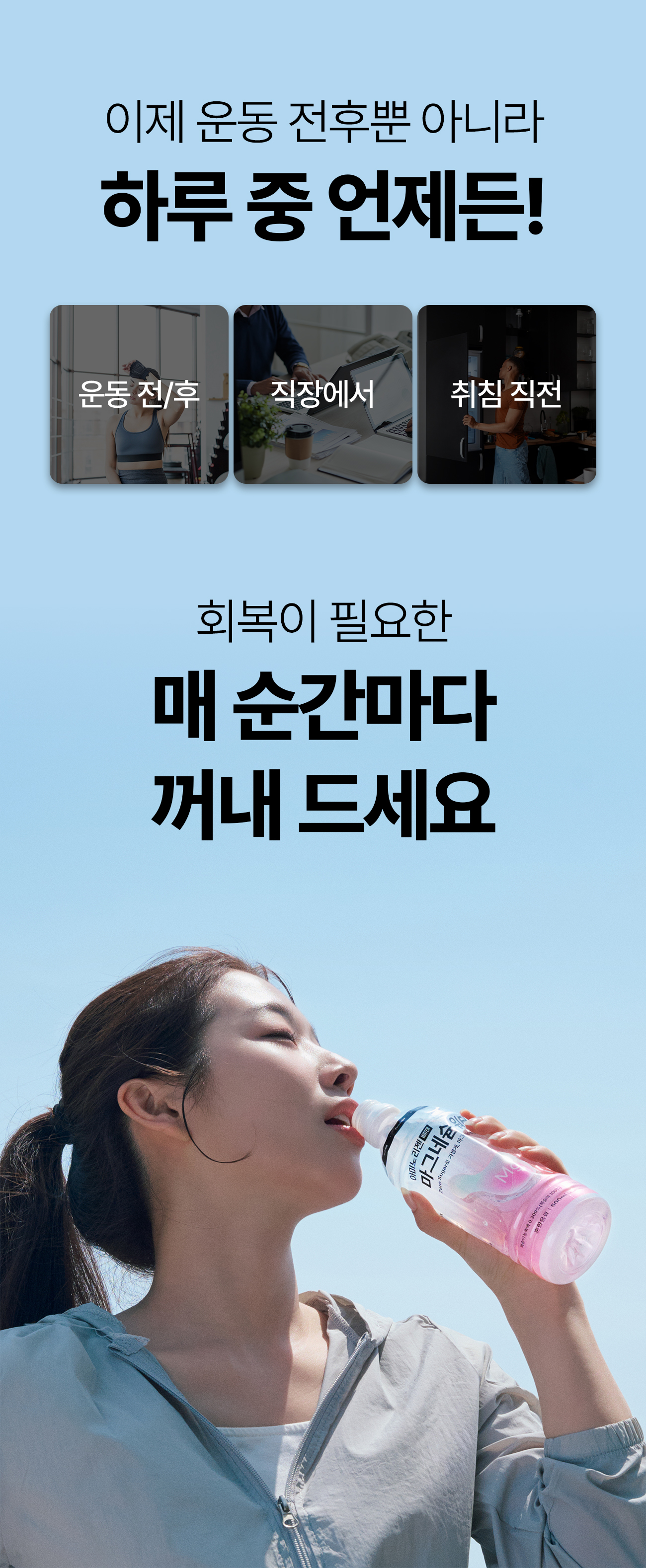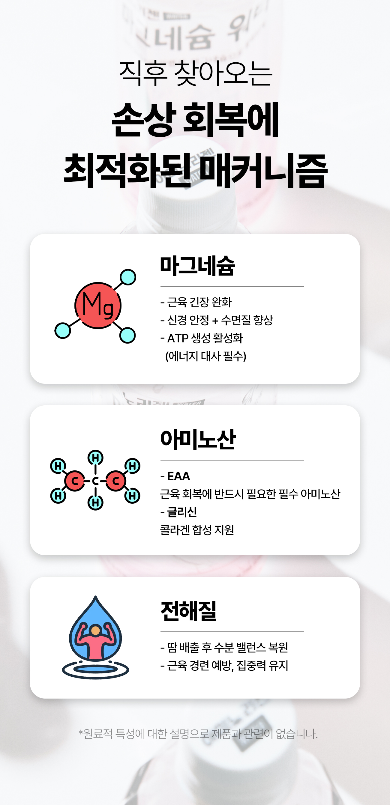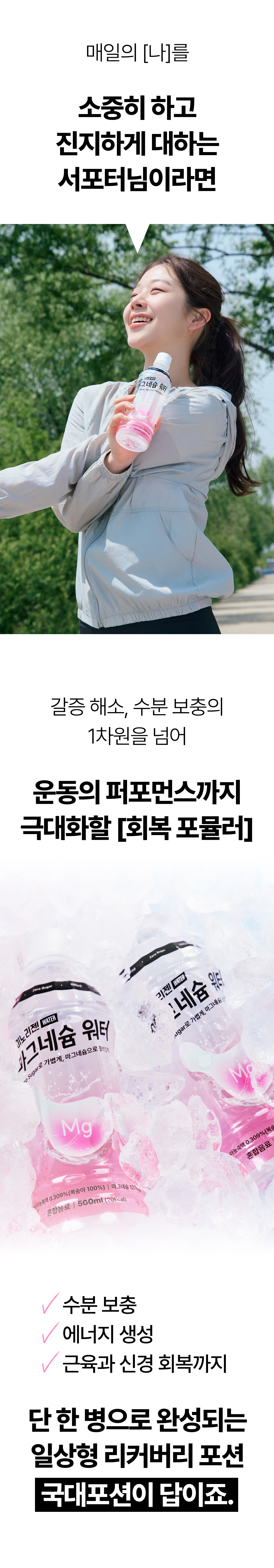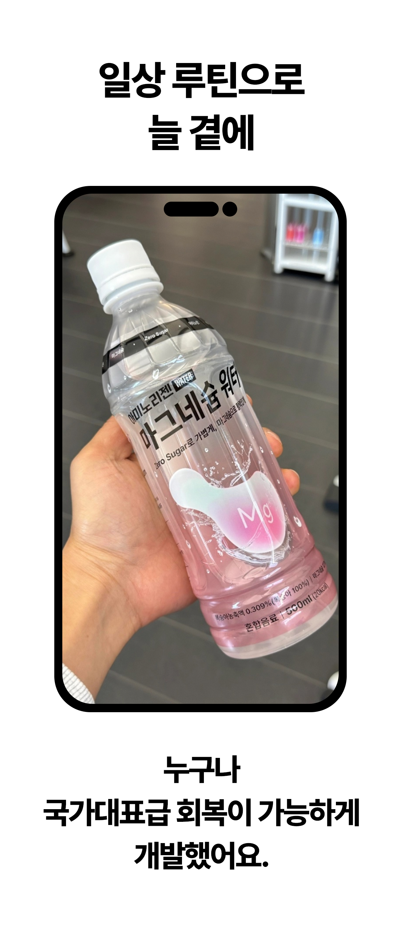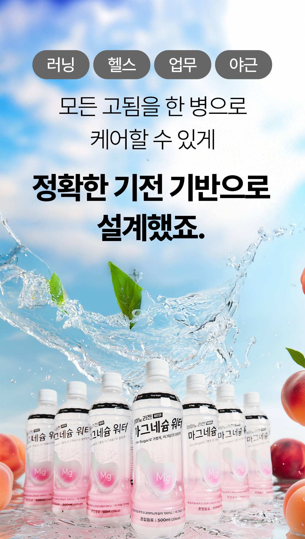 기존 마그네슘 제품이 알약, 분말, 무거운 기능성 중심이었다면 마그네슘 워터는 현대인의 라이프스타일에 맞춘 ‘음료형 웰니스 제품’입니다. 수면, 스트레스, 운동 후 피로 회복 등 회복이 필요한 모든 순간에 자연스럽게 스며들 수 있도록 기획했습니다.