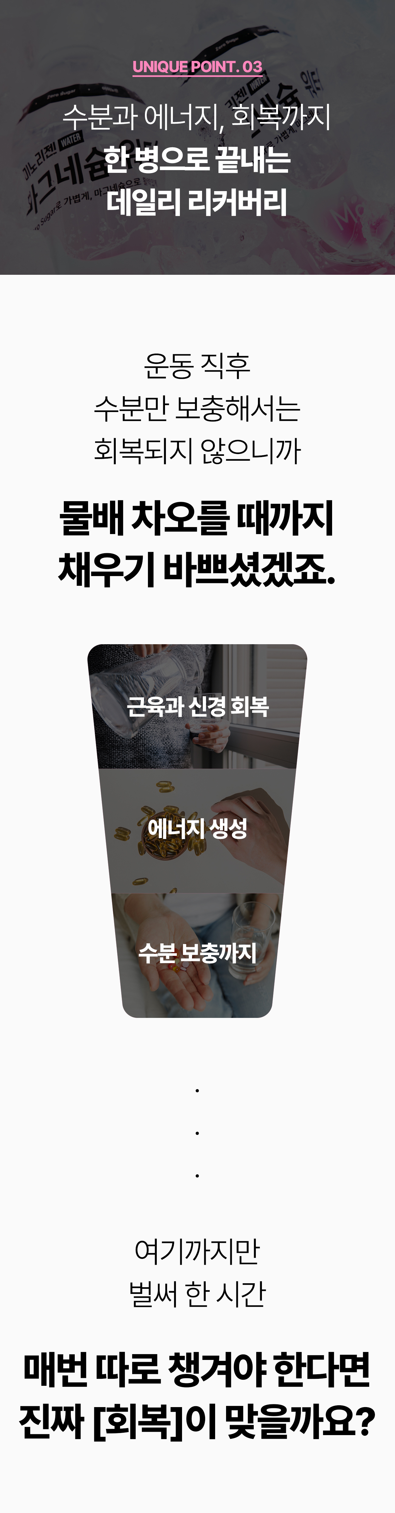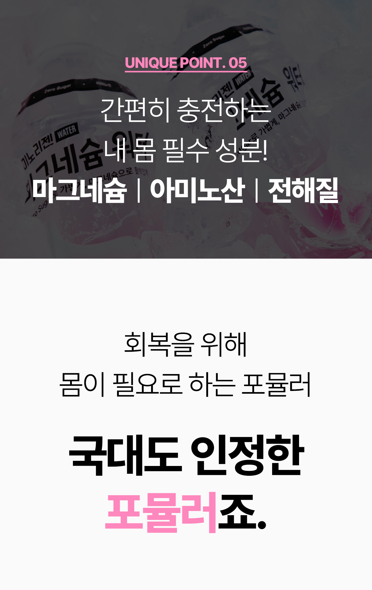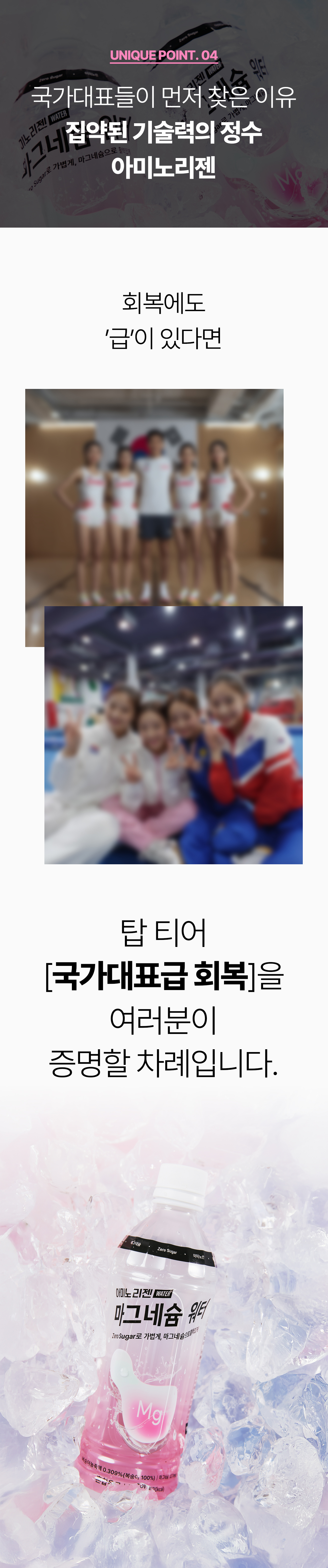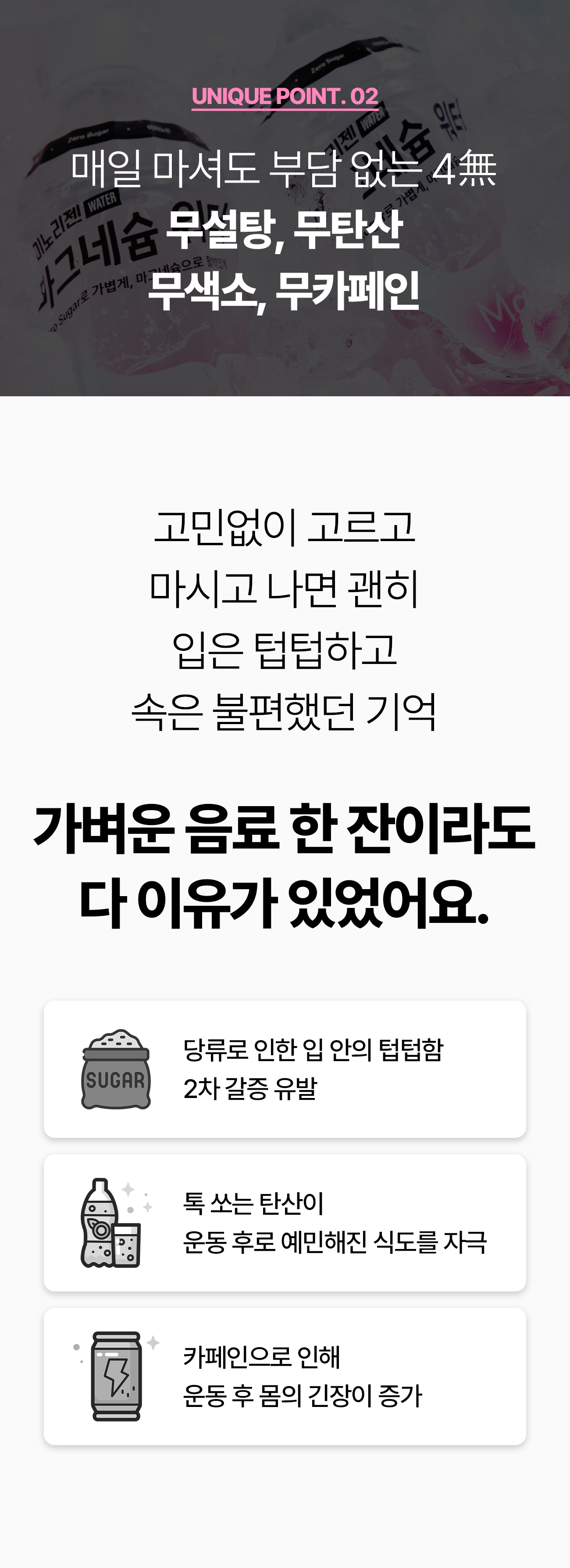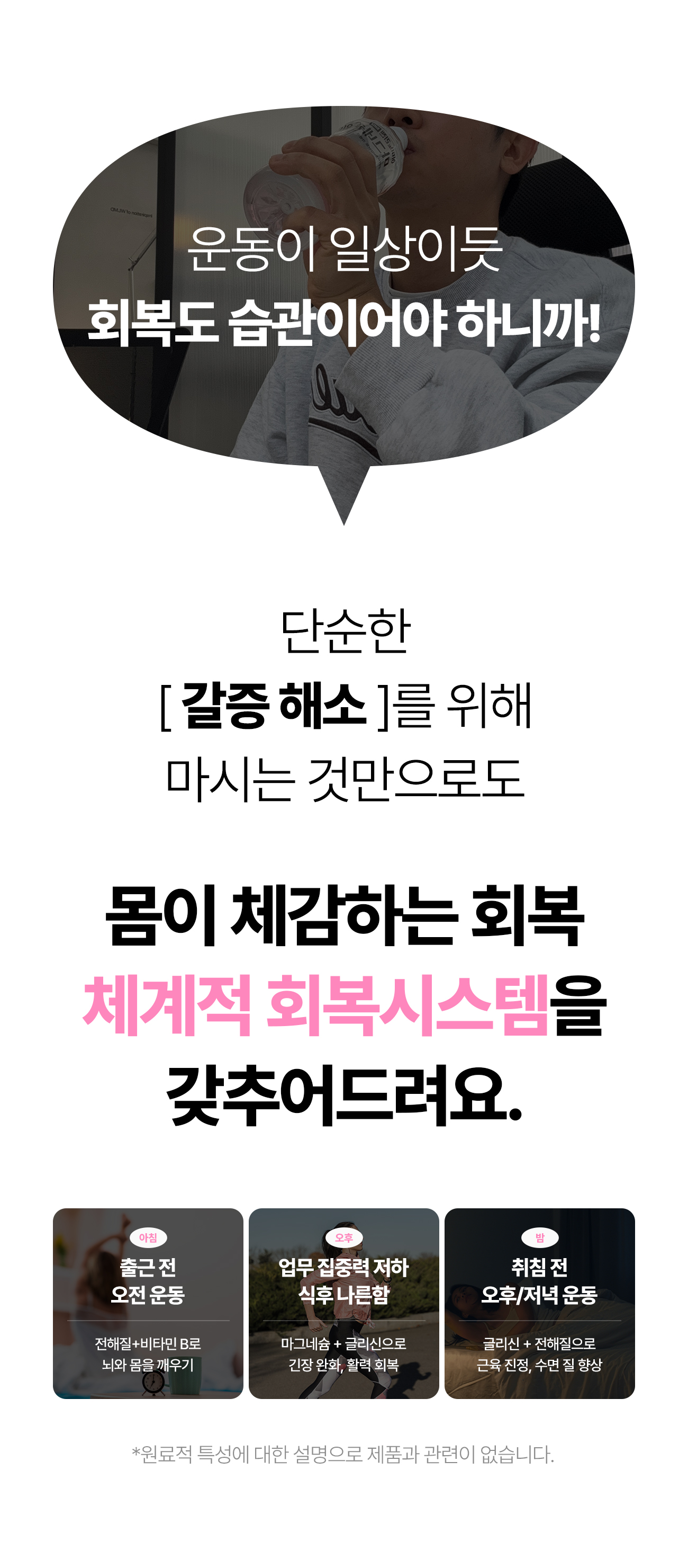 기존 마그네슘 제품이 알약, 분말, 무거운 기능성 중심이었다면 마그네슘 워터는 현대인의 라이프스타일에 맞춘 ‘음료형 웰니스 제품’입니다. 수면, 스트레스, 운동 후 피로 회복 등 회복이 필요한 모든 순간에 자연스럽게 스며들 수 있도록 기획했습니다.