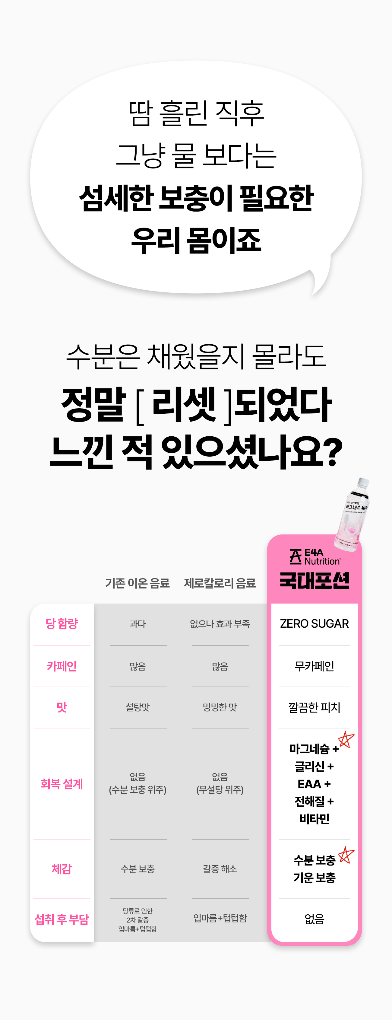 그래서 직접 스포츠인을 위한 브랜드를 만들겠다 결심했고 글로벌 스탠다드 안에서 안전한 성분과 확실한 효과를 기반으로 한 제품을 만들고자 'E4A'라는 브랜드를 시작하게 되었습니다.