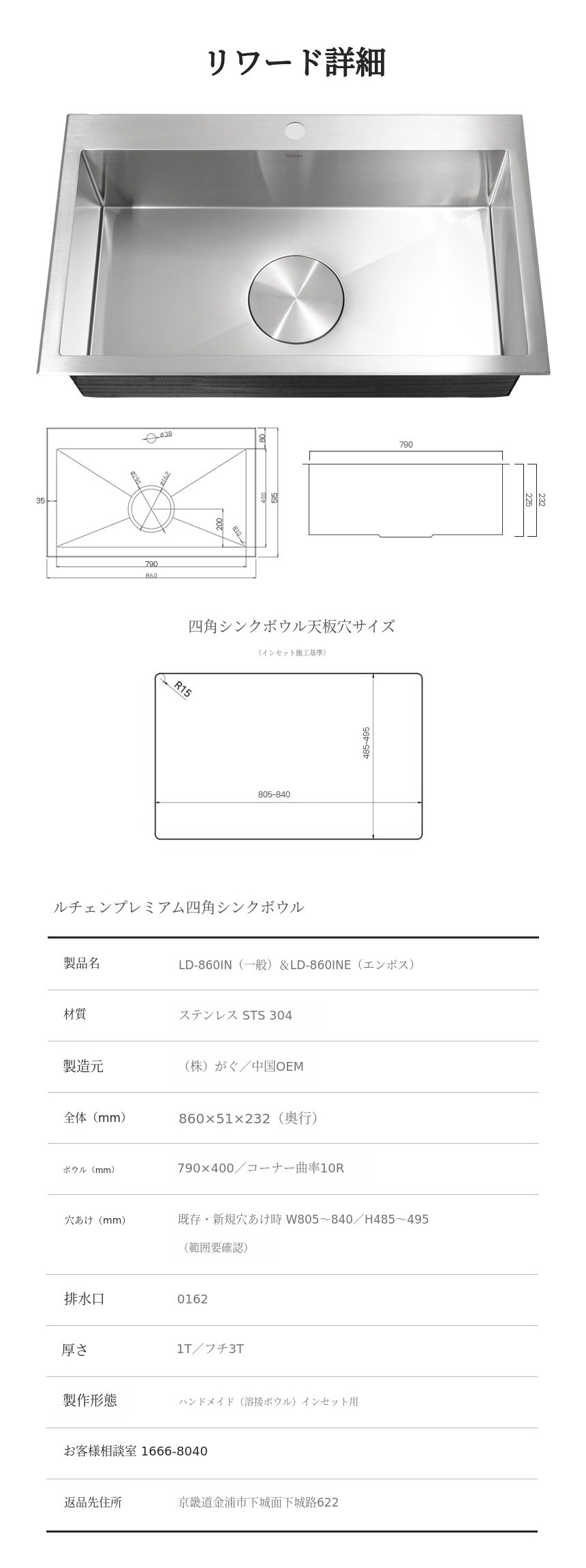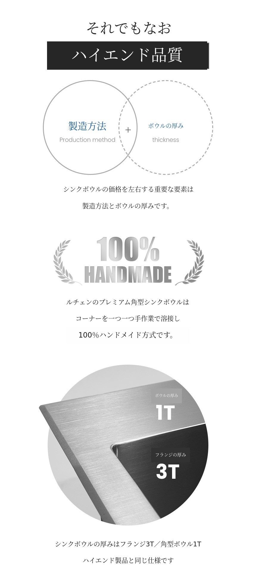 今回新たに発売するルチェン四角シンクボウルは、基本に忠実な設計と耐久性はもちろん、すでに市販されている他社のプレミアム製品と同等またはそれ以上の品質で製作されました。