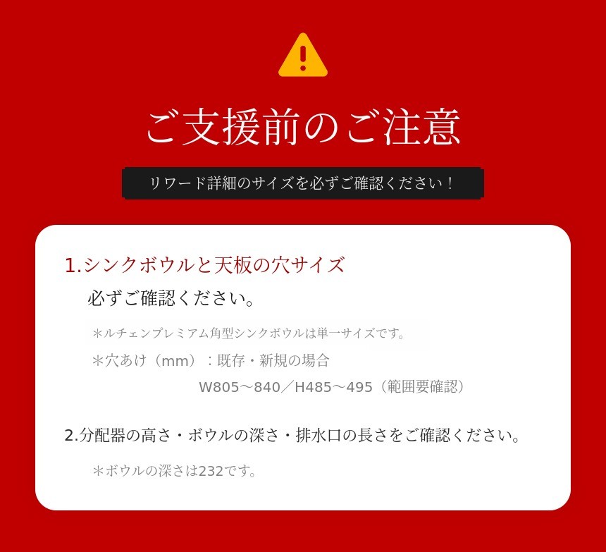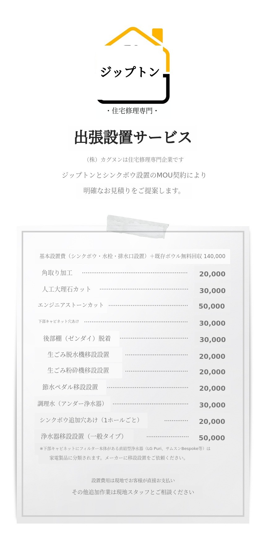 *設置スタッフ訪問後、サポーターの責任(シンクボウル情報の誤入力など)で設置できない場合、出張費が請求されることがあります。