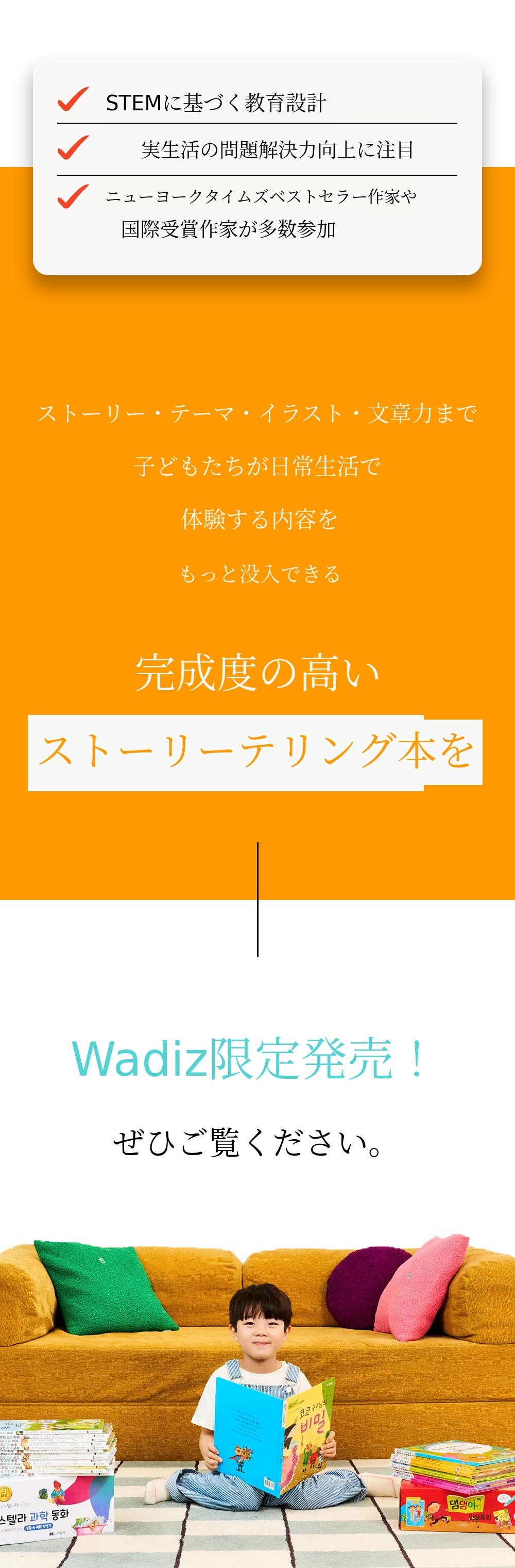 また、ライムブックは親会社である韓国ガウスとキウムブックスがクラウドファンディングWadizで資金調達した国内販売1位の書籍であるセイペン トントン伝来童話シリーズや、はじめてのスマート科学童話シリーズも共に展開しています。これらのシリーズはスマートラーニング時代に合わせてセイペン機能を搭載し、音声サポートはもちろん、目で読んで耳で聞く学習ができるよう企画されており、子どもたちの没入度と学習効率を高める点で大きな人気を集めています。