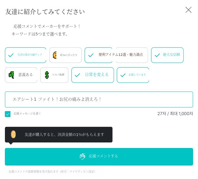 キーワードを選択後、[応援メッセージを書く]を書いて