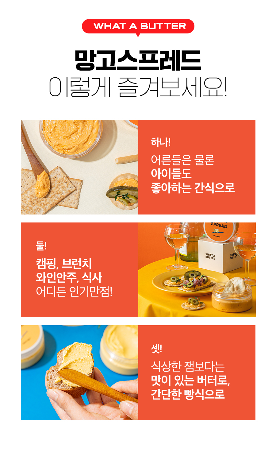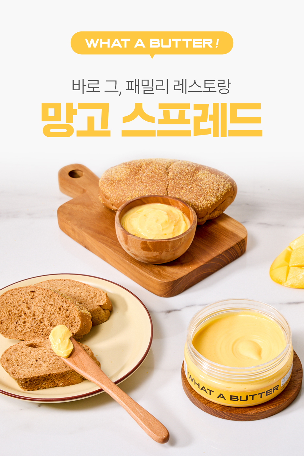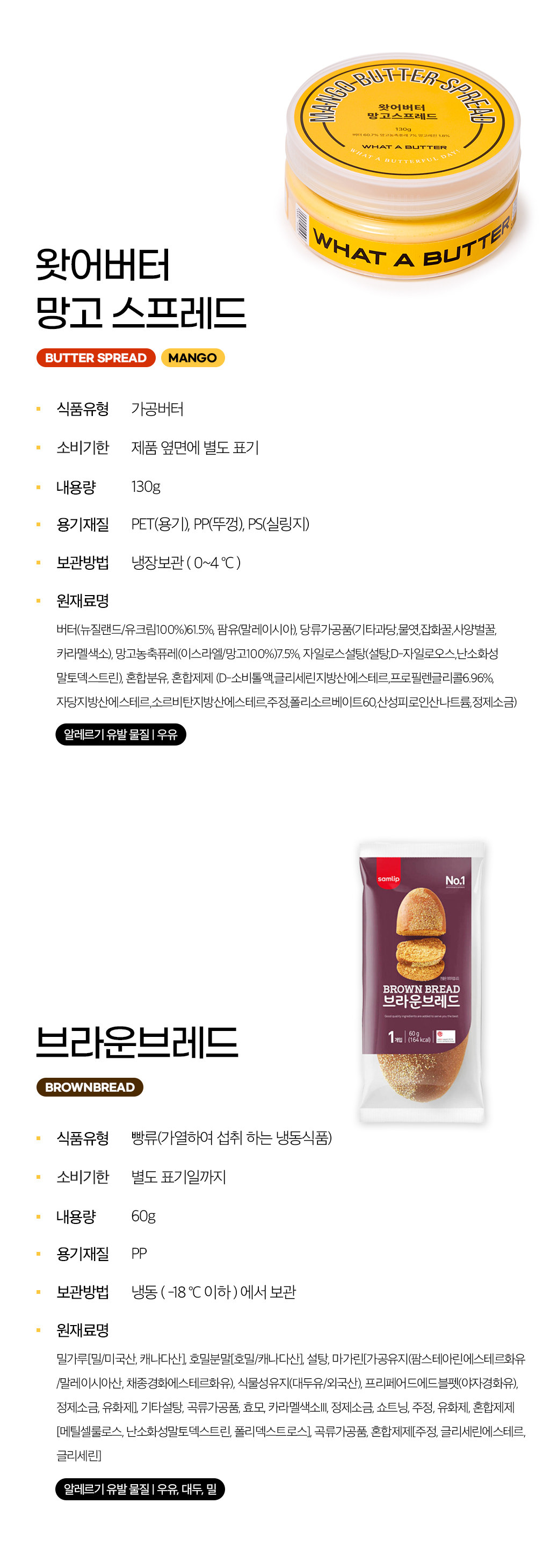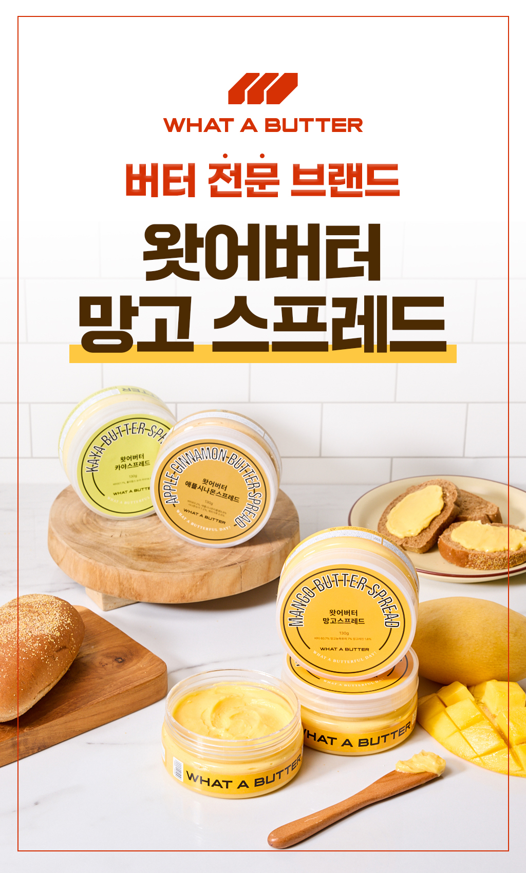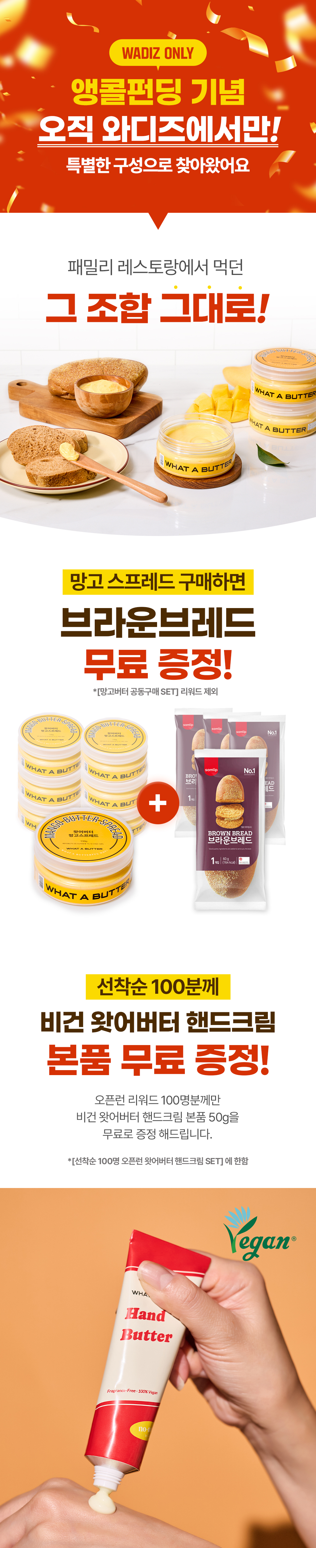 이번에 선보이는 프로젝트는!. 왓어버터의 베스트 셀러이자 시그니처 버터 '망고버터 스프레드'와 추가 무료 사은품으로 '브라운브레드'를 소개합니다. 기존에 망고 스프레드하면 떠오르는 그 브라운브레드를 SPC 삼립 제품으로 준비하였습니다. 서포터 경험을 확장하자는 취지에서 집에서도 손 쉽게 즐기는 레스토랑 식전빵&버터 조합을 준비하게 되었습니다.