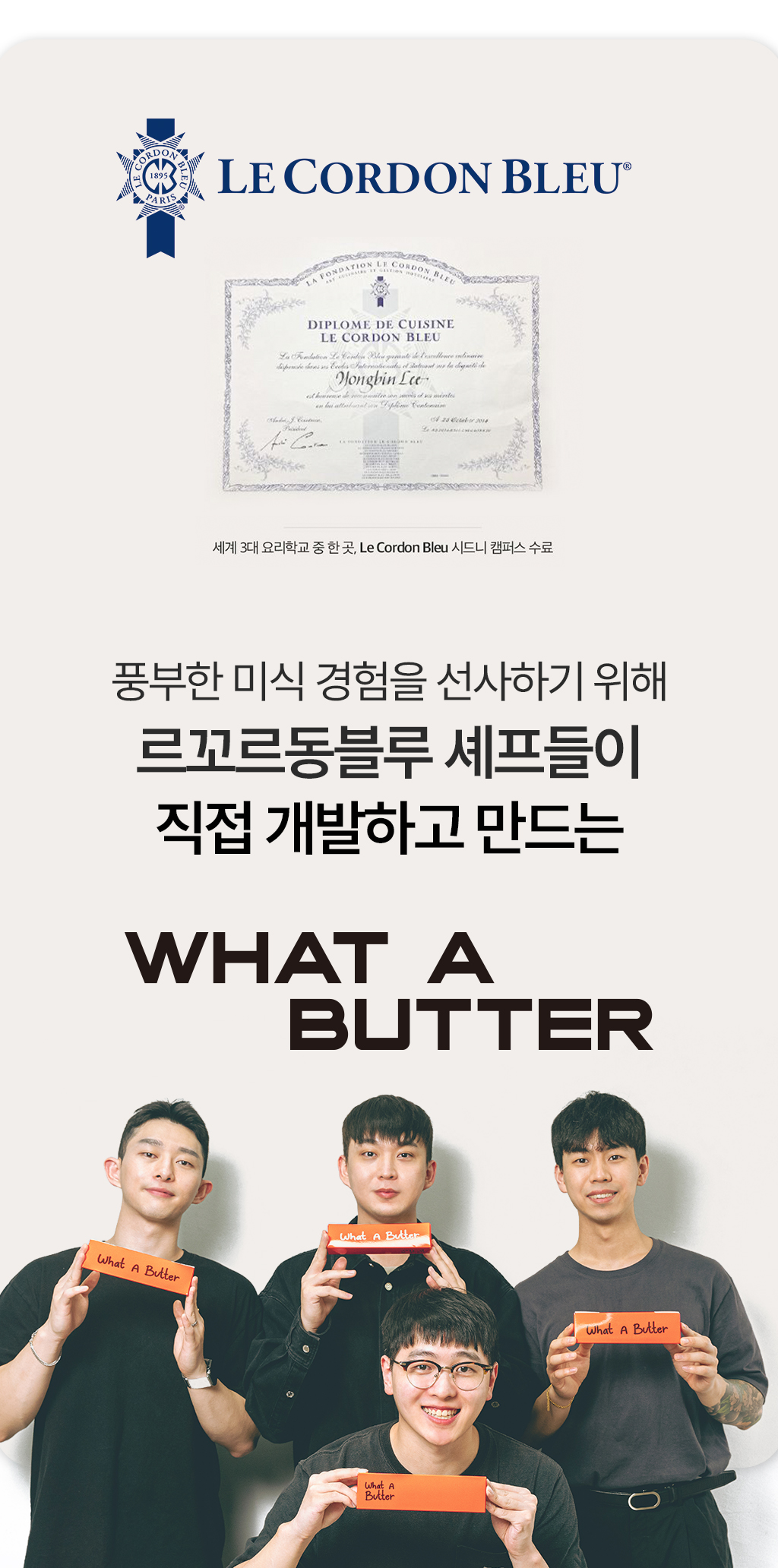왓어버터 브랜드를 운영을 하고 있는 디오티컴퍼니입니다.DOT는 'Draw Our Trend'의 약자로서 말 그대로 우리의 트렌드를 그리다! 라는 의미를 담고 있습니다.그에 맞게 저희는 버터 식문화에 새로운 트렌드를 그려볼까 합니다. 디오티컴퍼니 팀원들은 세계 3대 요리학교 'Le Cordon Bleu'에서 culinary art를 전공하고 셰프로서 일을 하며 세계 각국의 다양한 맛의 버터를 경험하게 되었습니다.국내 소비자들과 함께 저희가 경험하였던 새로운 버터 문화를 공유하고 즐기고자'WHAT A BUTTER'라는 버터 전문 브랜드를 런칭하게 되었습니다.
