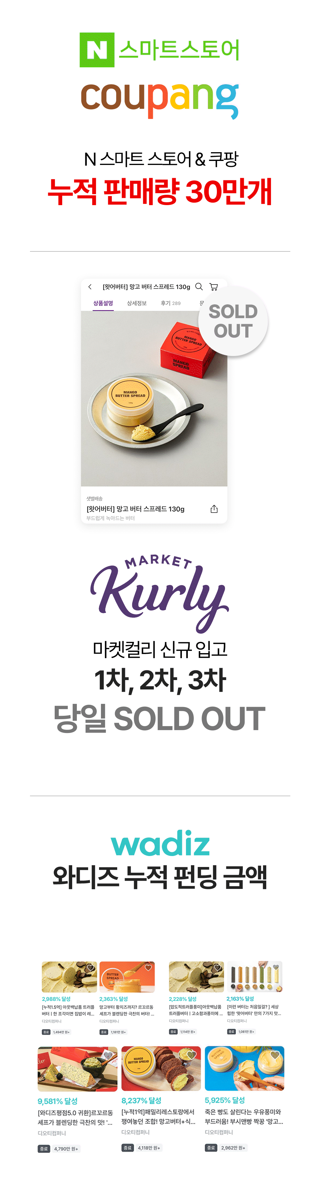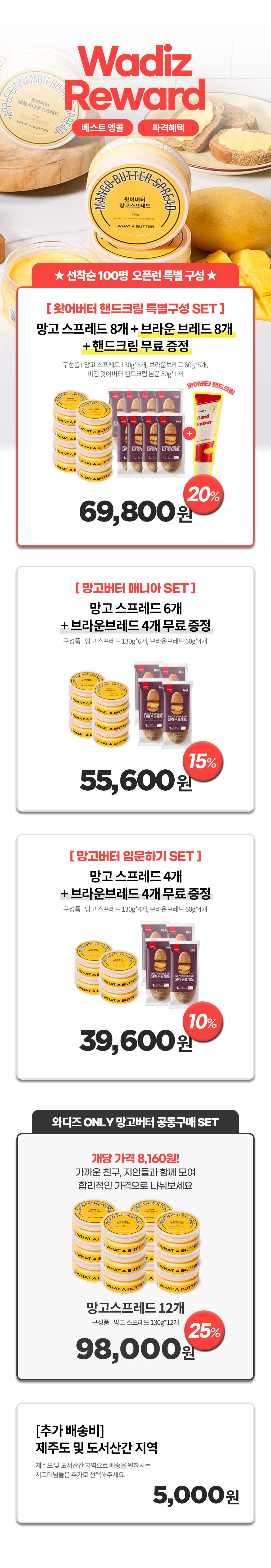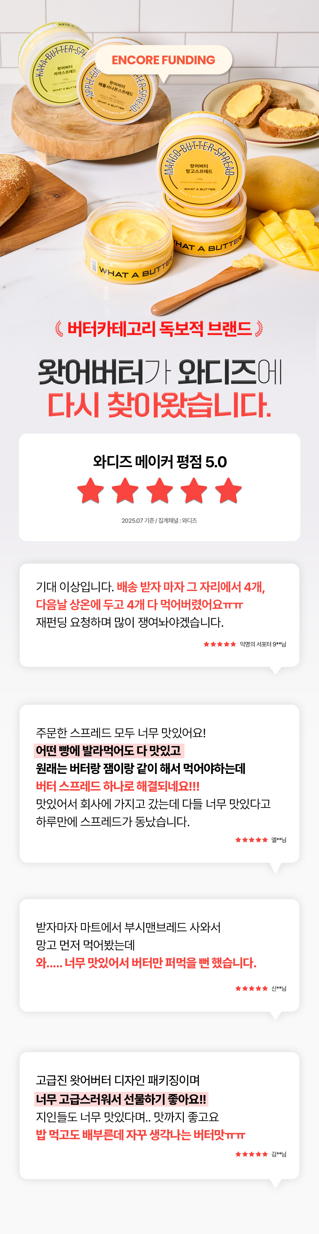왓어버터의 첫 시작은 와디즈였습니다. 벌써 10번의 프로젝트를 서포터님들의 많은 지지와 관심으로 성공적으로 펀딩을 진행했습니다! 그 중 가장 앵콜요청이 많았던 왓어버터 시그니처 버터 '망고 스프레드'와 함께 다시 찾아 오게 되었습니다. 오직 와디즈 서포터님들을 위한 특별한 할인혜택으로 리워드 구성을 제공하려고 합니다.