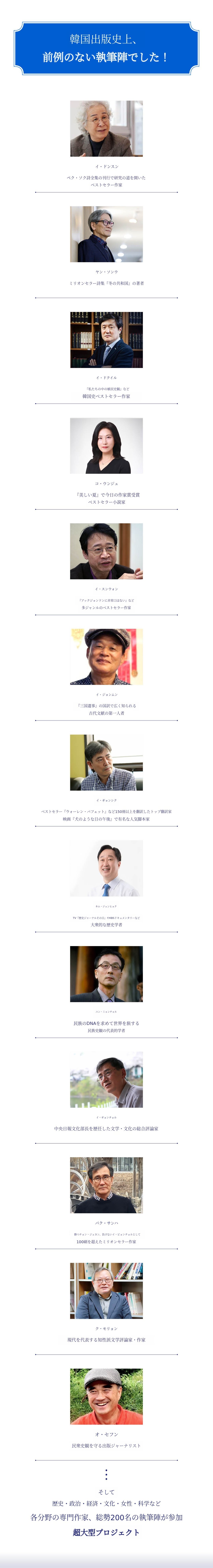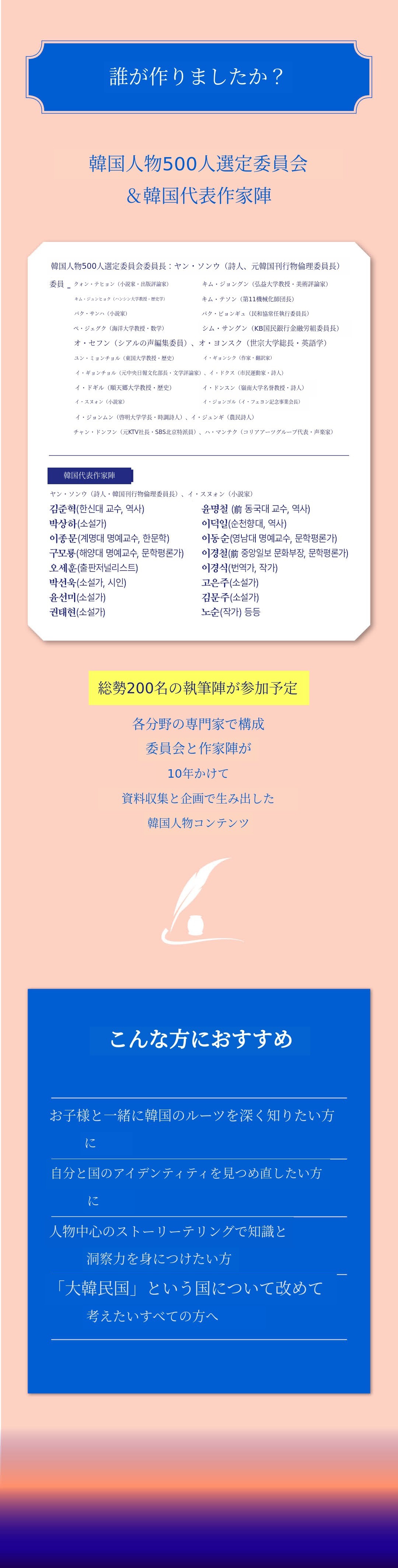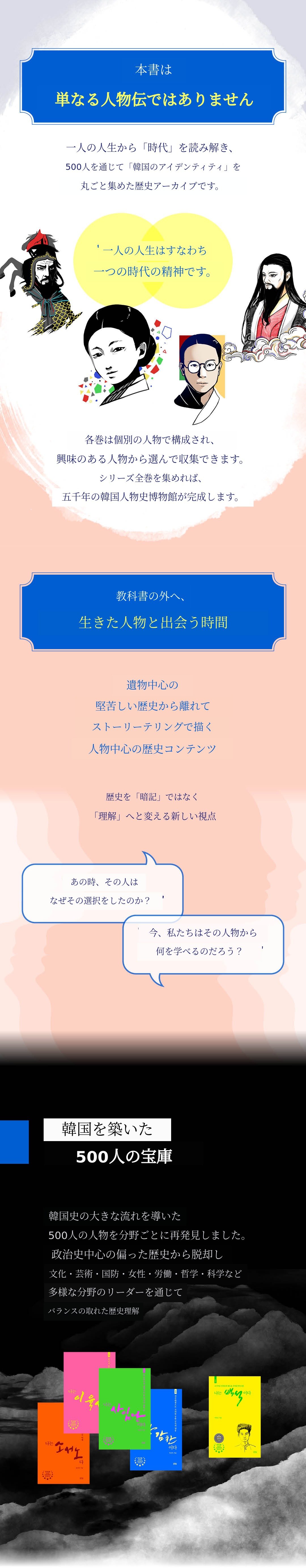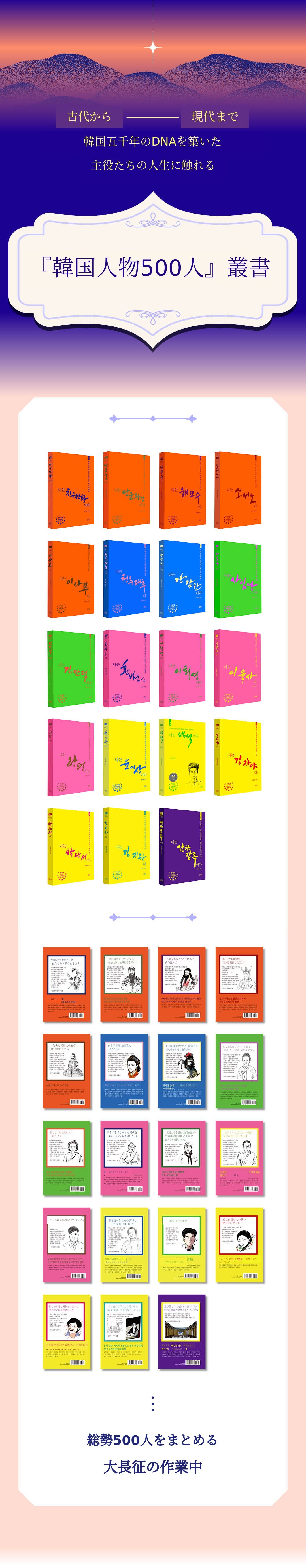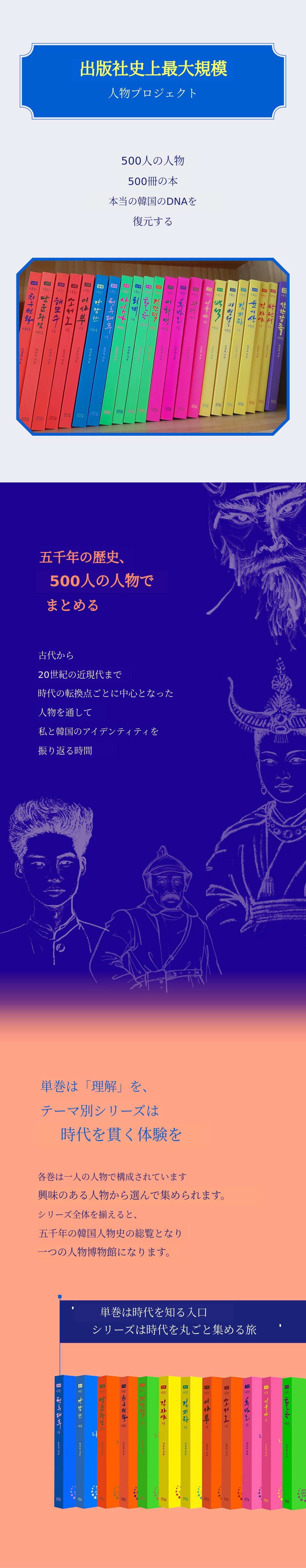 大韓民国の形成過程は、古くから韓民族の威厳を示した先祖から始まったと考えます。現在を生きるすべての方々にもう一度勇気を与えられる伝記形式の「韓国人物500」叢書を作っていく予定です。サポーターの皆様の多くのご支援とご関心をお願いいたします。ありがとうございます。