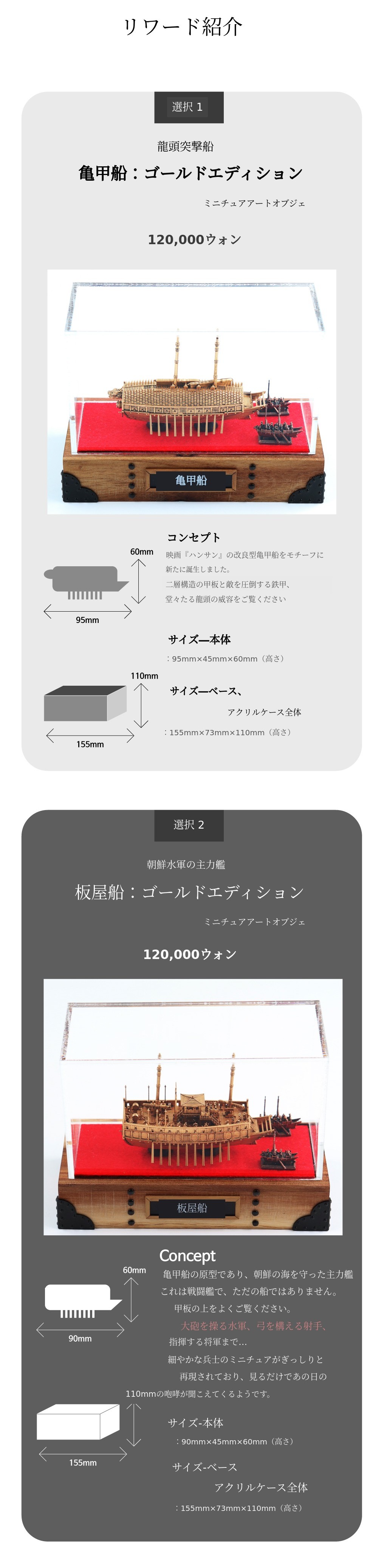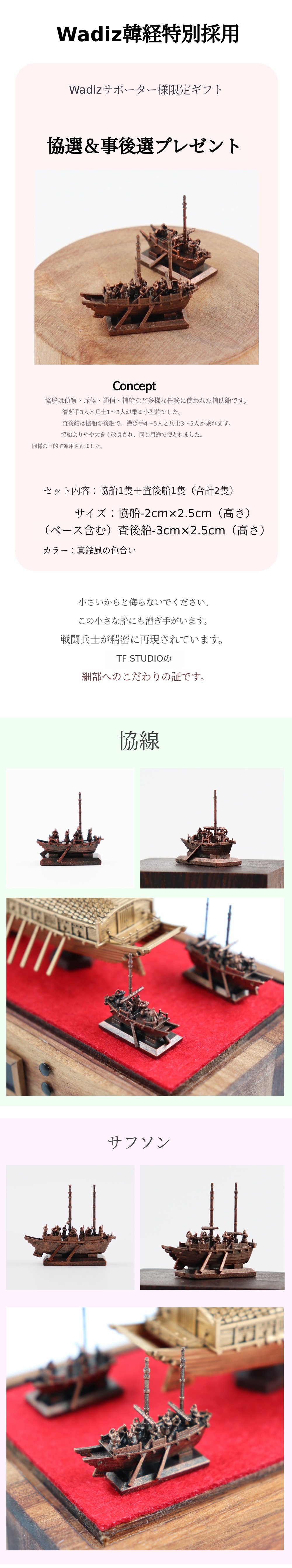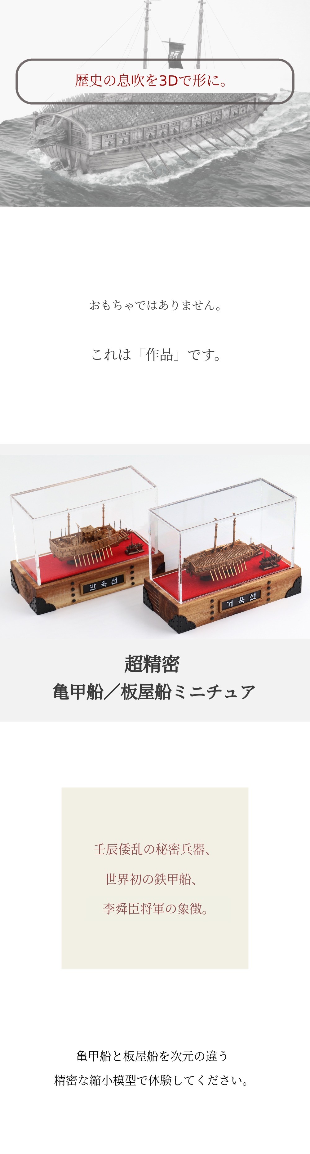1. 🛡️ 亀甲船と板屋船のミニチュア作品 - 壬辰倭乱の秘密兵器を精密再現します 2. 🎨 歴史的価値と芸術性 - 単なる玩具ではなく3D超精密作品です 3. 🎁 限定サポーター特典 - 協船と使後船のミニチュアを無料贈呈します