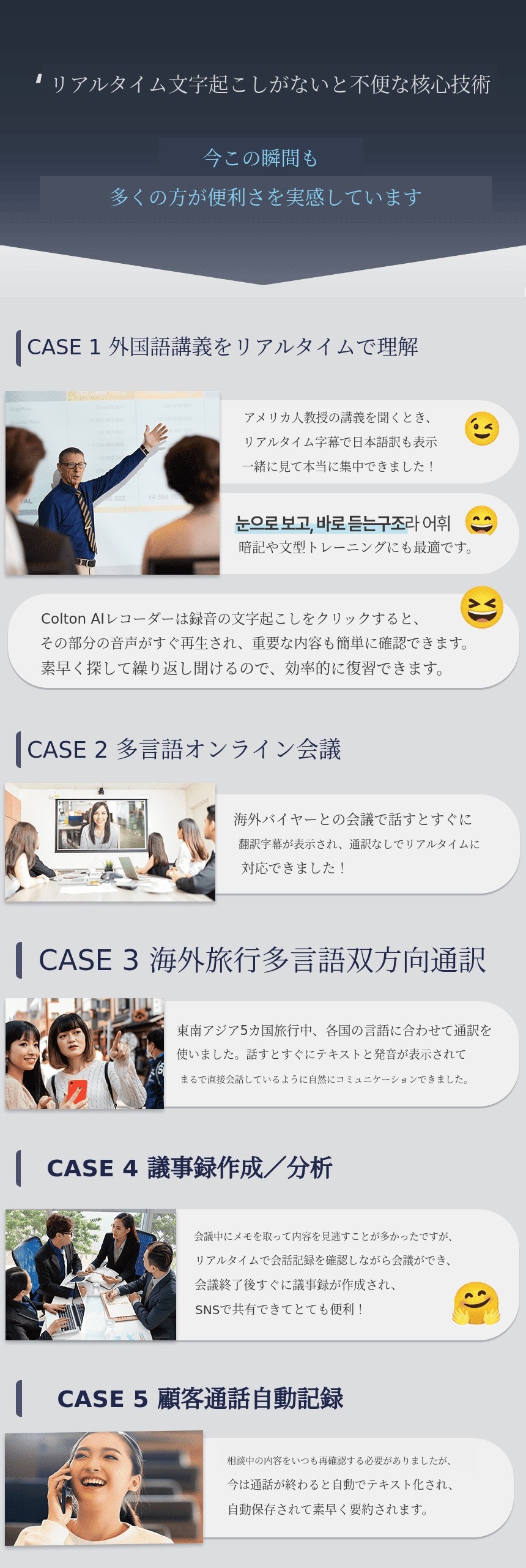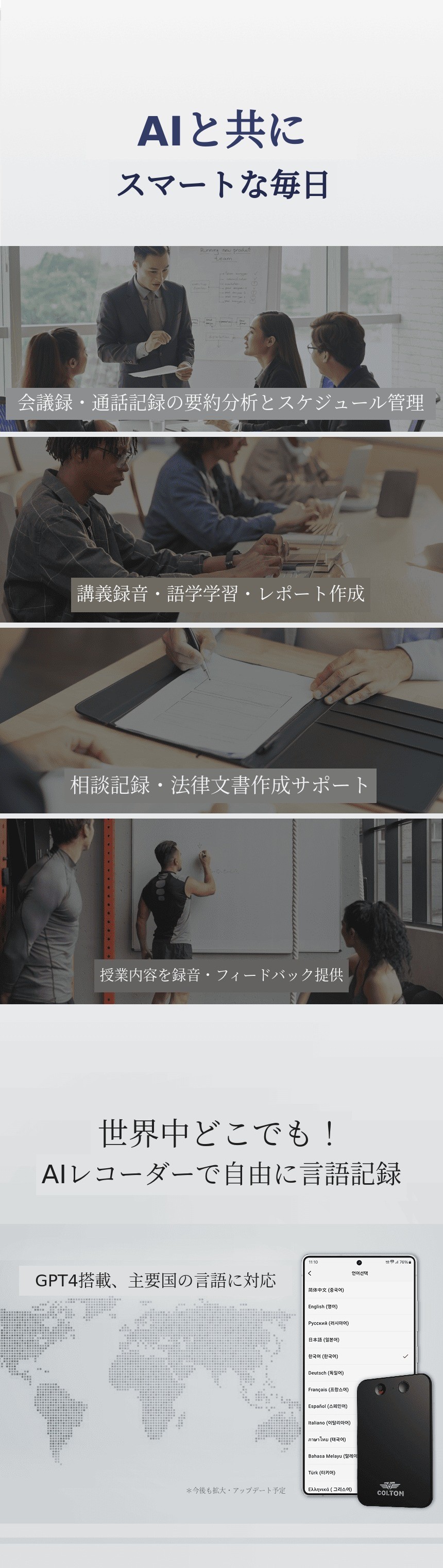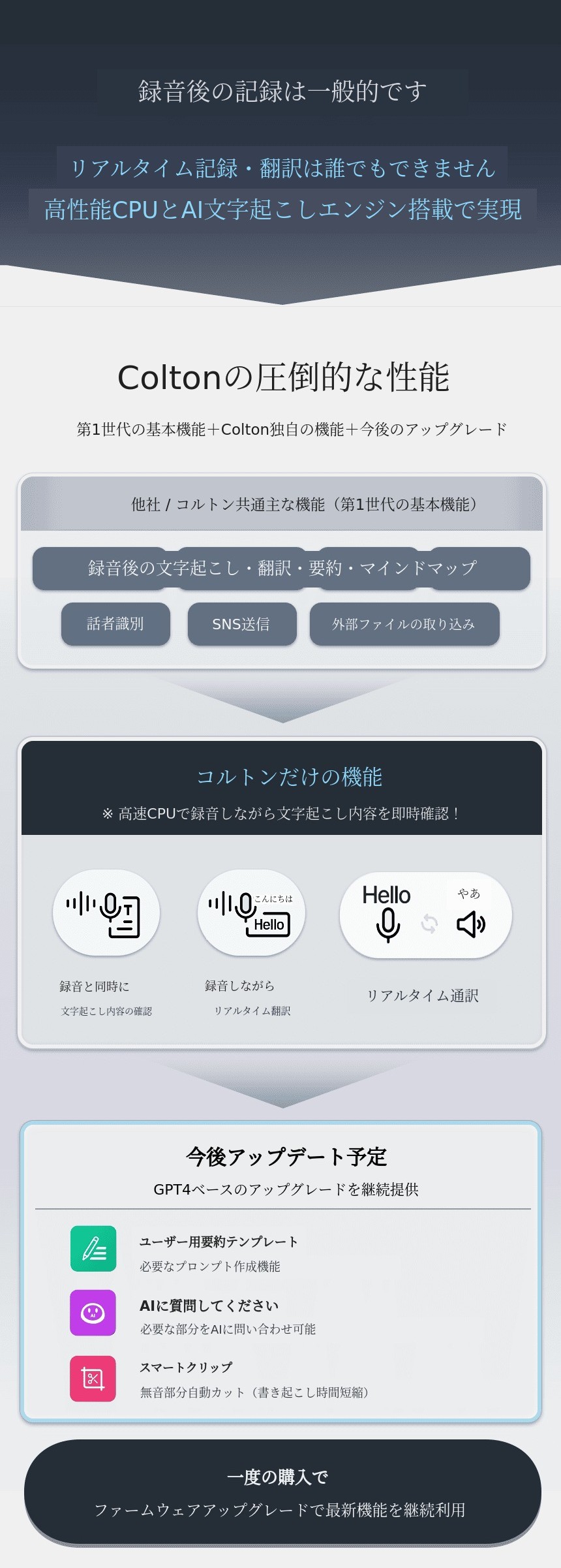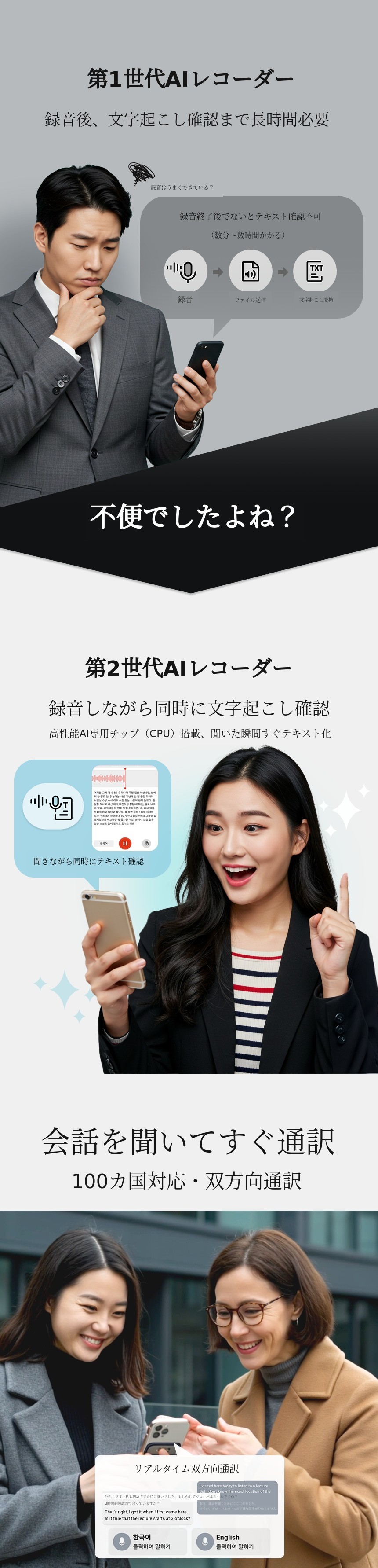 1. 🎙️ GPT-4 AI録音機 - リアルタイムで文字起こしと翻訳が可能です 2. ⚡ 即時記録と通訳 - 話すと同時にテキスト変換と100カ国の通訳対応です 3. 💸 限定特典付き販売 - 128GB大容量と特別割引のセット販売です