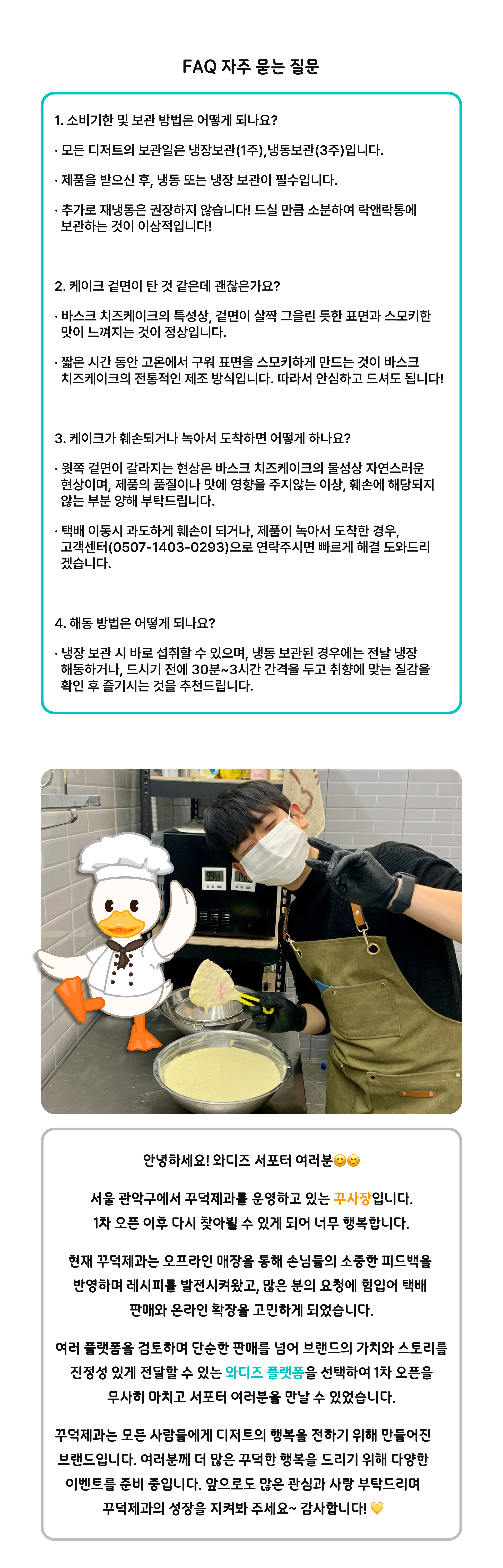 1. 🍰 濃厚なバスクチーズケーキ - クリーミーで滑らかな高級デザートです 2. 📦 ソウル配達1位デザート - 配達アプリで2年半4.9点以上維持です 3. 🎁 ワディズ限定特別企画 - 限定数量の特別セット販売です