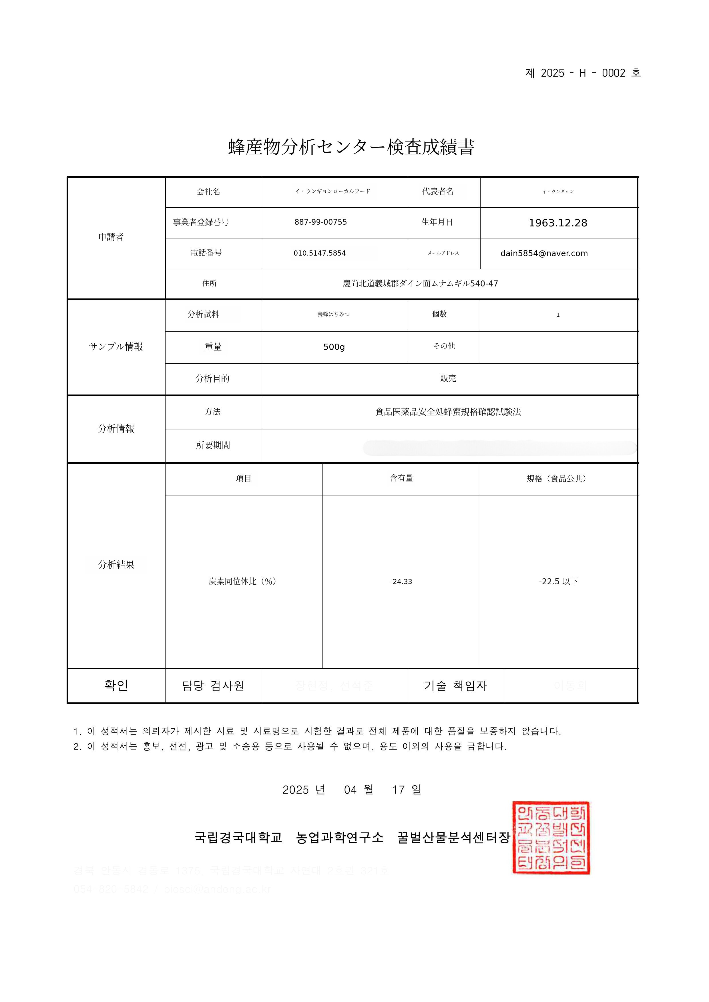 25年試験検査成績書(イ・ウンギョンス熟成蜂蜜 炭素同位体比 -24.33‰)
