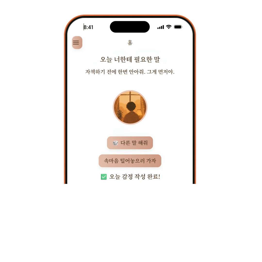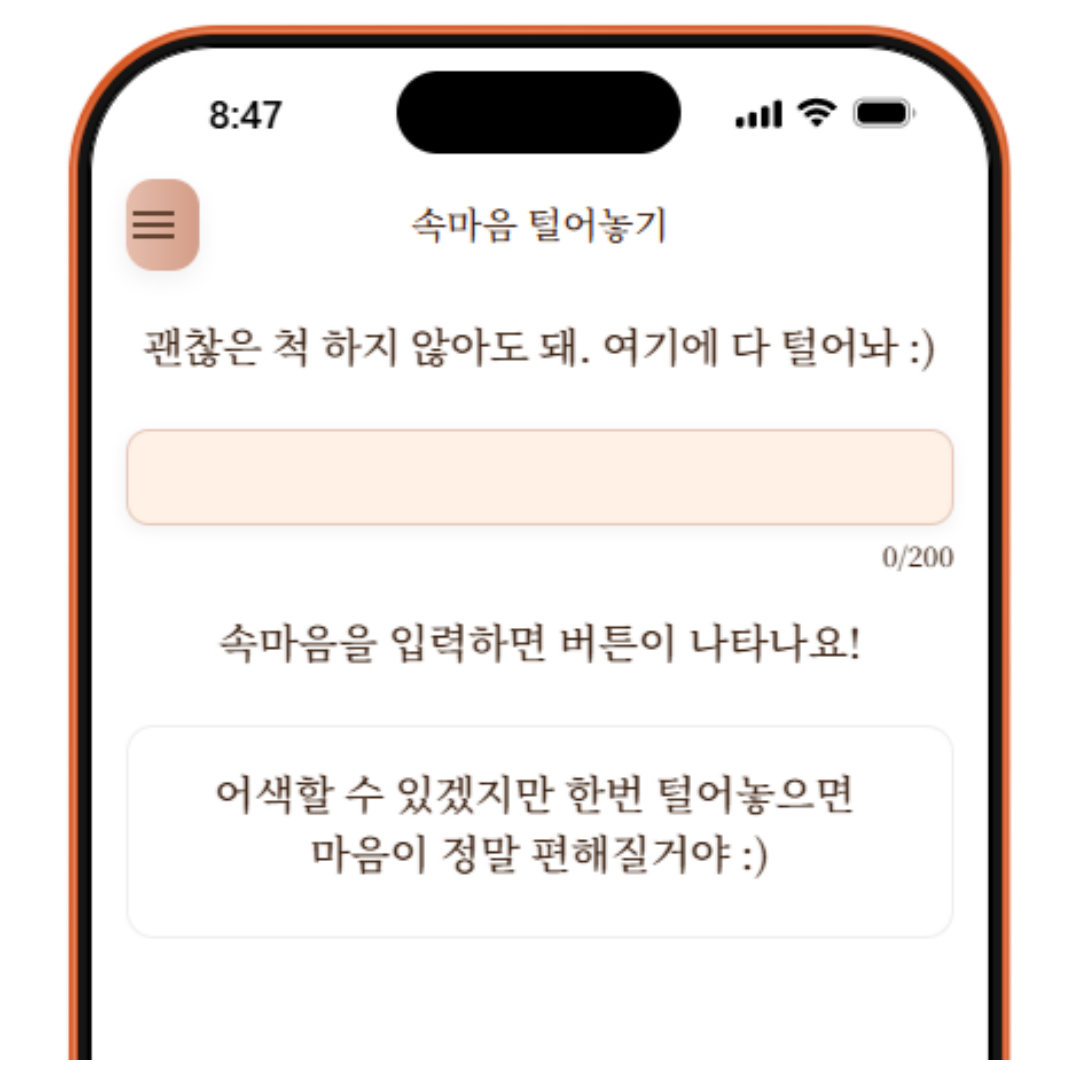 툭 털어놓고, 위로만 받고, 기록 없이 떠날 수 있어요.