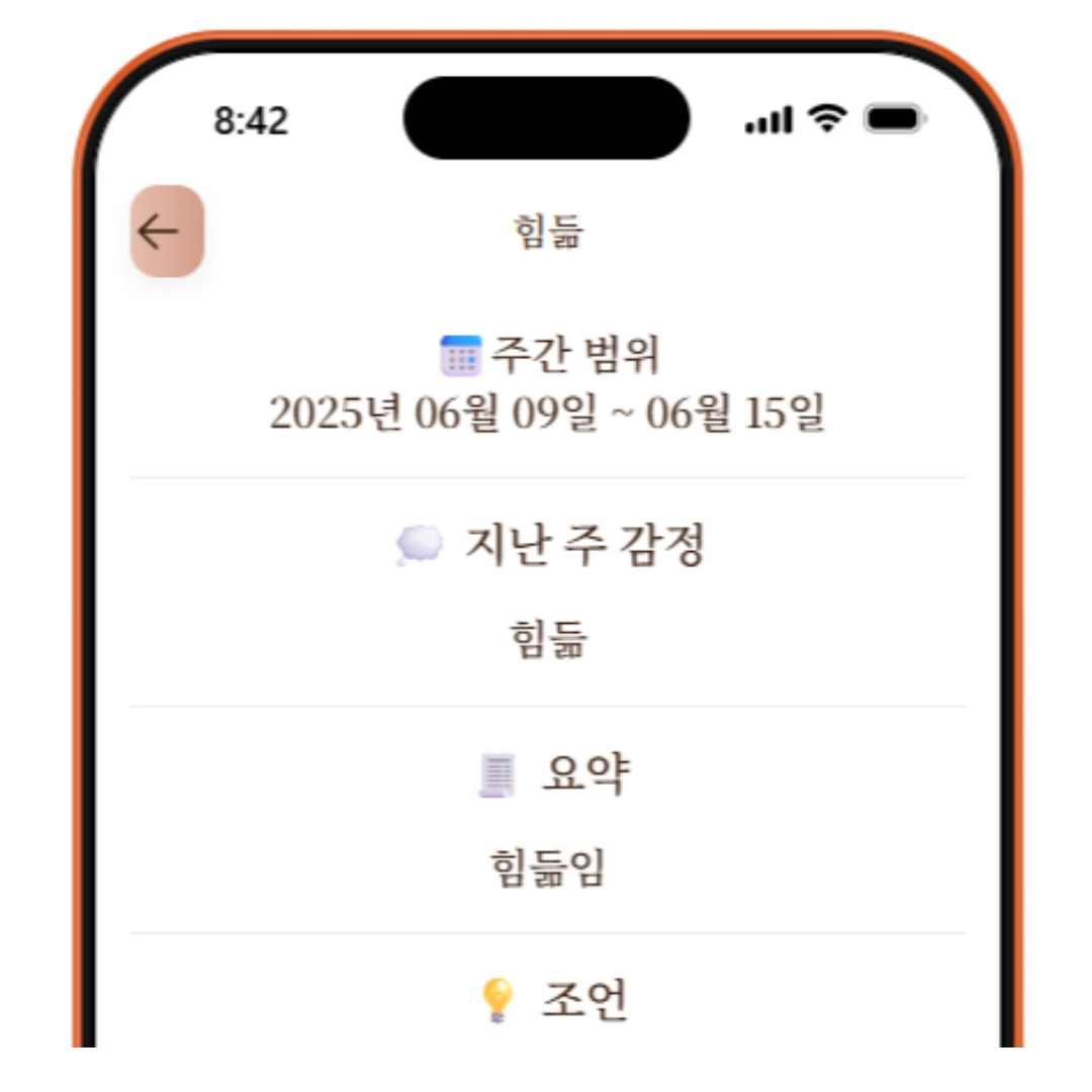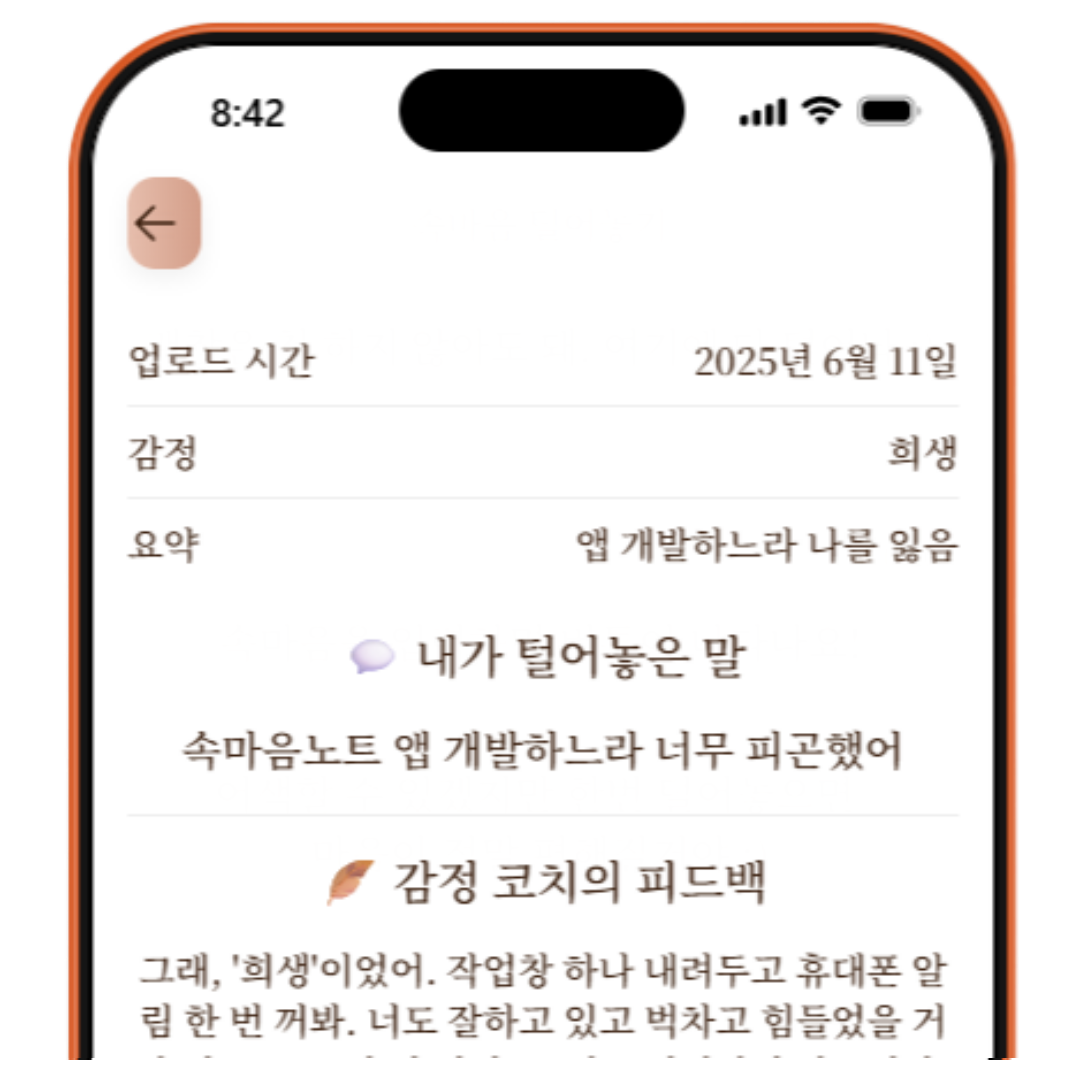 하지만 속마음 노트는 감정 기록, 분석, 요약, 위로, 히스토리 저장까지 자동으로 해줍니다.