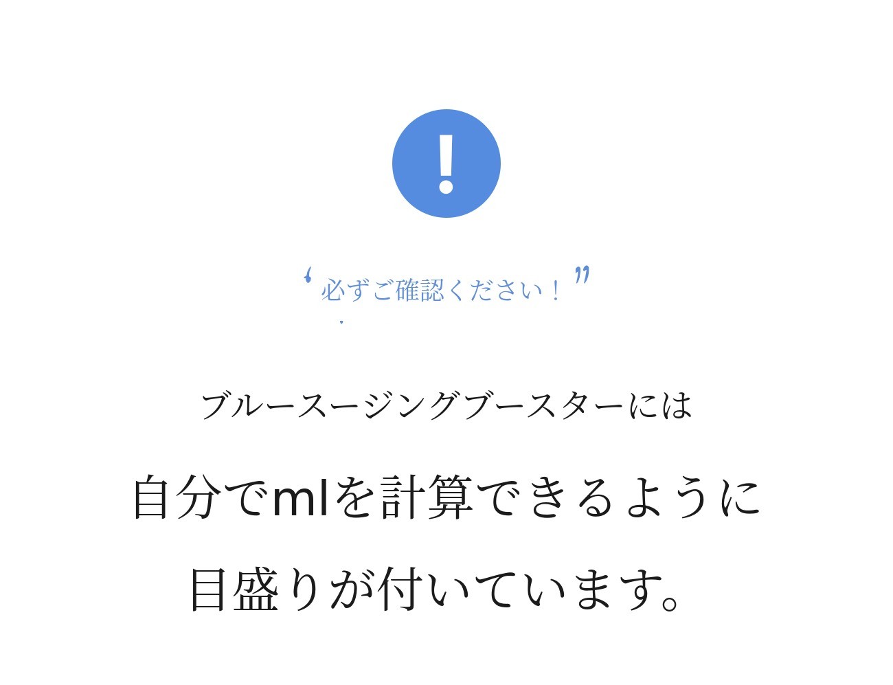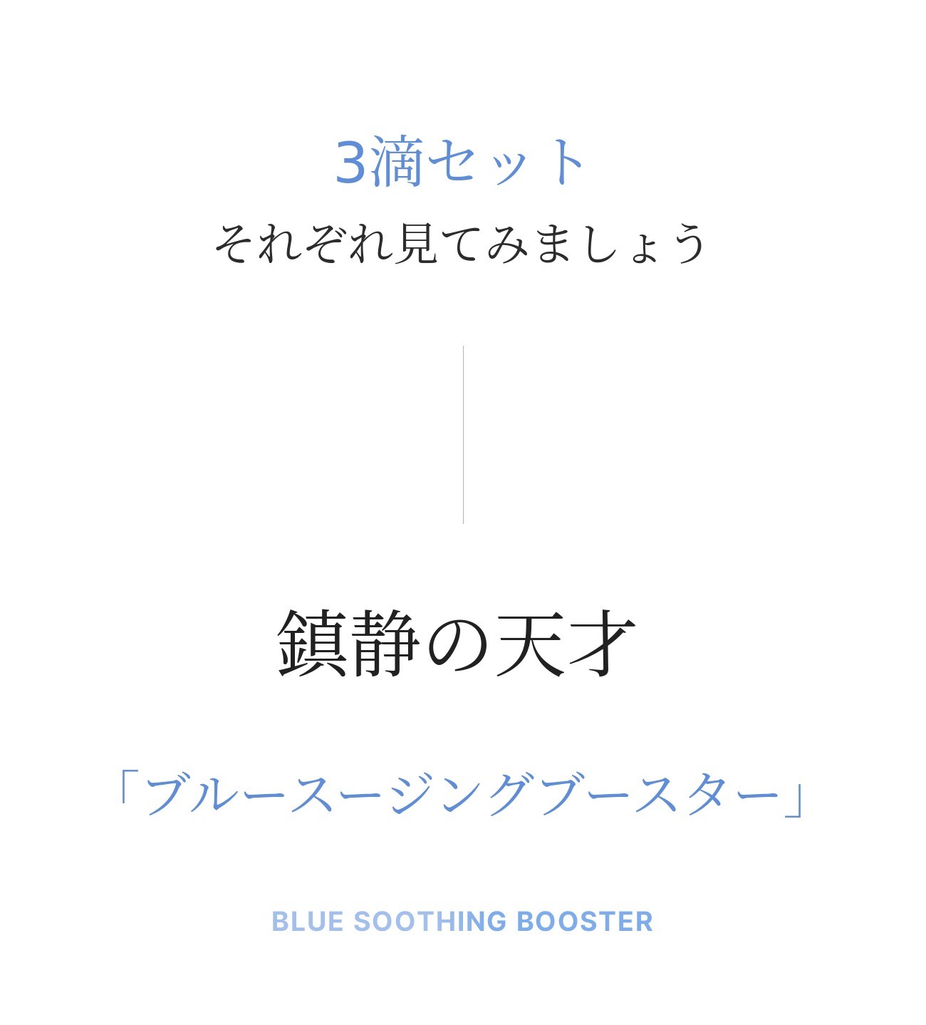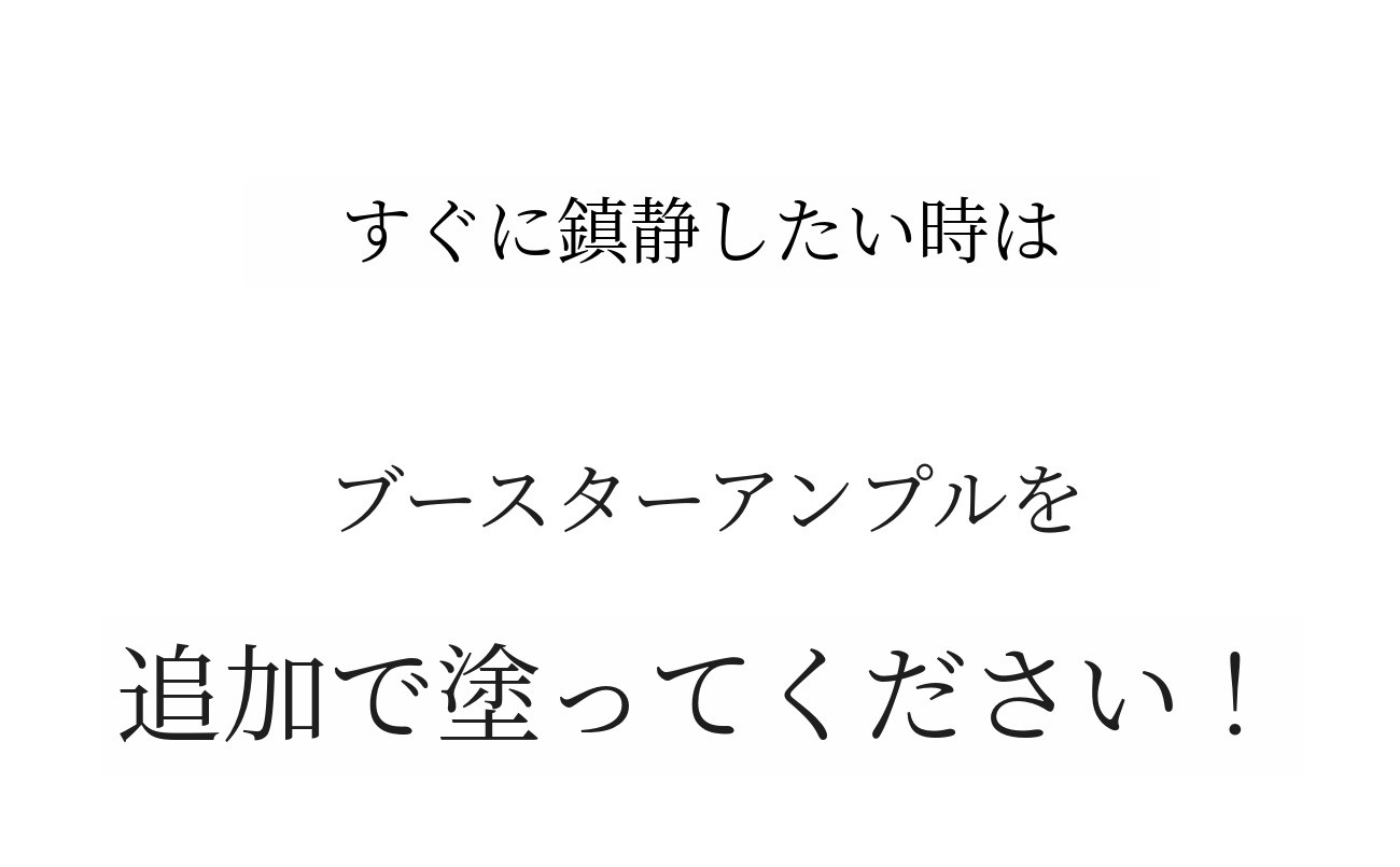 - 「ブルースージングブースター」はカモミールから抽出した高濃度ブルーアズレン成分が含まれているため、単独で使用した場合一時的に青みがかることがありますが、使用後しばらくすると消えます。集中鎮静のために単独で追加塗布する場合は夜のご使用をおすすめします。