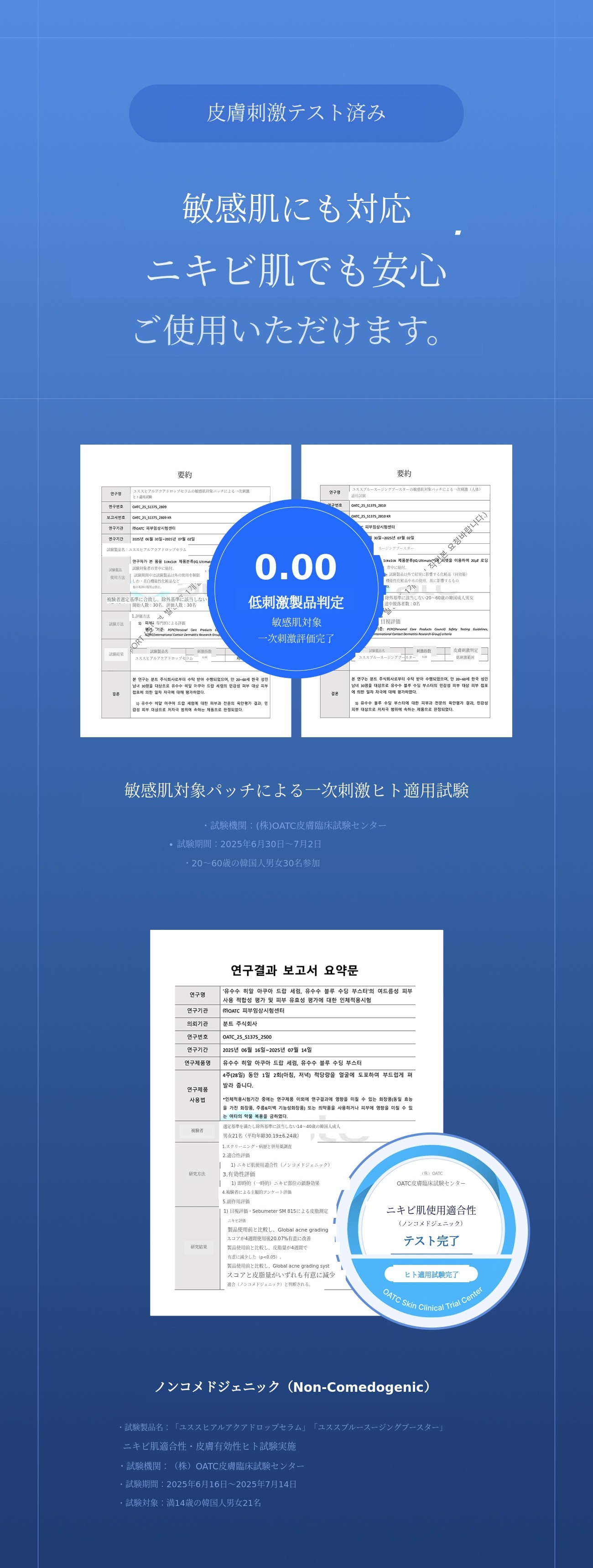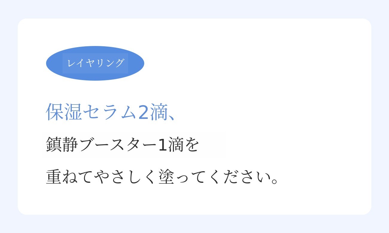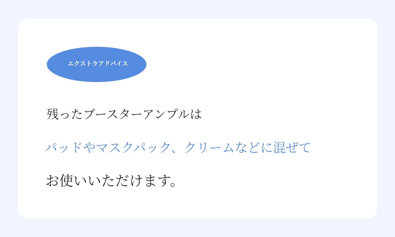 - 「ブルースージングブースター」はカモミールから抽出した高濃度ブルーアズレン成分が含まれているため、単独で使用した場合一時的に青みがかることがありますが、使用後しばらくすると消えます。集中鎮静のために単独で追加塗布する場合は夜のご使用をおすすめします。