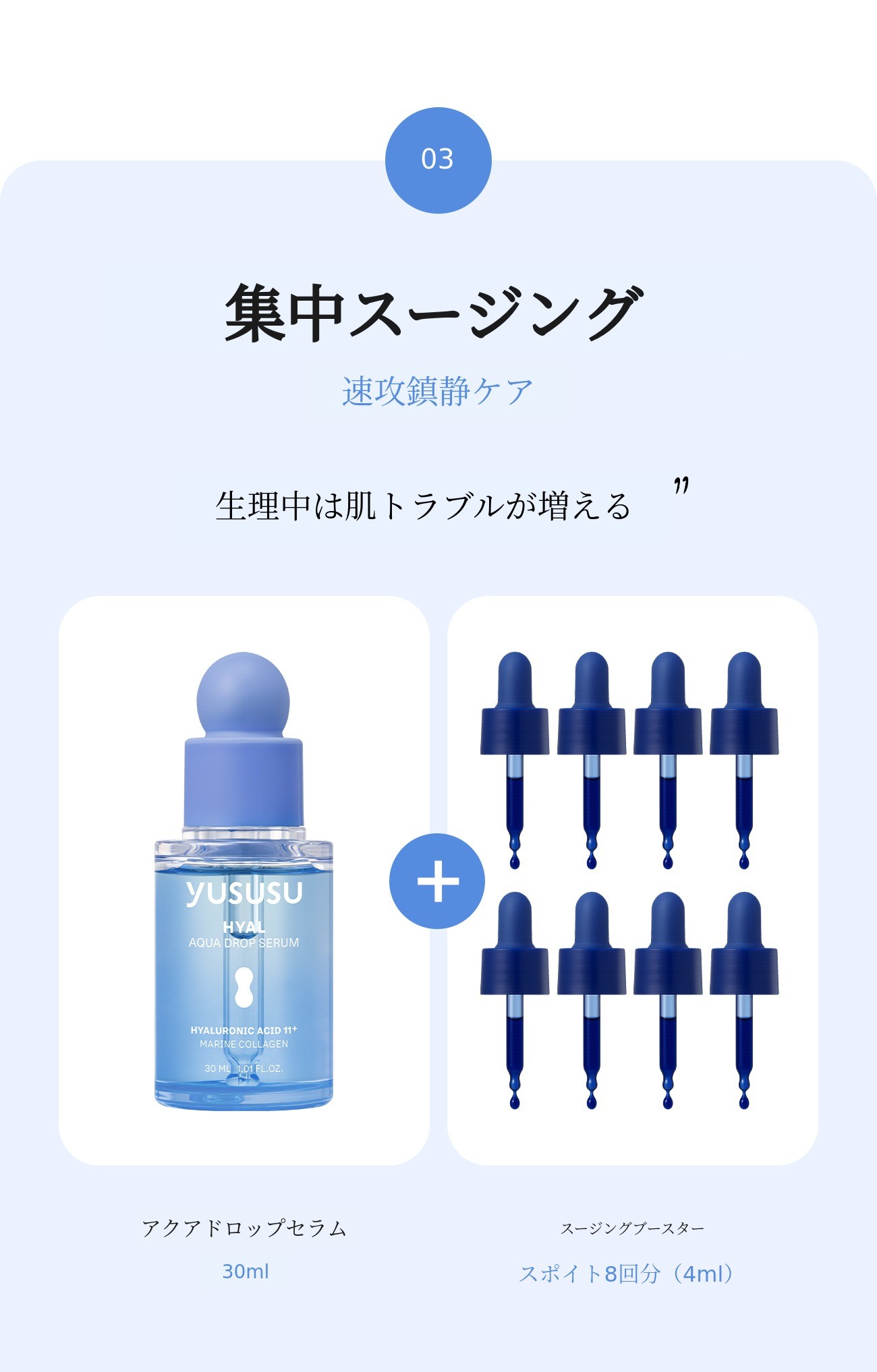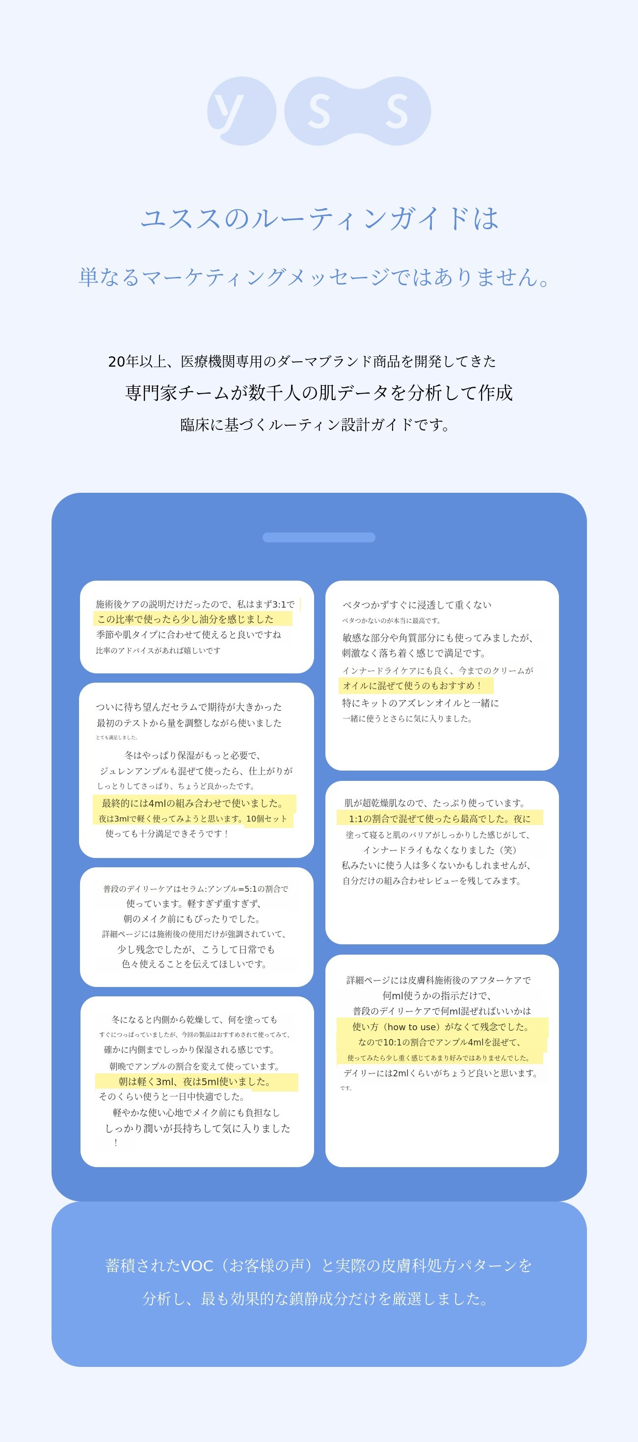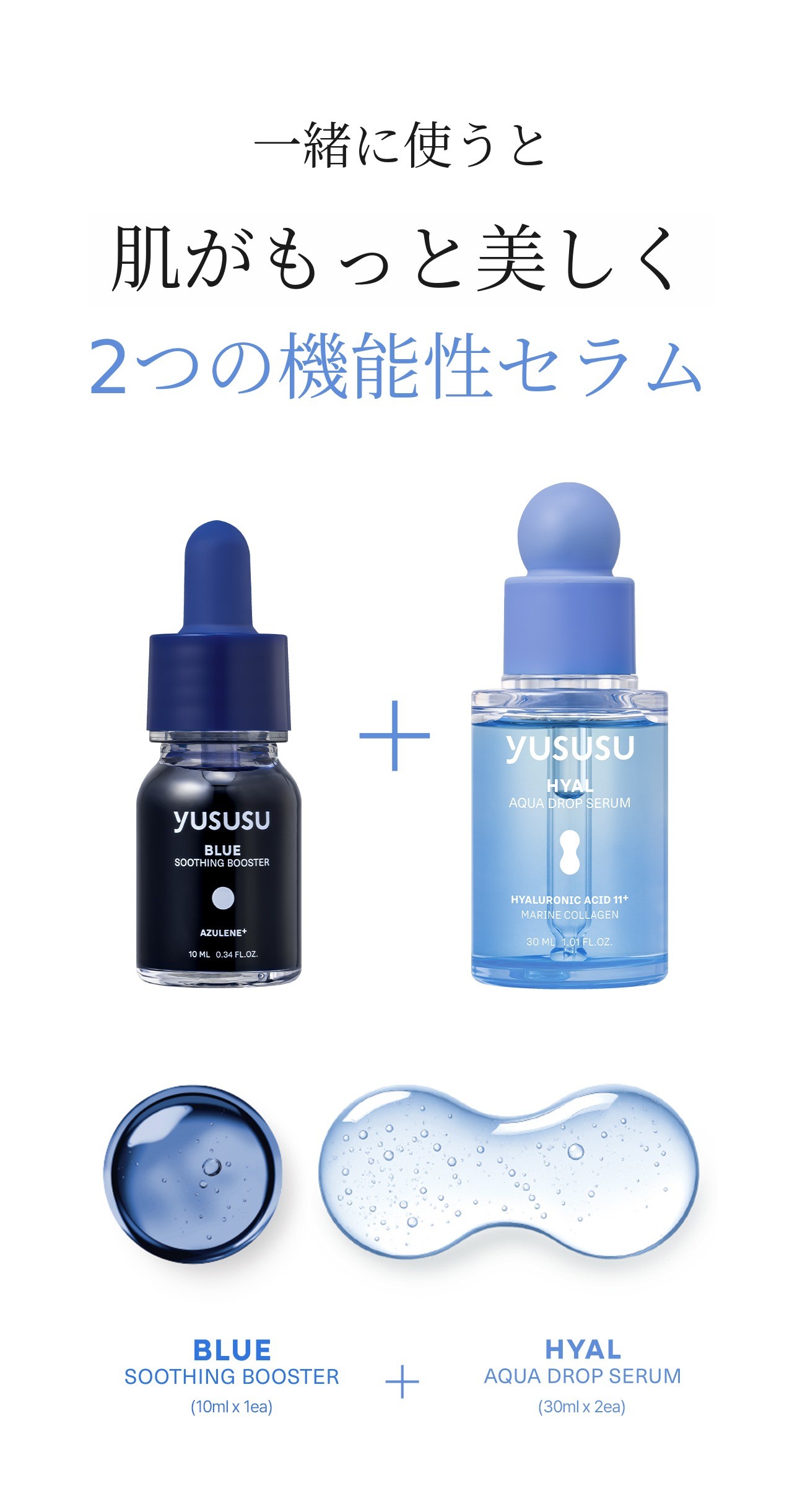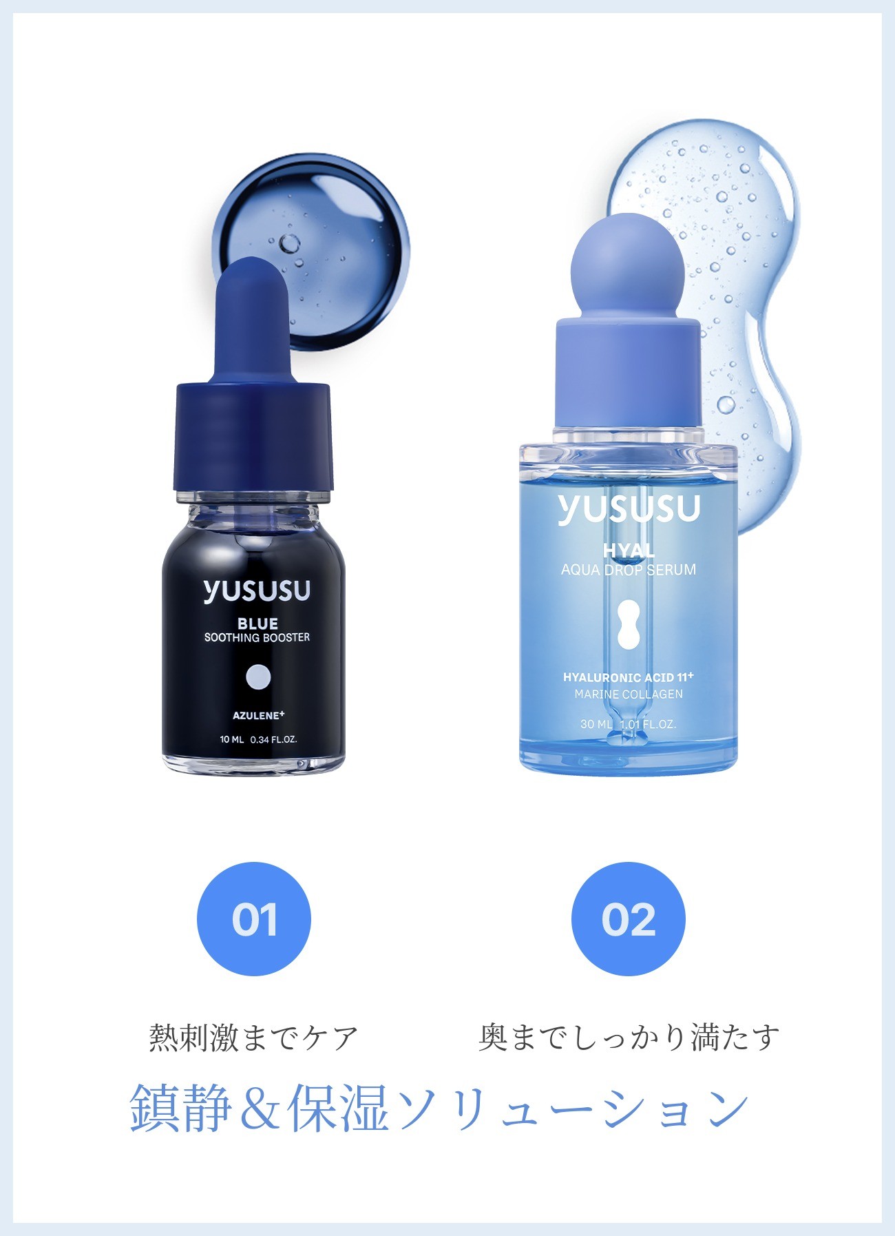 A.もちろんです! ただし、ユススは セラム 段階で ‘単独 使うだけで 鎮静 + 保湿 ルーティンが 完成’する 構造なので ため, あまり 多くの 製品を 重ねて 使わなくても大丈夫です。 また, 残りの ブルー スージング ブースターは 使用している クリーム 、マスクまたは パッドに 混ぜて 使用も 可能です 。(トラブル鎮静 機能を 強化する ことが 수 あります.)