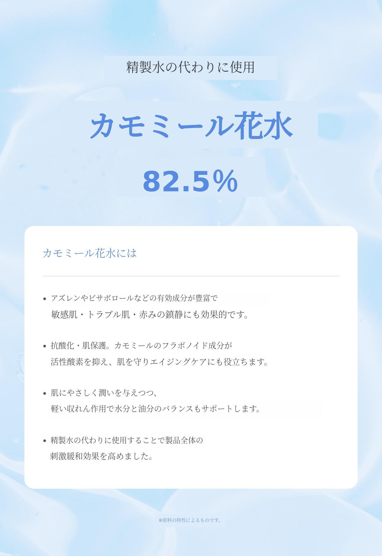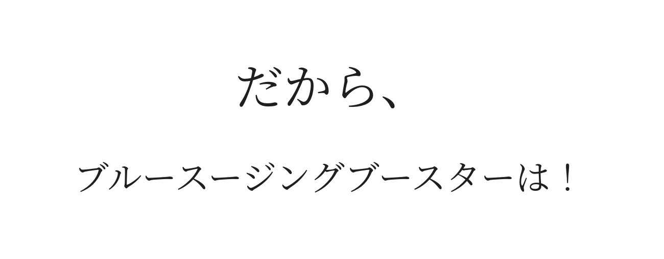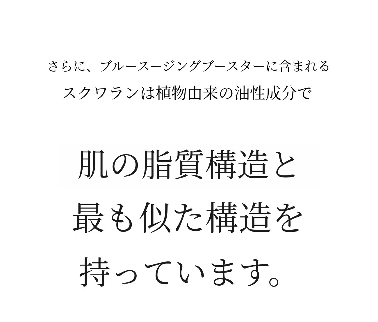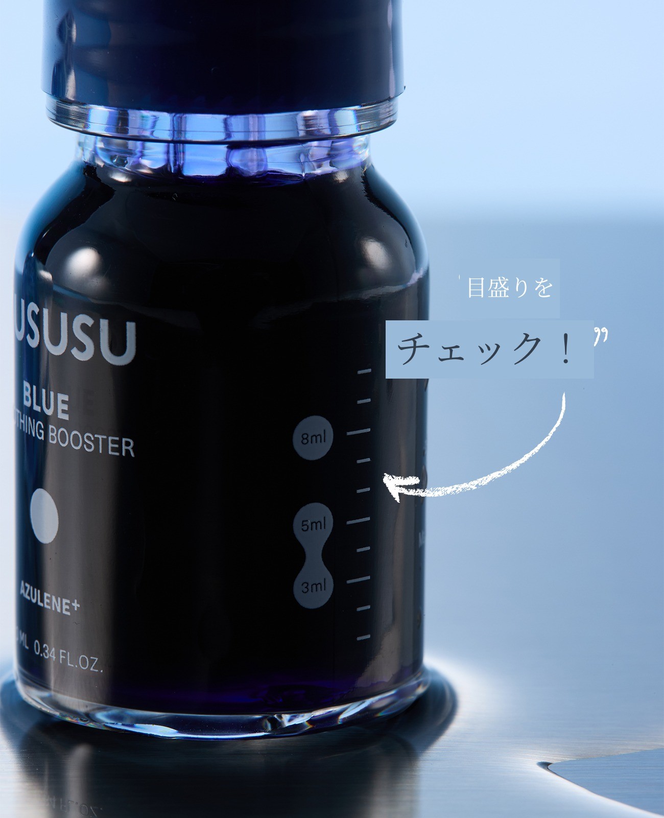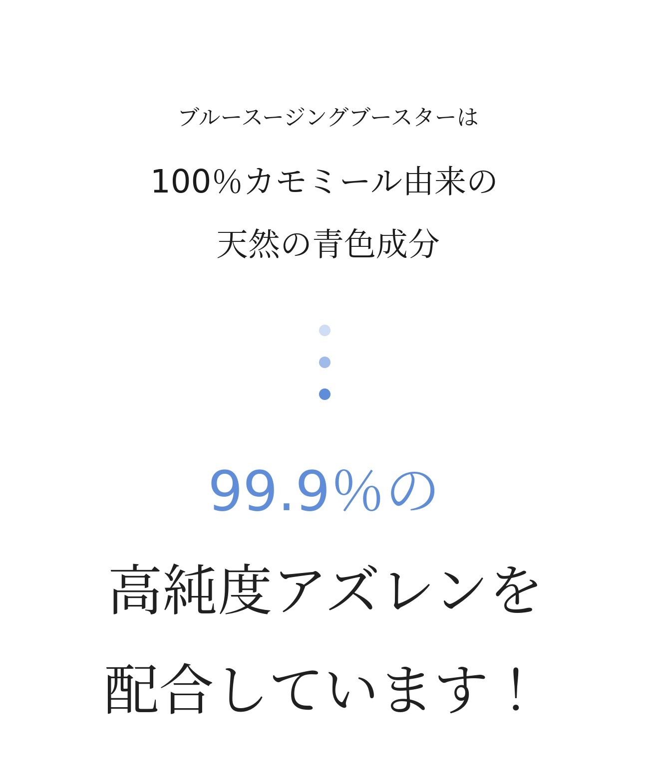 ブルースージングブースターはグアイアズレンを水溶性で安定化させた成分であるソジウムグアイアズレンスルホネート成分を活用し オイル成分に敏感な肌にもやさしく作用できるように改良しました。