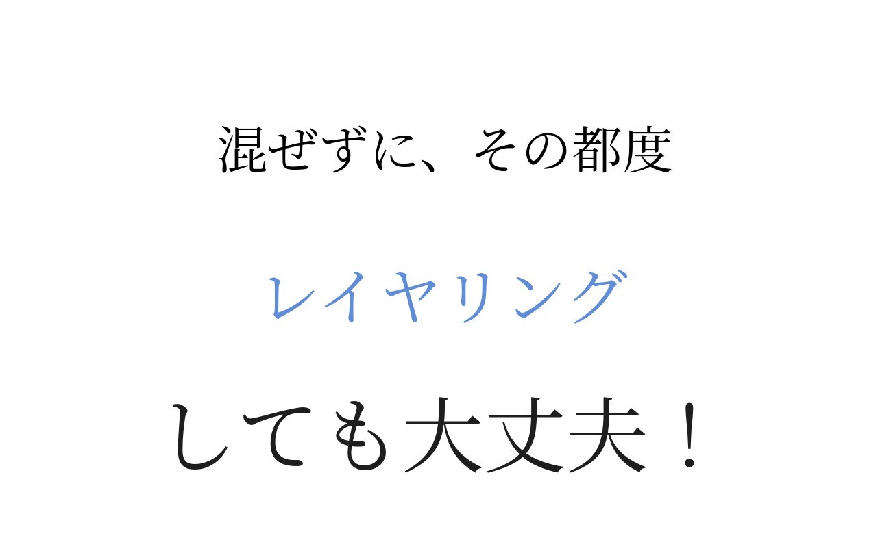 A. 製品の成分がよく混ざり効果的に吸収されるよう、容器の中であらかじめ混ぜて振って使うことをおすすめしますが、 その日の肌の状態に合わせて様々に組み合わせて使いたい方は、別々に顔に垂らしてレイヤリングしたり、手のひらや手の甲で混ぜて使っても大丈夫です。