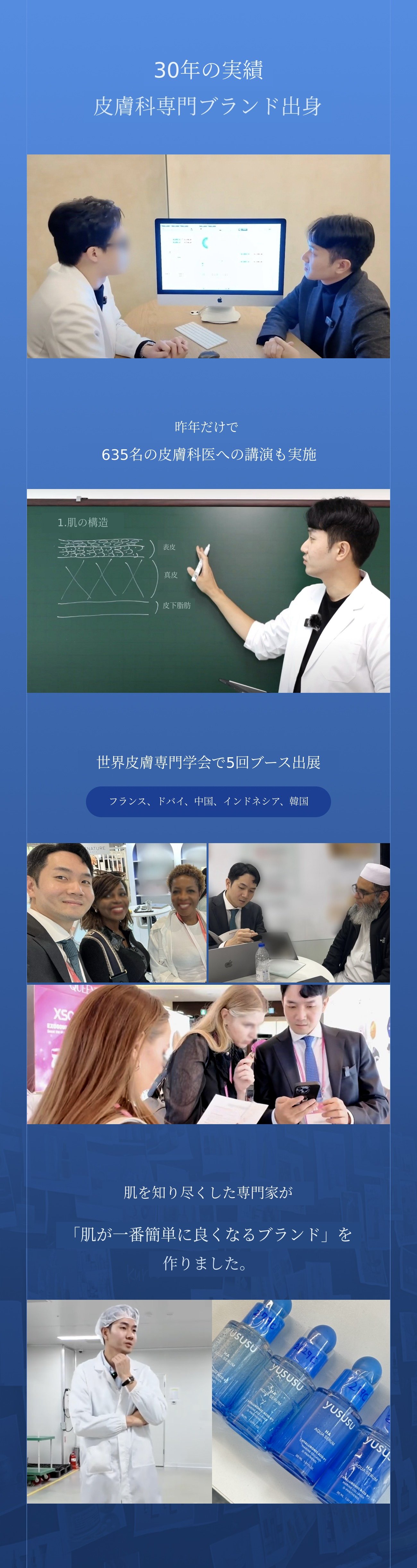 ユススは約30年間、国内数千の皮膚専門機関と世界20カ国以上の皮膚科に入店したブランドのノウハウとデータを基に誕生しました。