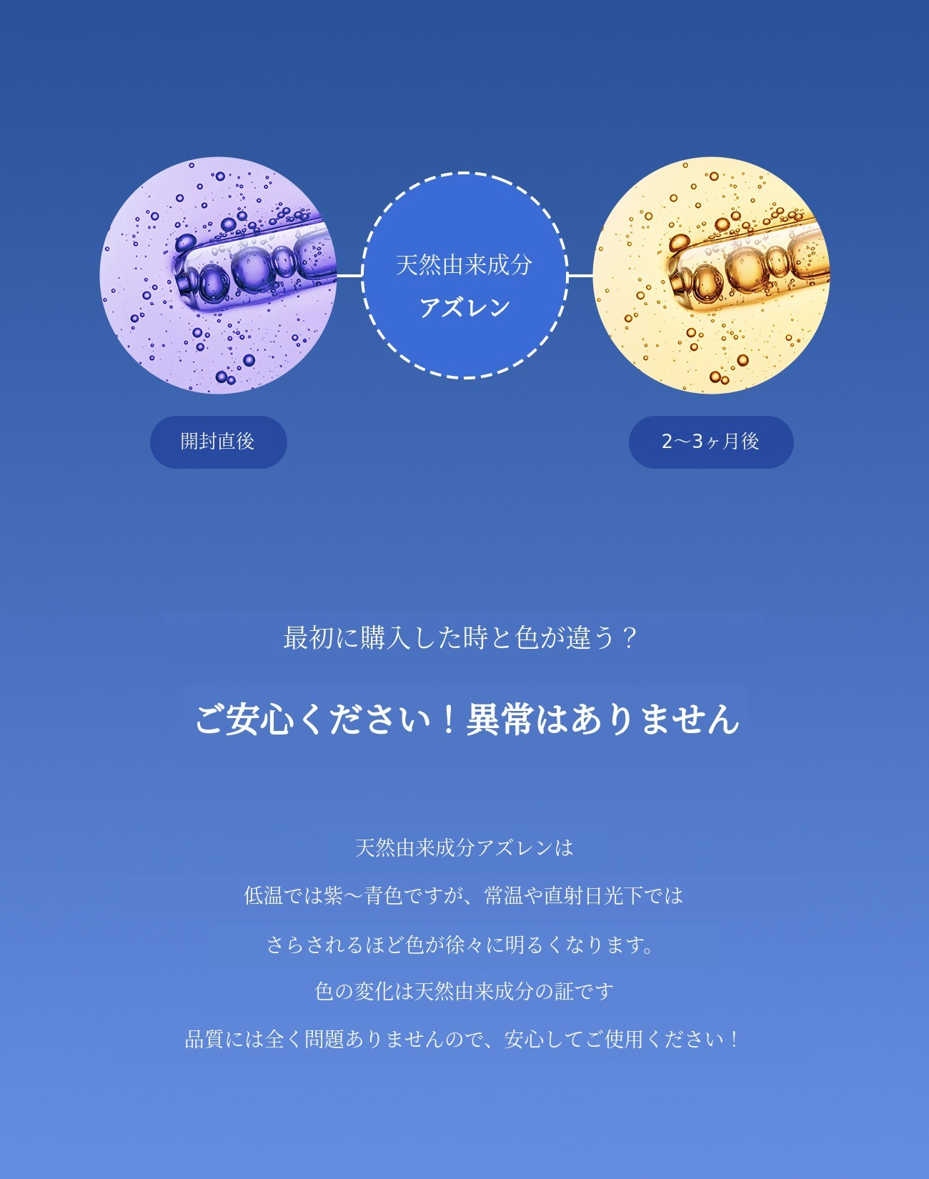 - 天然由来成分のアズレンは美しい青色をしていますが、光や熱にさらされると徐々に色が変わることがあります。色が変わるのは天然由来成分の自然な現象であり、製品には全く問題ありませんので安心してご使用ください。(高温や直射日光を避け、低温の化粧品用冷蔵庫や化粧品ボックス内で保管すると、天然アズレンの青色を長く保つことができます。)