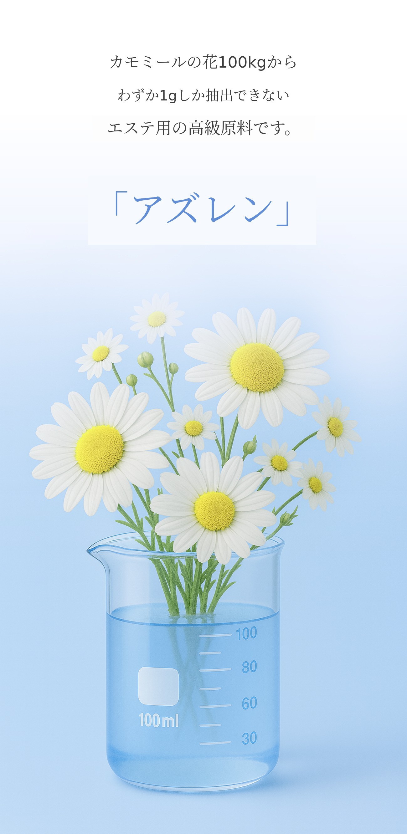 皮膚科やチョンダムエステティックサロンでトラブル肌の方や施術後に刺激を受けた方に処方される成分がまさに この天然カモミールから抽出した高純度グアイアズレンです。