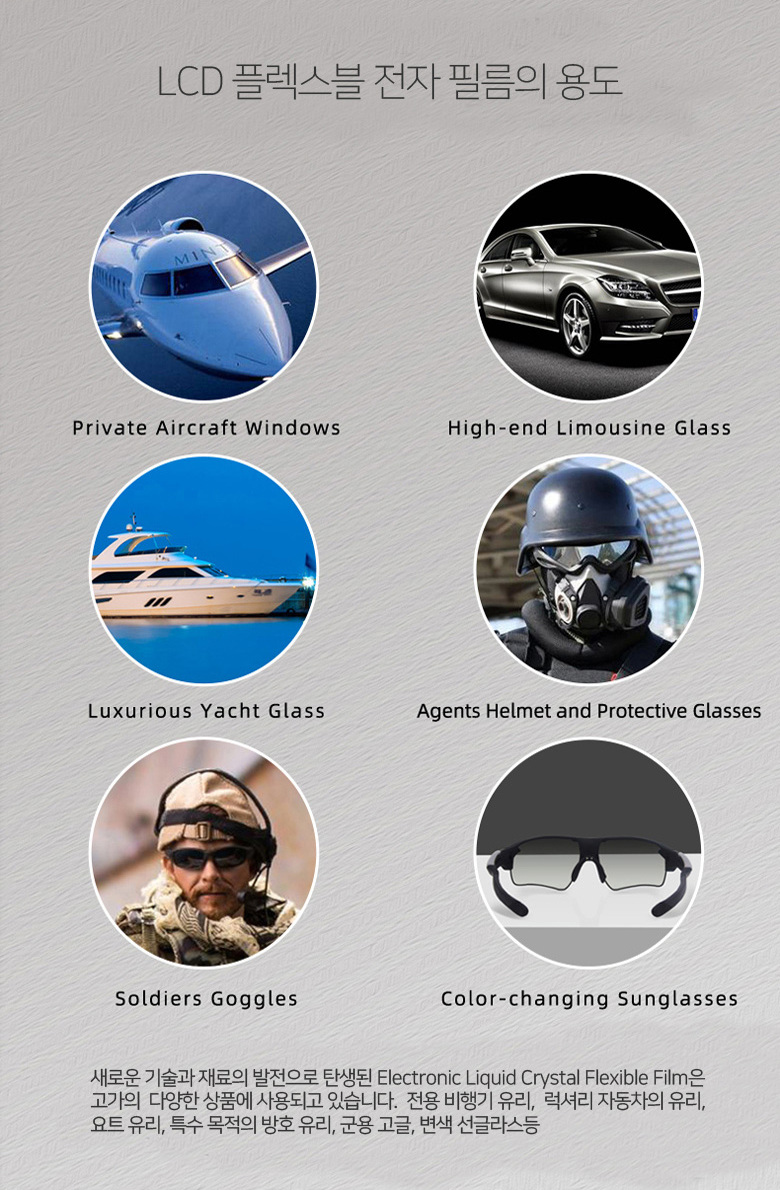 전류를 통해 렌즈의 투명도를 0.1초만에 즉시 조절할 수 있는 최첨단 소재입니다.