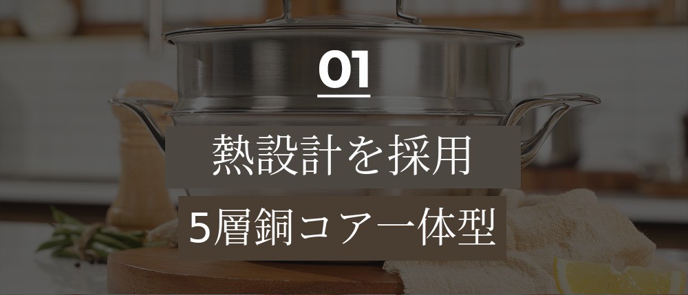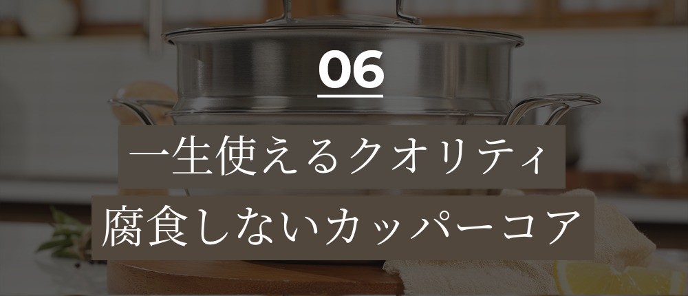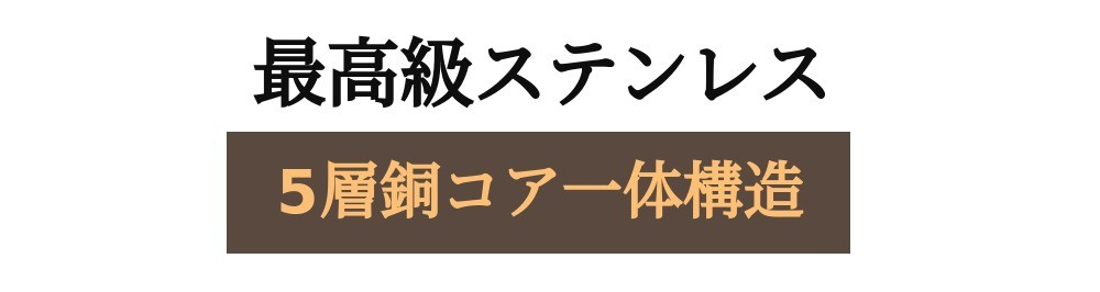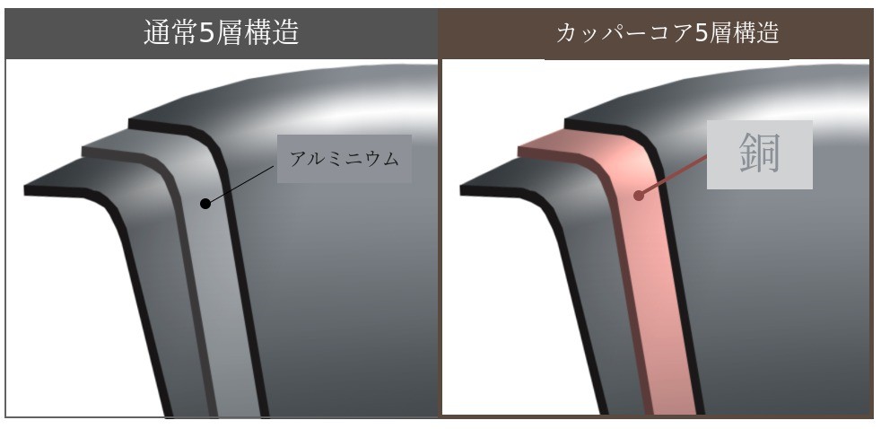 一般的なステンレスとは異なり、ステンレスとアルミニウムの間に「銅素材」がクラッドされていることを意味します。カッパーコアはステンレスの間に銅をクラッドして、