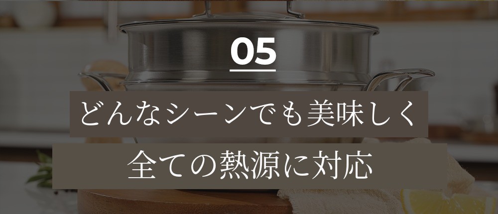 はるかに優れた熱伝導率と熱効率が最大の強みであり、重厚な使用感と手入れのしやすさ、頑丈な耐久性をすべて兼ね備えているため、ステンレス愛好家が必ず一つは持っている素材です。です。